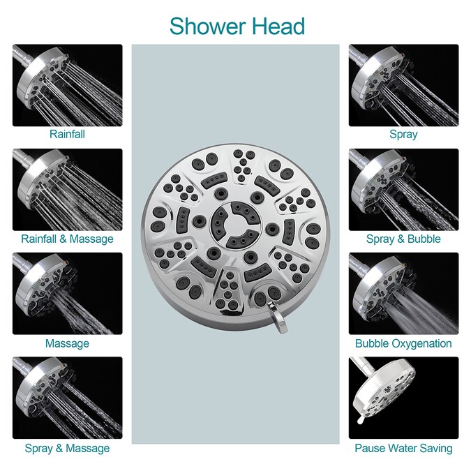 This premium 8-setting dual shower head features a variety of invigorating water settings, including a Bubble, Massage, Mist, Standard, Rain Massage, Mixed Massage, and Spray mode. It also comes with a 2-way water diverter, adjustable overhead bracket, and 59-inch stainless steel hose. This shower system is designed and manufactured to provide you with a comfortable and relaxing shower experience.