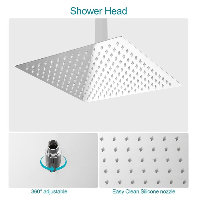 - The 12-inch rain shower head crafted from 304 stainless steel is leak-proof, rust-proof and provides long-lasting, corrosion-resistant performance