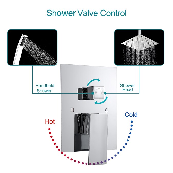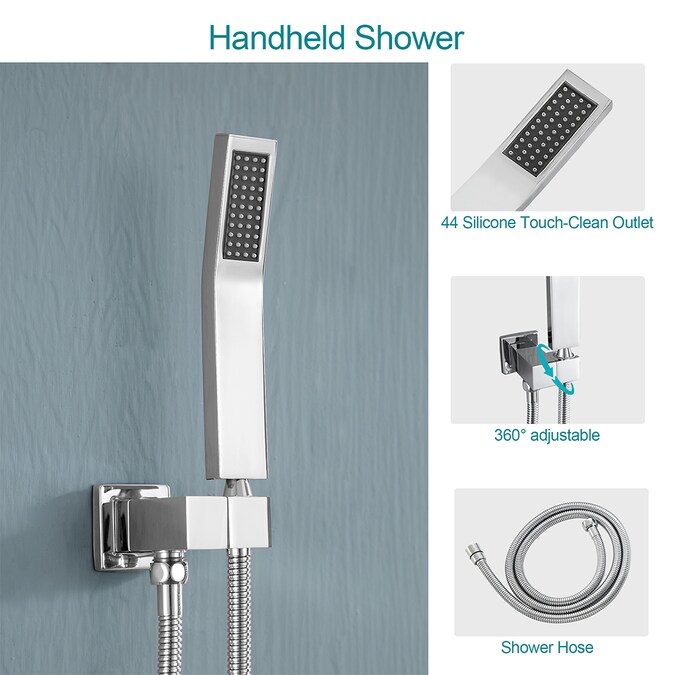 - Main package includes: 12-inch square rain shower head, 8-inch hand-held shower head, 12-inch ceiling-mounted shower arm (not including wall-mounted shower arm), 59-inch stainless steel shower hose, control valve body embedded box and other parts for installation, installation manual