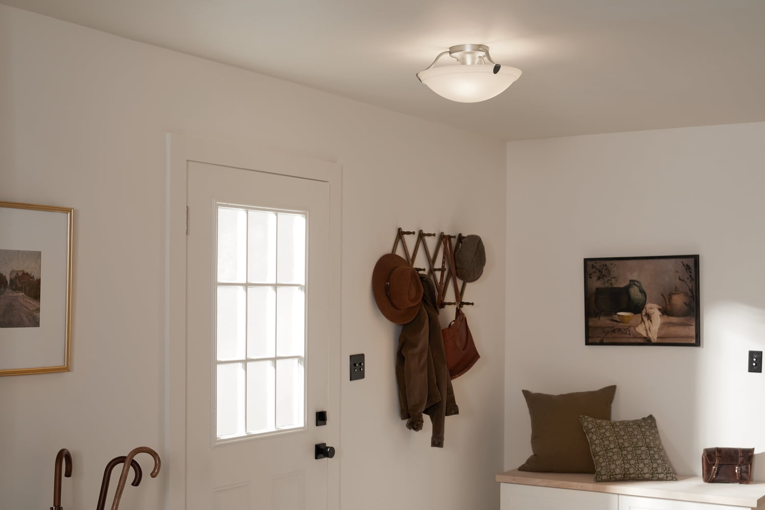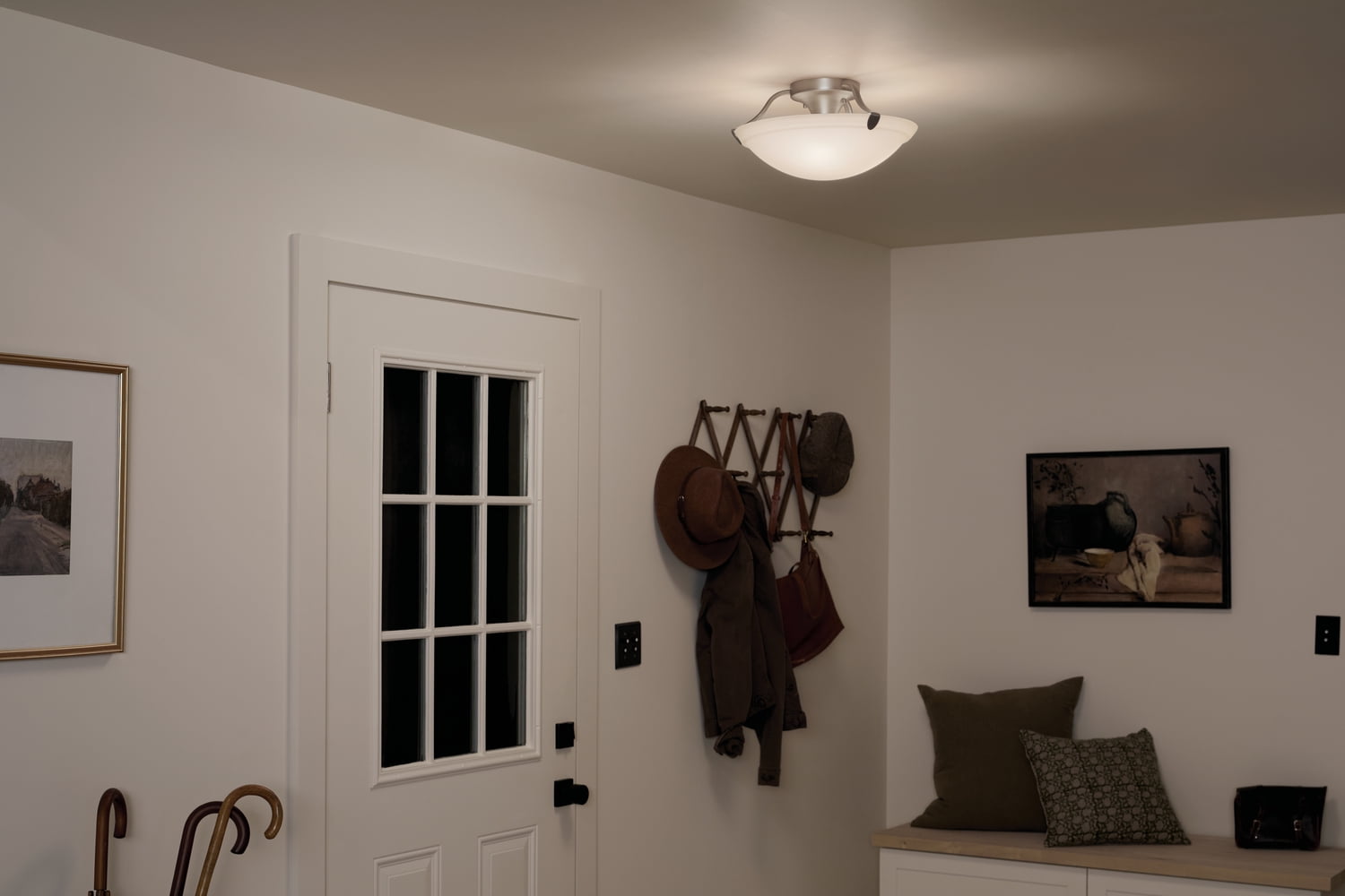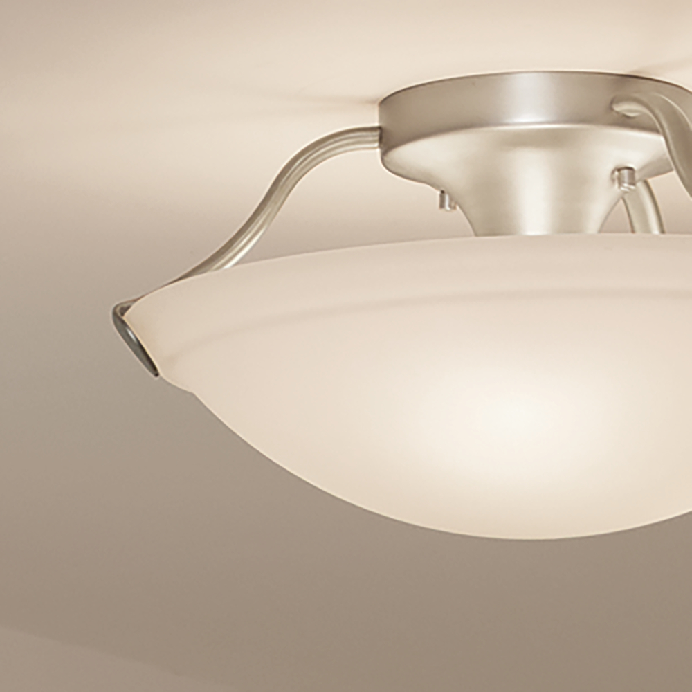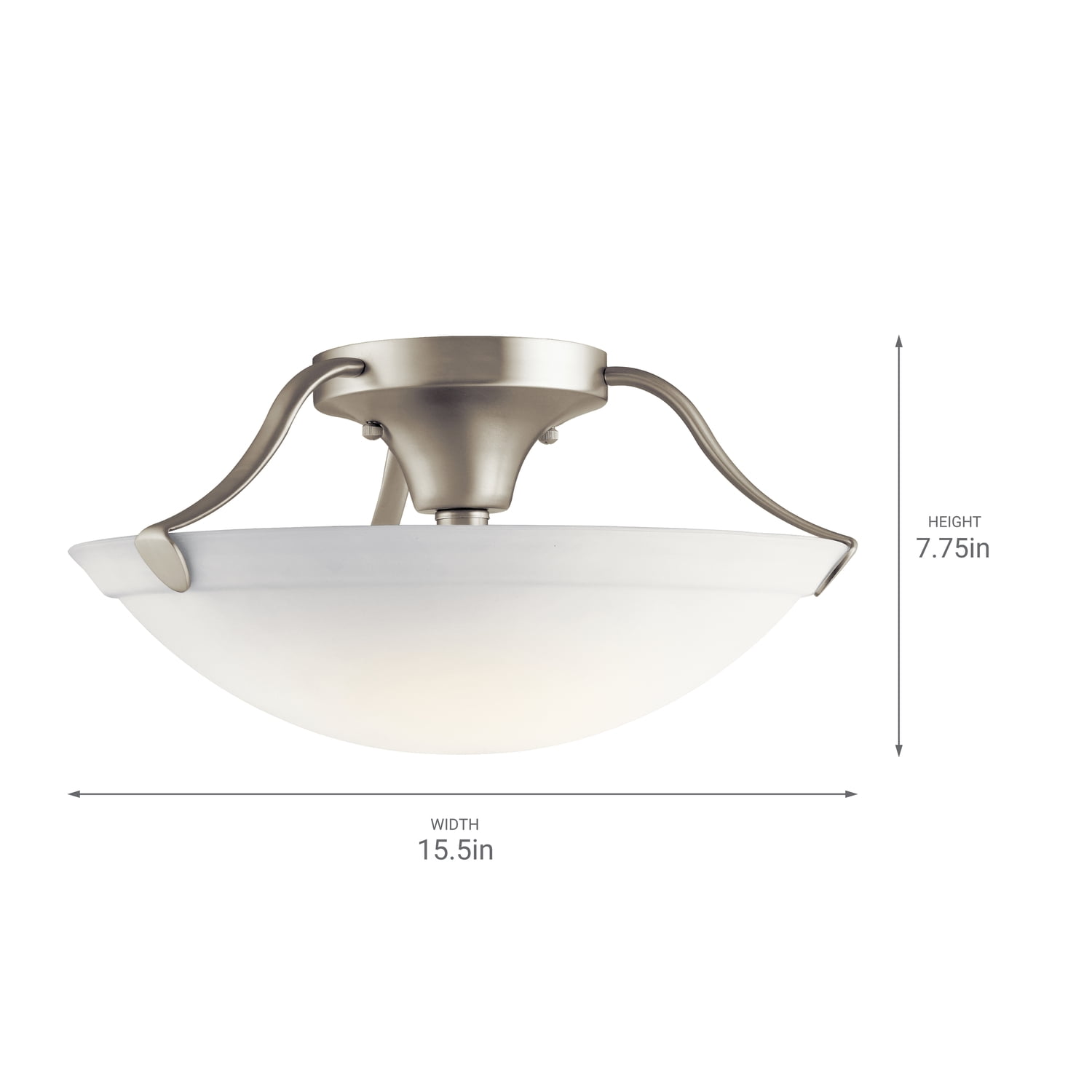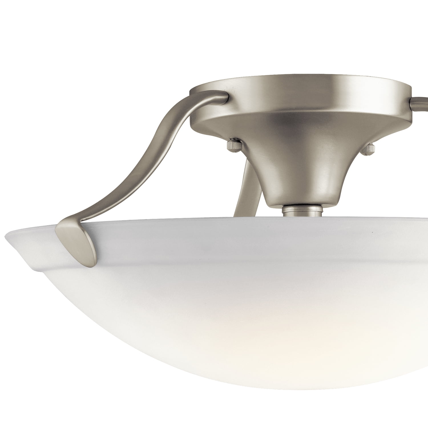 Upgrade your space with the Kichler 15.5 in. 3-Light Brushed Nickel Semi-Flush Light. It features an elegant design that blends well with a wide range of decor. The gently curved Brushed Nickel arms embracewhite etched glass shade of this semi-flush light provides soft light diffusion to brighten up your room. It is made of steel for enhanced strength and durability.