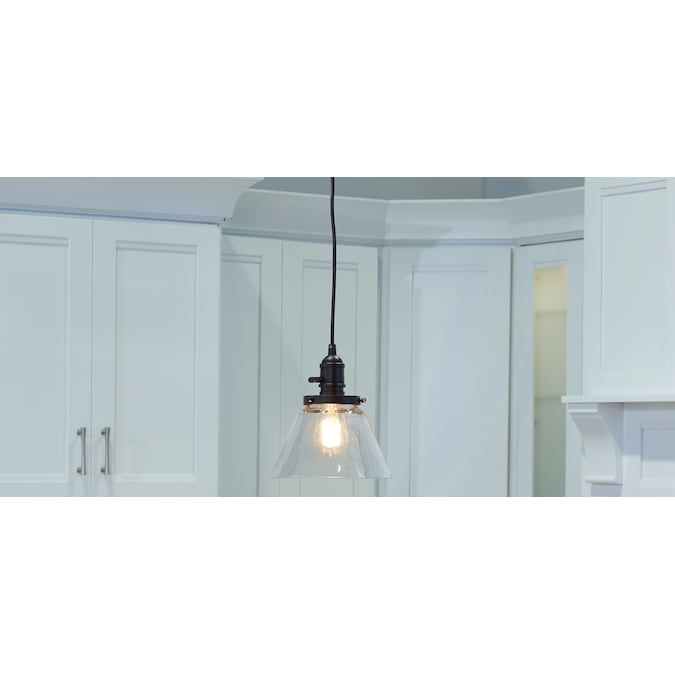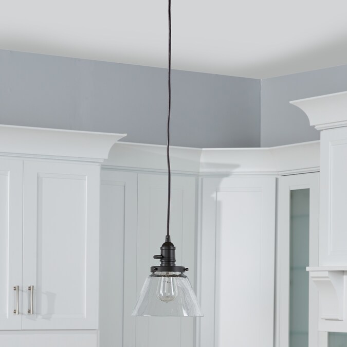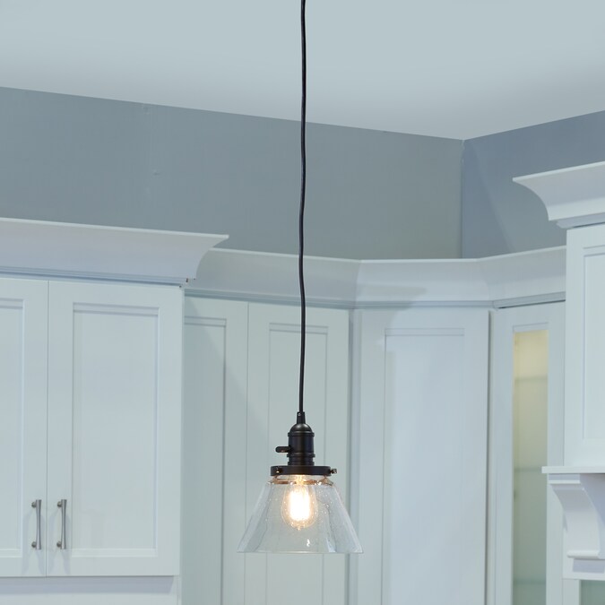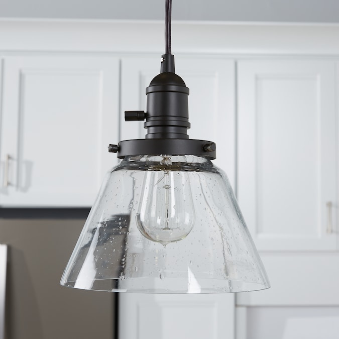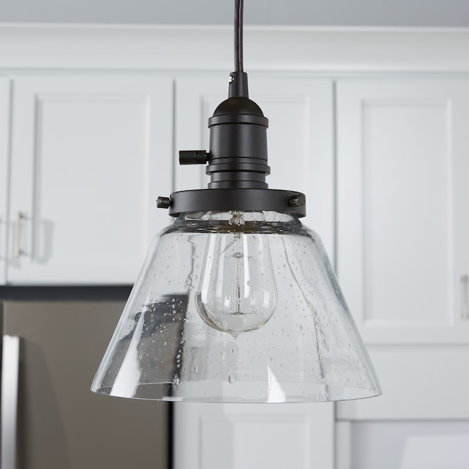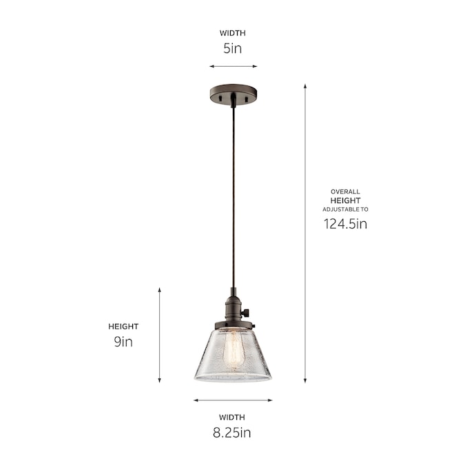 The 1 light Avery cone mini pendant in Olde Bronze® finish and clear seeded glass uses a 100 watt (max.) bulb equivalent, measures 8.25″ in width with a body height of 8.75″. It has adjustable cording and a working paddle toggle to turn it on/off if you wish. Cleaning instructions: Turn off electric current before cleaning. Clean metal components with a soft cloth moistened with a mild liquid soap solution. Wipe clean and buff with a very soft dry cloth. Under no circumstances should any metal polish be used, as it is abrasive nature could damage the protective finish placed on the metal parts. Never wash glass shades in an automatic dishwasher. Instead, line a sink with a towel and fill with warm water and mild liquid soap. Wash glass with a soft cloth, rinse and wipe dry. Complete the look by adding coordinating pieces such as the Avery Semi Flush Olde Bronze® (42296OZ). Vintage filament bulb (4071CLR).