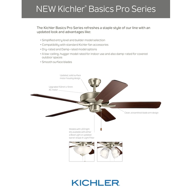 Featuring barrel-shaped shades, LED bulbs and Brushed Nickel finish, the Basics Pro Premier ceiling fan has a 52-inch fan blade span and is reversible for optimal comfort during all seasons. Its traditional style makes the perfect addition to any home.