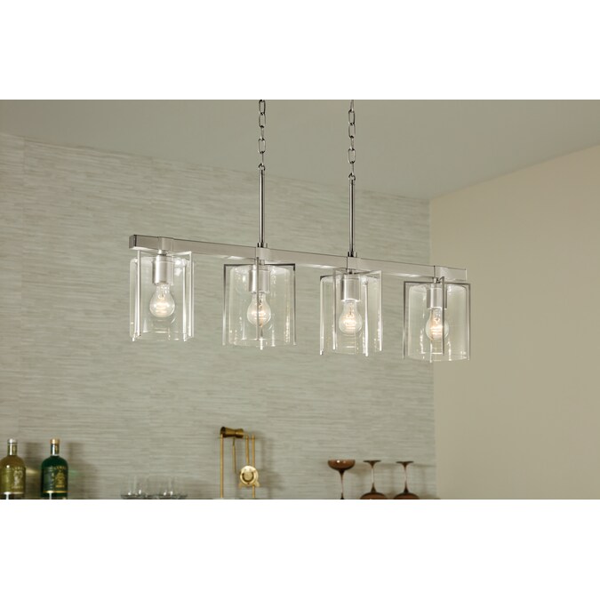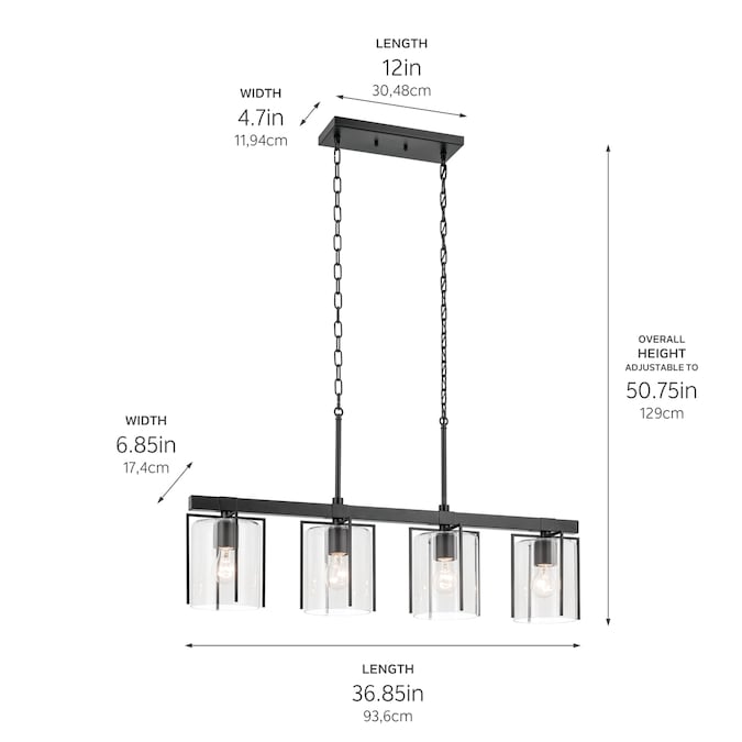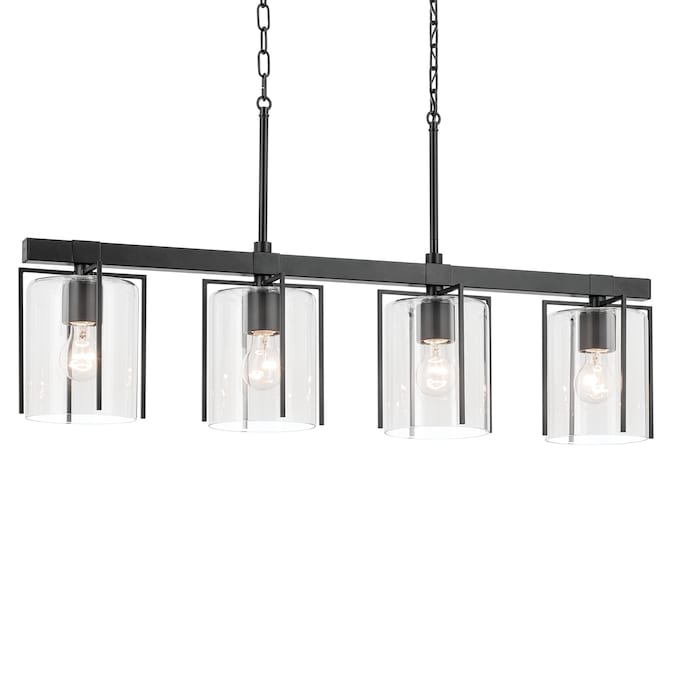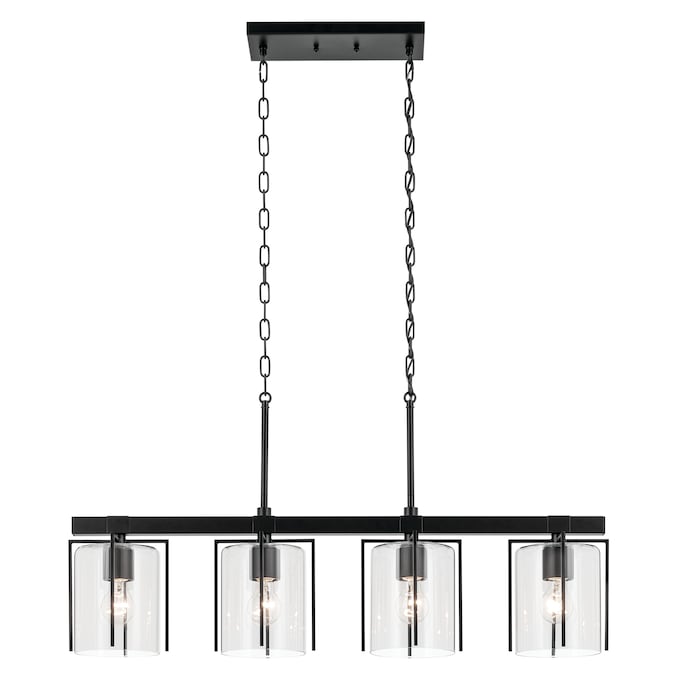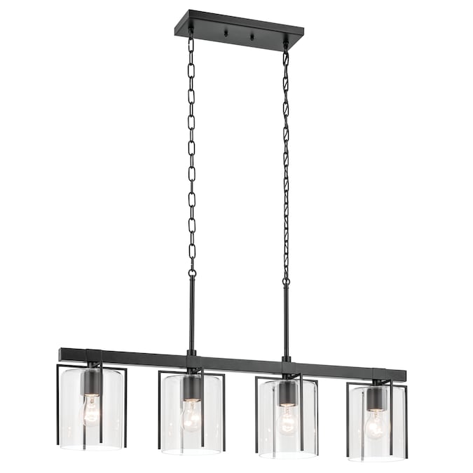 The Birk 4 light linear chandelier combines clean lines and a striking black finish to complement a variety of interior styles. Black metal arms frame the clear glass shades to create the perfect combination of form and function. Modern and welcoming, it is ideal for a dining room or kitchen island.