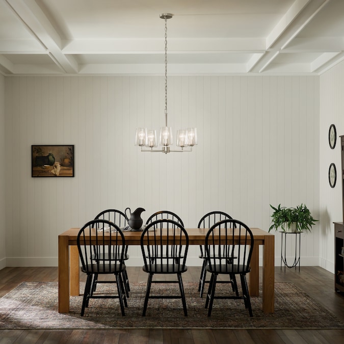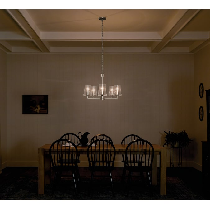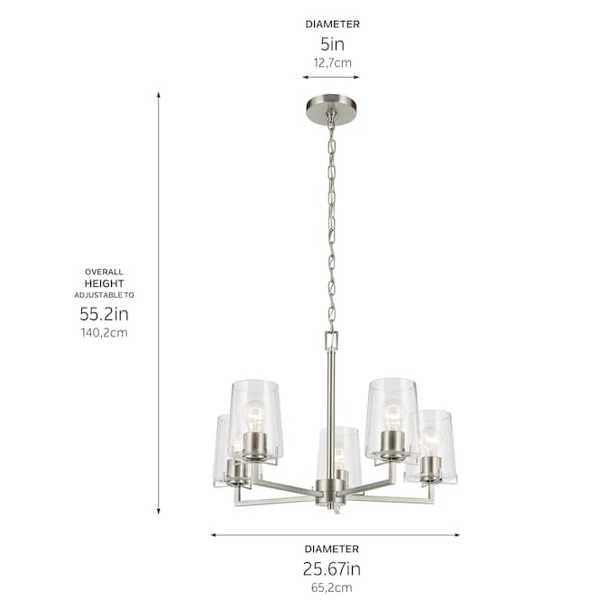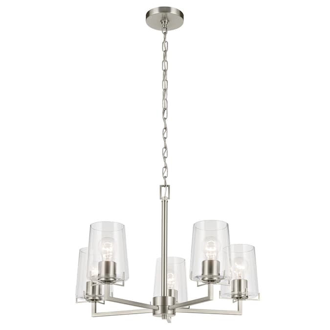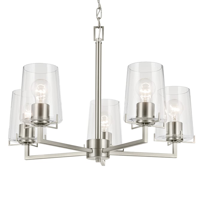 With a dramatic brushed nickel finish and clear glass shades, the Birk 5 light chandelier is the perfect blend of elegance and charm. Offering a cozy and welcoming ambiance, it can serve as an eye-catching centerpiece in a dining room, foyer, or bedroom.