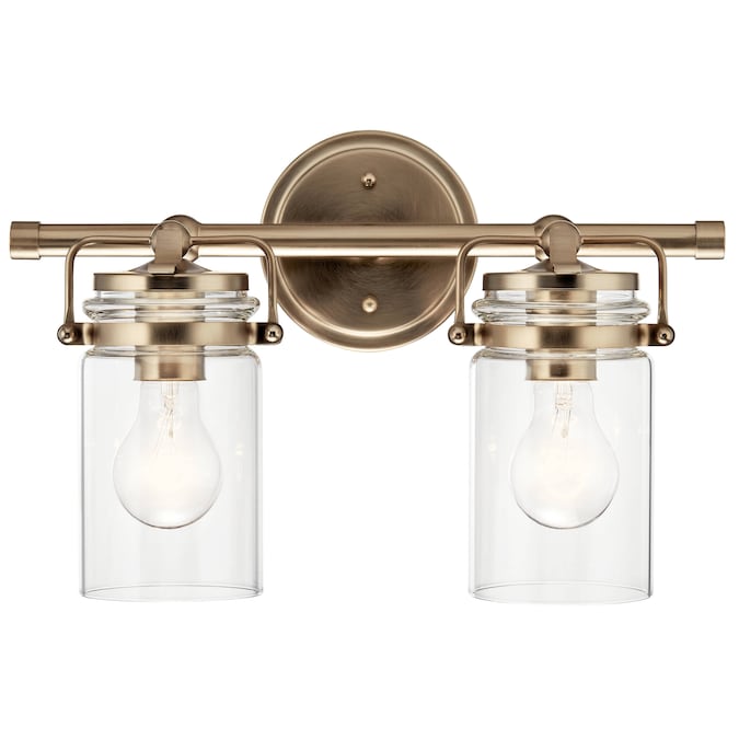 Brinley 15.75-inch 2 light vanity light features a vintage look with its Champagne Bronze finish and clear glass. Inspired by mason jars, the Brinley vanity light is perfect in several aesthetic environments, including vintage and transitional.