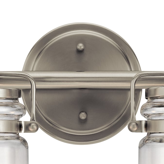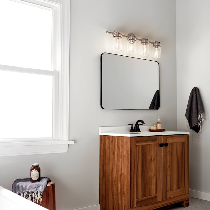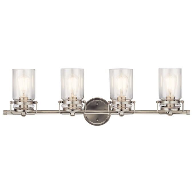 Brinley™ 32.25-in 4 light vanity light features a modern vintage look with its Brushed Nickel finish and clear glass. Inspired by mason jars, the Brinley vanity light is perfect in several aesthetic environments, including modern vintage and transitional.Warranty is one (1) year from the date of purchase. Cleaning instructions: Be certain the electric current is turned off before cleaning. Clean metal components with a soft cloth moistened with a mild liquid soap solution. Wipe clean and buff with a very soft dry cloth. Under no circumstances should any metal polish be used, as its abrasive nature could damage the protective finish placed on the metal parts. Never wash glass shades in an automatic dishwasher. Instead, line a sink with a towel and fill with warm water and mild liquid soap. Wash glass with a soft cloth, rinse and wipe dry.