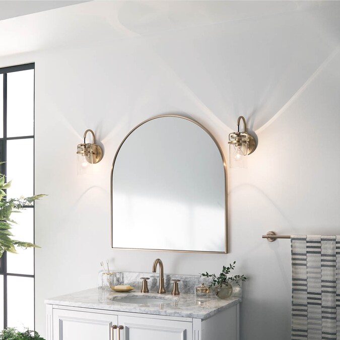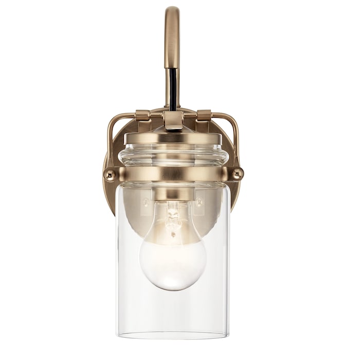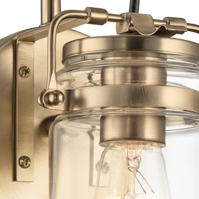 Brinley 5-inch 1 light wall sconce features a vintage look with its Champagne Bronze finish and clear glass. Inspired by mason jars, the Brinley Wall Sconce works in several aesthetic environments, including vintage and transitional.