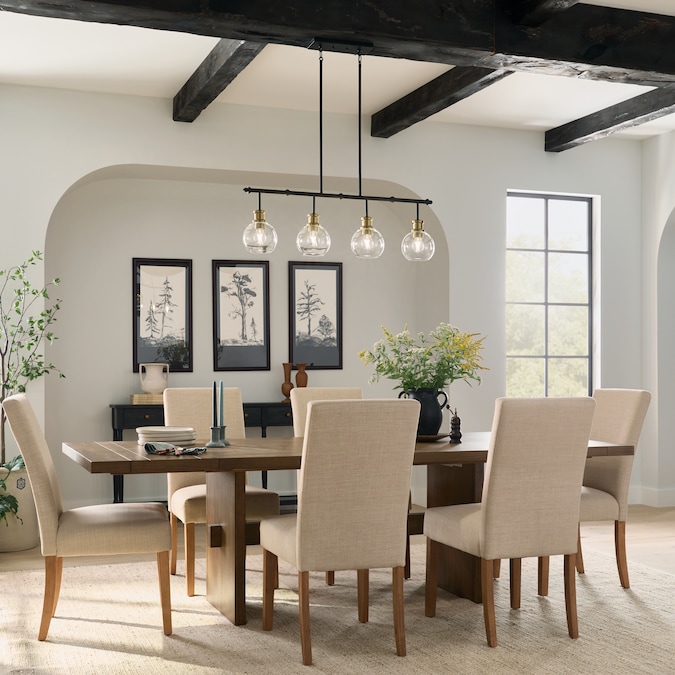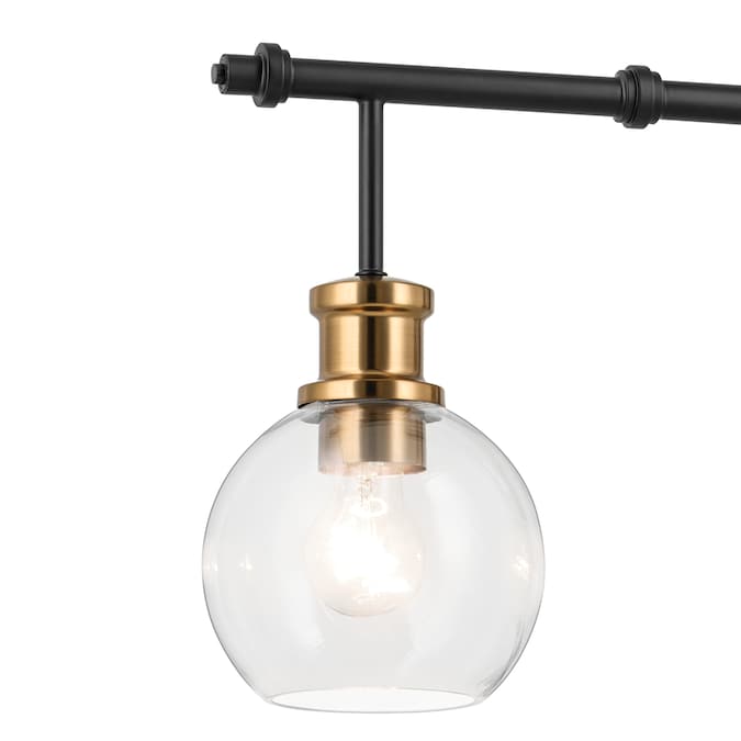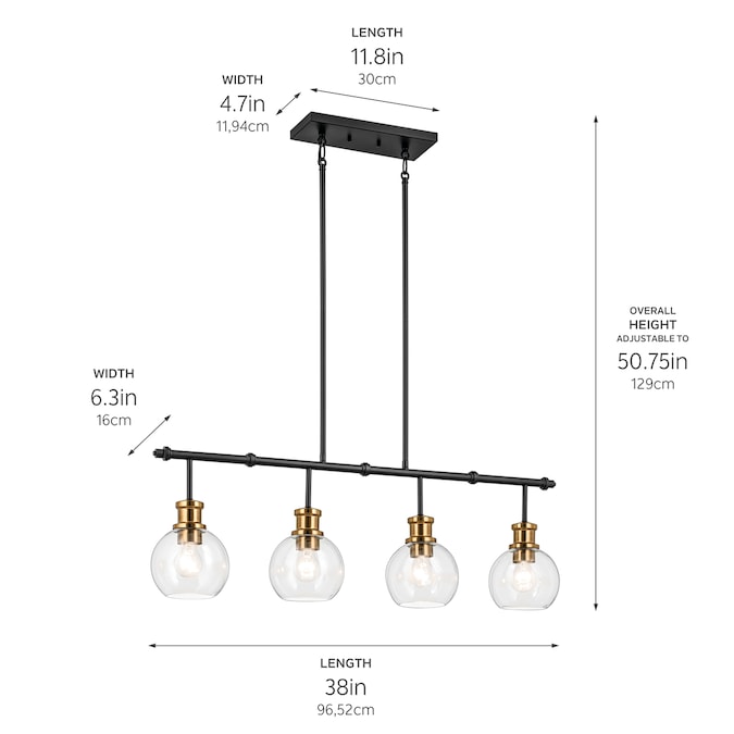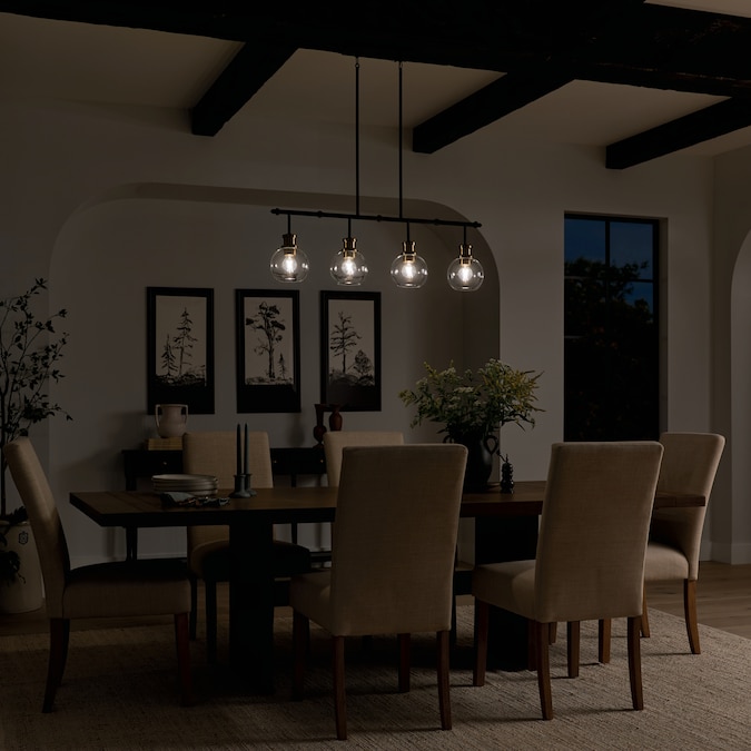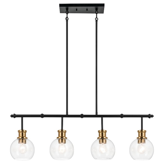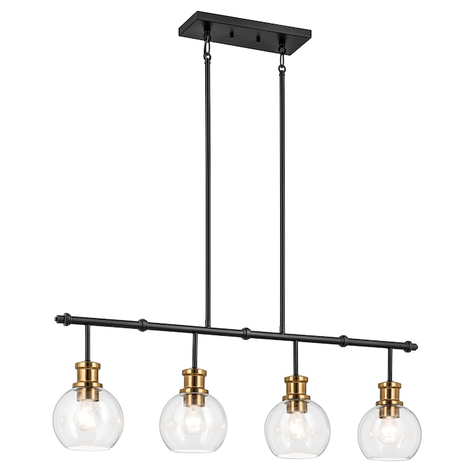 The Clove 4 light linear chandelier in black and brushed natural brass finishes blends vintage-inspired elegance with refined sophistication. The clear glass shades combined with the brushed natural brass accents create a stunning and versatile option for a dining room table or island.