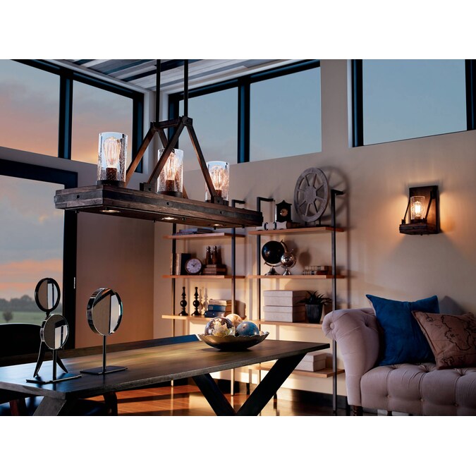 The Colerne™ 14.75″ 1 light wall sconce features rustic style with its auburn stained™ wood and distressed metal accents in black finish and clear seeded glass. It features a downlight and 3 way switch. The Colerne wall sconce works in several aesthetic environments, including transitional, lodge and country. Cleaning instructions: turn off electric current before cleaning. Clean metal components with a soft cloth moistened with a mild liquid soap solution. Wipe clean and buff with a very soft dry cot. Under no circumstances should any metal polish be used, as it is abrasive nature could damage the protective finish placed on the metal parts. Never wash glass shades in an automatic dishwasher. Instead, line a sink with a towel and fill with warm water and mild liquid soap. Wash glass with a soft cloth, rinse and wipe dry.