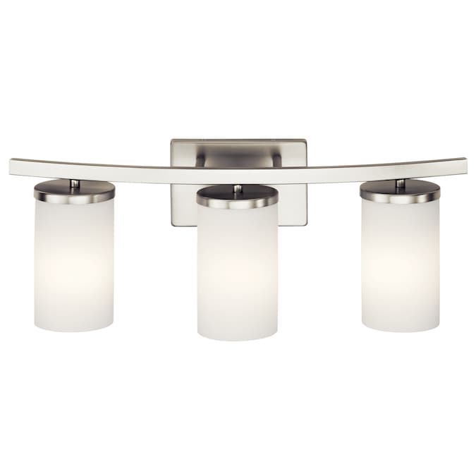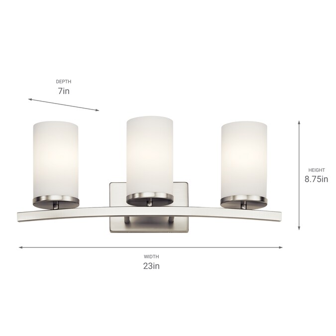 The 3 light Crosby vanity light in Brushed Nickel finish and satin etched cased opal glass uses 100 watt (max.) bulb equivalent. It measures 23″ in width and has a body height of 8.75″. The ultimate in versatile style, it can be installed with the glass up or down. Cleaning instructions: Turn off electric current before cleaning. Clean metal components with a soft cloth moistened with a mild liquid soap solution. Wipe clean and buff with a very soft dry cloth. Under no circumstances should any metal polish be used, as it is abrasive nature could damage the protective finish placed on the metal parts. Never wash glass shades in an automatic dishwasher. Instead, line a sink with a towel and fill with warm water and mild liquid soap. Wash glass with a soft cloth, rinse and wipe dry. Complete the look by adding coordinating pieces in the Crosby collection.