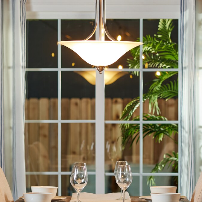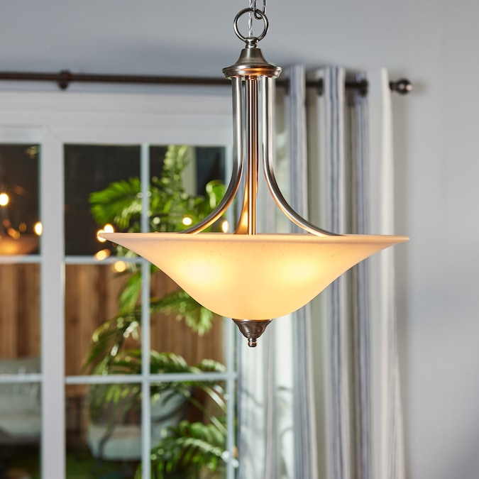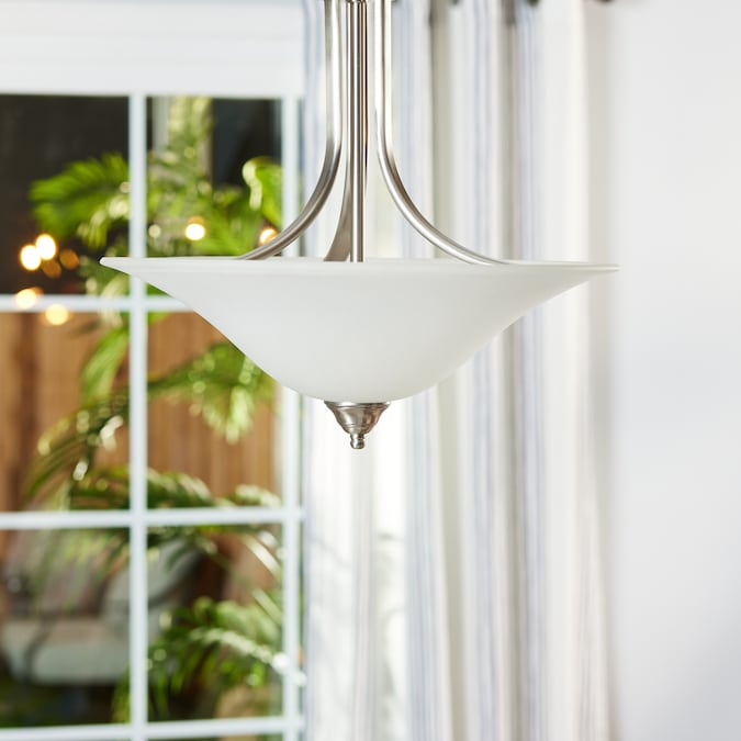 The Dover™ 19-in 3 light convertible pendant or semi flush features a transitional look with gentle curves in Brushed Nickel finish and etched seeded glass. The Dover convertible pendant or semi flush is perfect in several aesthetic environments including transitional and traditional. Warranty is one (1) year from the date of purchase. Cleaning instructions: Be certain the electric current is turned off before cleaning. Clean metal components with a soft cloth moistened with a mild liquid soap solution. Wipe clean and buff with a very soft dry cloth. Under no circumstances should any metal polish be used, as its abrasive nature could damage the protective finish placed on the metal parts. Never wash glass shades in an automatic dishwasher. Instead, line a sink with a towel and fill with warm water and mild liquid soap. Wash glass with a soft cloth, rinse and wipe dry.