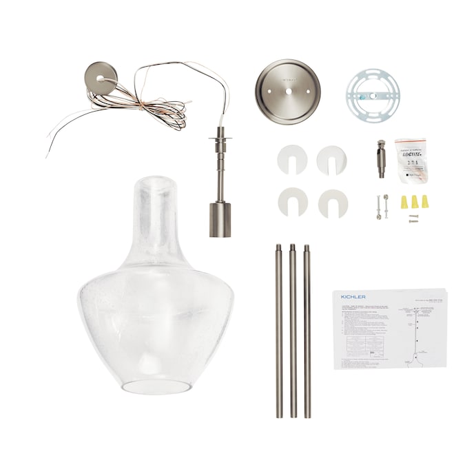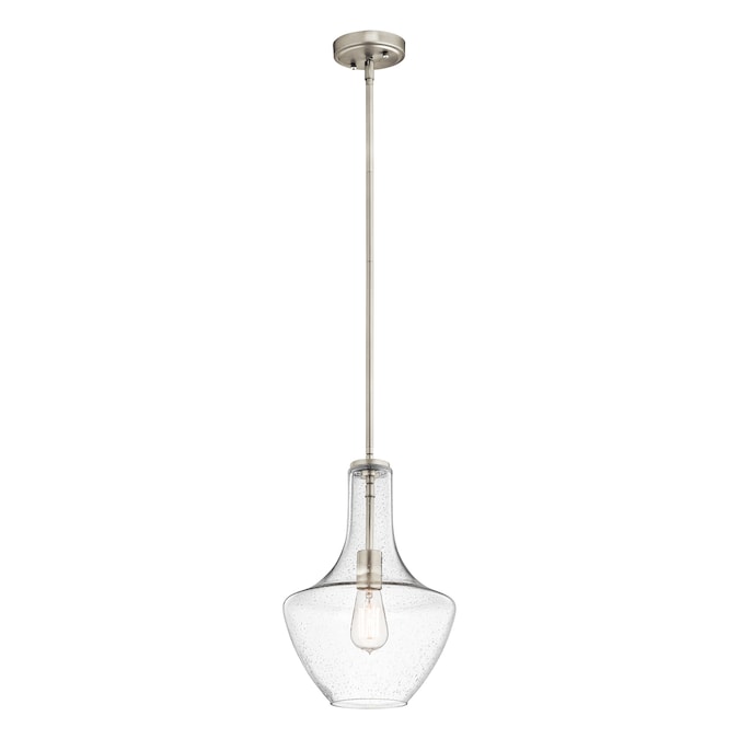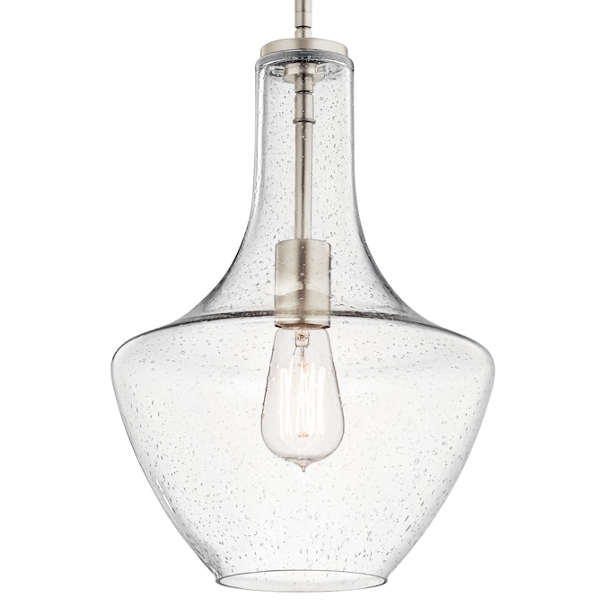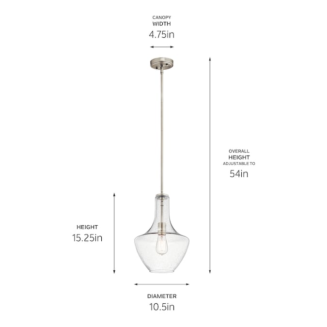 The Everly™ 15.25-inch one light bell shaped pendant comes with a curved, glass blown container featuring clear, seeded glass and a brushed nickel finish for a simple and elegant look. The Everly’s versatile design coordinates with a variety of styles and can be used singularly, in multiples or arranged at varying heights to elevate the room. Customizable length and height that can be adjusted based on the installation area. Turn off the fixture. Remove shade if possible. Wipe down the glass and all metal with a lint-free cloth. Avoid abrasive materials, cleaners or products with ammonia or alcohol as well as general-purpose household window or glass cleaners, which could damage the coating on the fixture.
