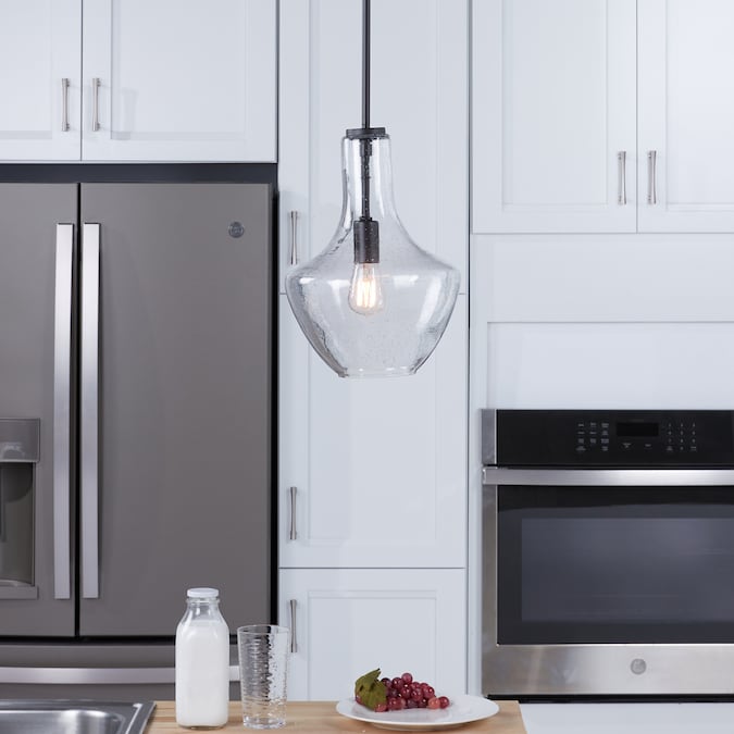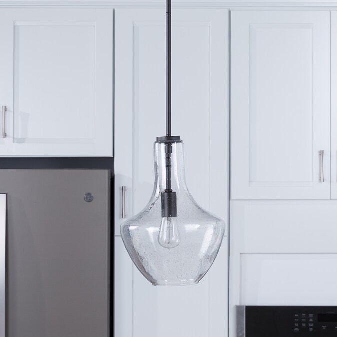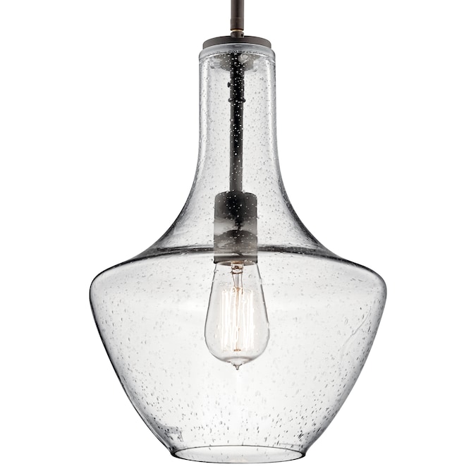 The design of this 1 light pendant from Everly collection is based on decorative blown glass containers. It features clear seedy glass and is made memorable with the use of vintage squirrel cage filament lamps. Contemporary or traditional, this pendant can be used singularly or in multiples to elevate every room.
