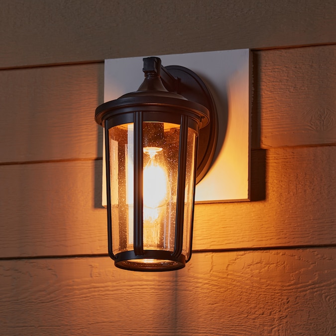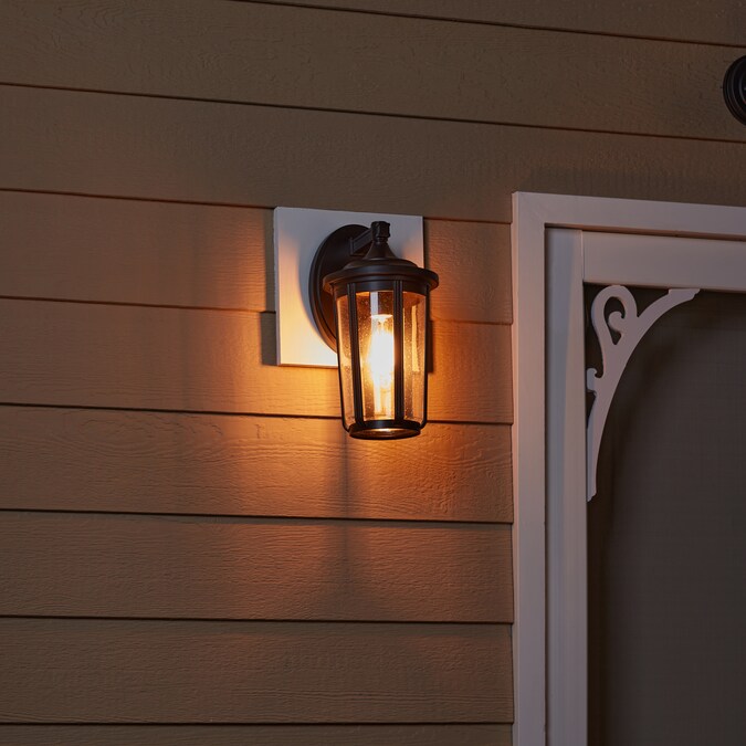 • Directed downward, this outdoor wall light provides ambient lighting with the use of clear seeded glass