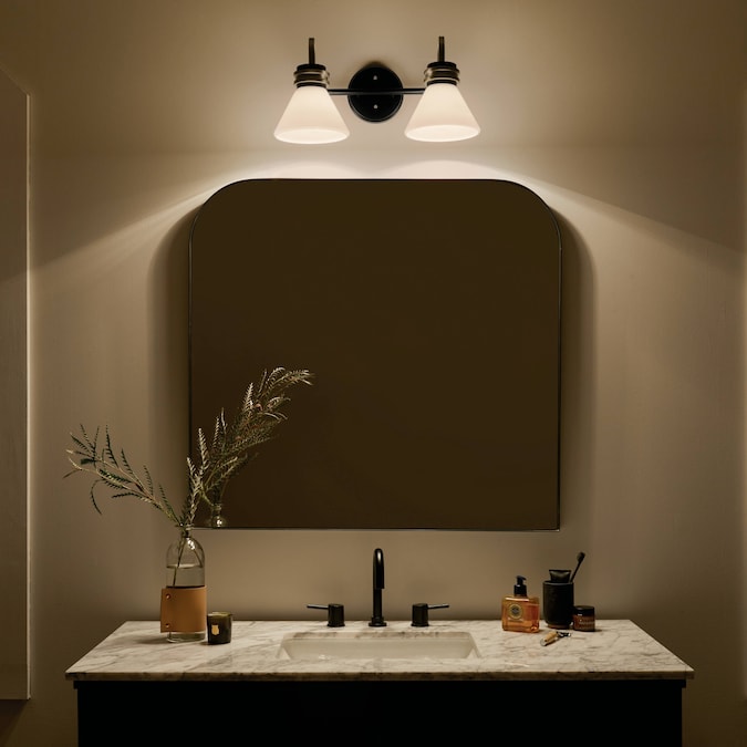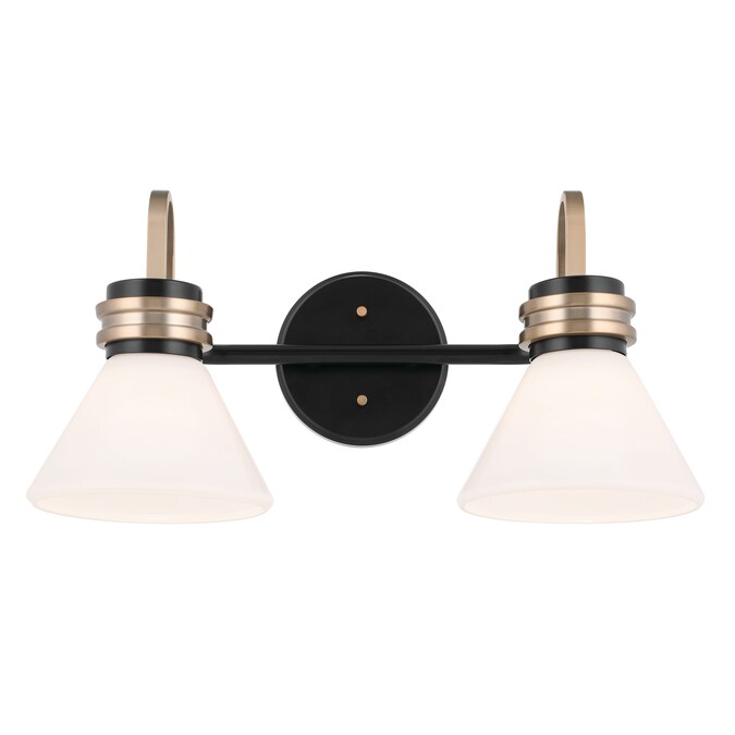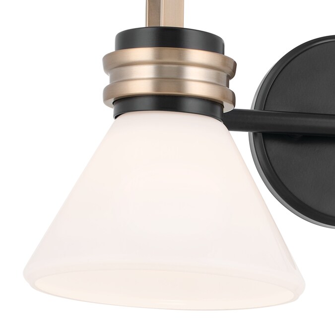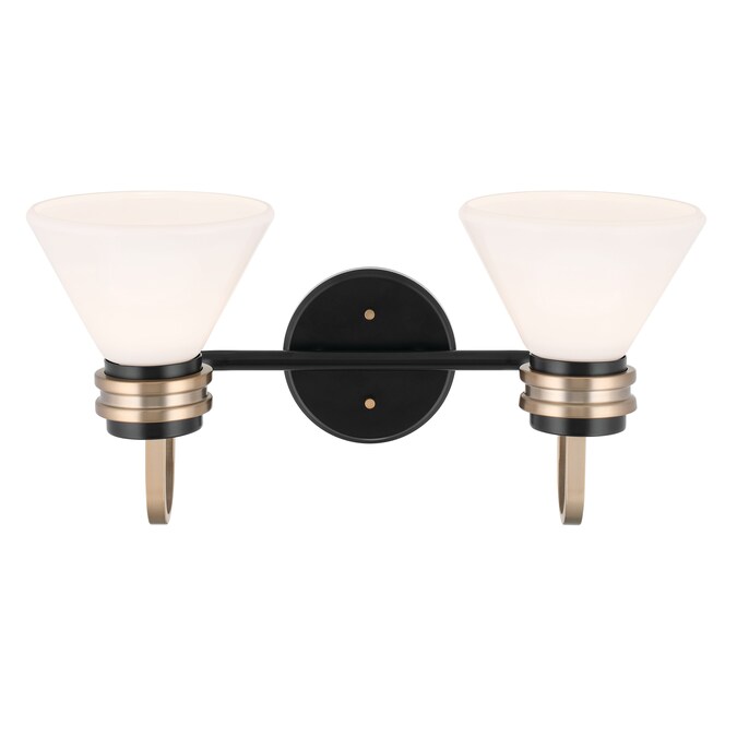With its refined shape, the Farum 2 light vanity complements many bathroom styles. Its clean frame showcases subtle stepped detailing and its Opal glass wonderfully illuminates. The black with champagne bronze combination is on-trend.