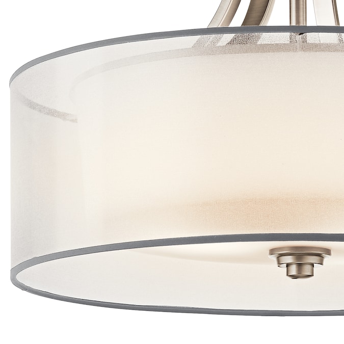 The Lacey™ 20-in 4 light semi flush features a classic look with its Venetian detail of curves in Antique Pewter finish and satin etched cased opal inner diffusers and white translucent organza outer shade. The Lacey semi flush is perfect in several aesthetic environments, including transitional and traditional. Warranty is one (1) year from the date of purchase. Cleaning instructions: Be certain the electric current is turned off before cleaning. Clean metal components with a soft cloth moistened with a mild liquid soap solution. Wipe clean and buff with a very soft dry cloth. Under no circumstances should any metal polish be used, as its abrasive nature could damage the protective finish placed on the metal parts. Never wash glass shades in an automatic dishwasher. Instead, line a sink with a towel and fill with warm water and mild liquid soap. Wash glass with a soft cloth, rinse and wipe dry.