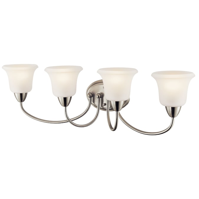 The Nicholson™ 33-in 4 light vanity light features a classic look with its Brushed Nickel finish and satin etched glass. The Nicholson vanity light is perfect in several aesthetic environments, including transitional and traditional. Warranty is one (1) year from the date of purchase. Cleaning instructions: Be certain the electric current is turned off before cleaning. Clean metal components with a soft cloth moistened with a mild liquid soap solution. Wipe clean and buff with a very soft dry cloth. Under no circumstances should any metal polish be used, as its abrasive nature could damage the protective finish placed on the metal parts. Never wash glass shades in an automatic dishwasher. Instead, line a sink with a towel and fill with warm water and mild liquid soap. Wash glass with a soft cloth, rinse and wipe dry.