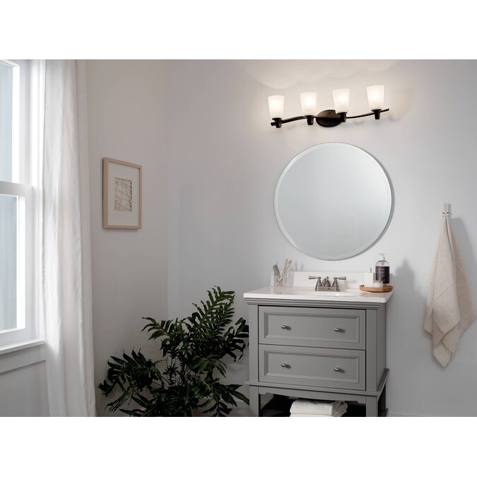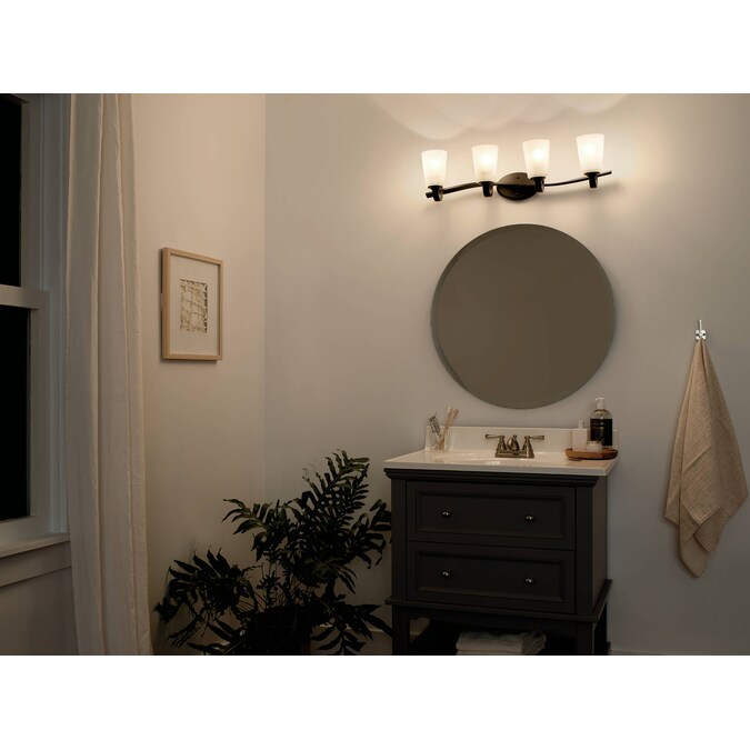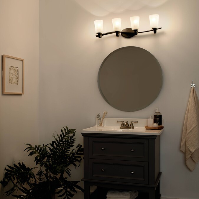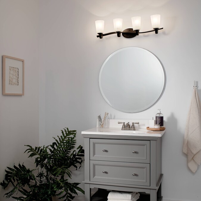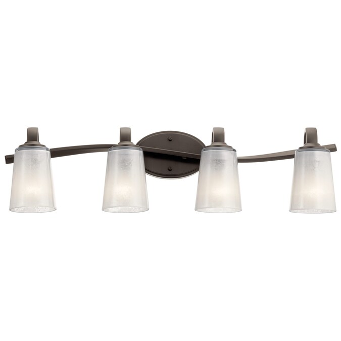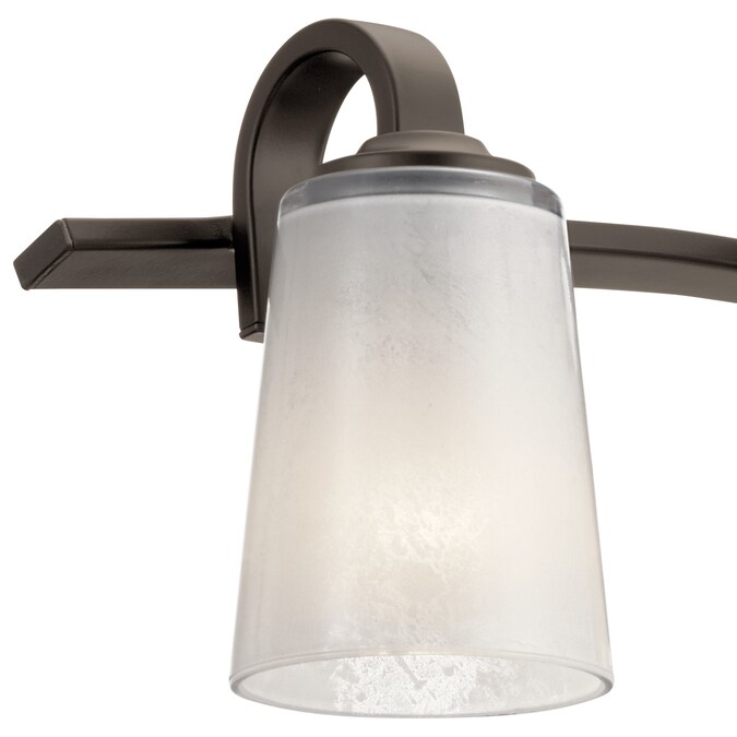 - Stylish olde bronze bathroom vanity fixture with a twist in the arm adds a visual appeal to your room