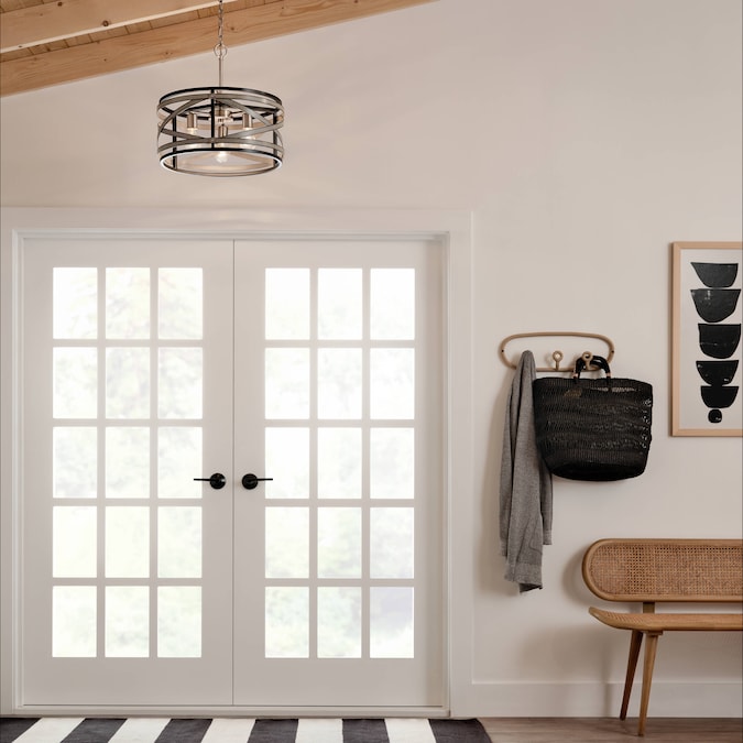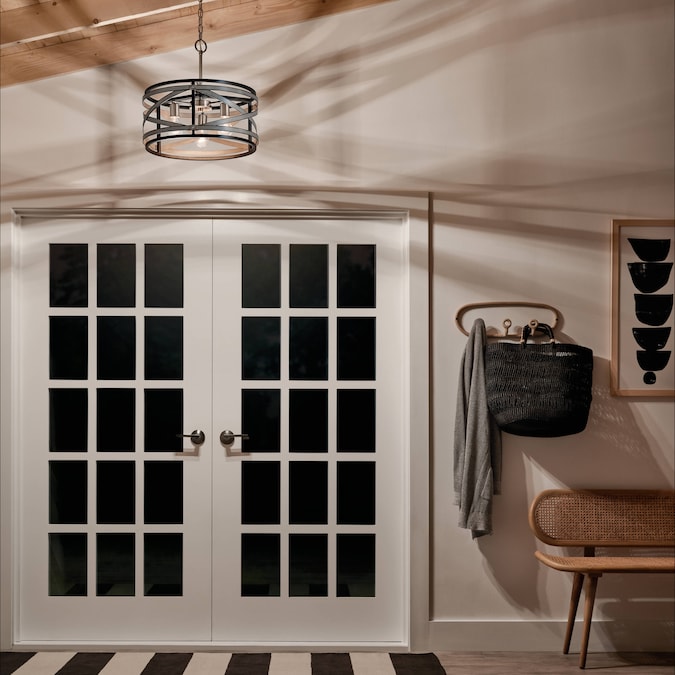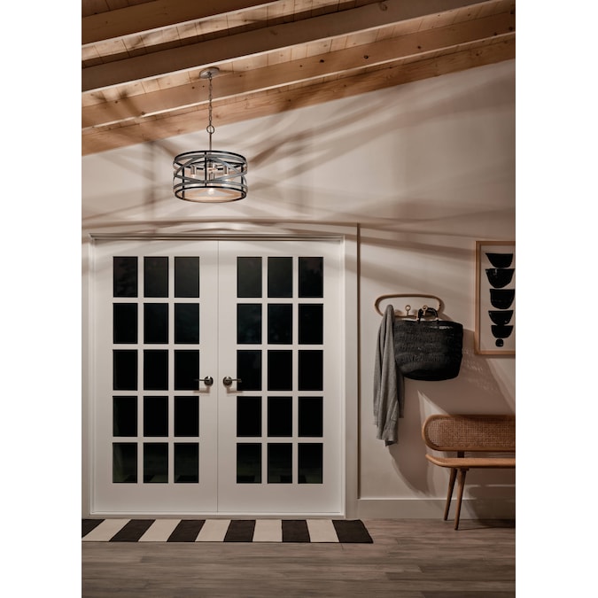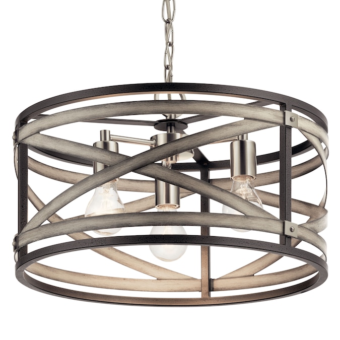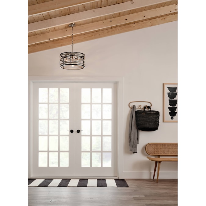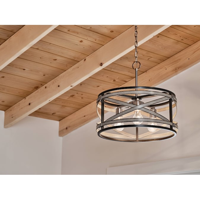 The modern farmhouse pendant from the Stetton collection features mixed finishes in anvil iron and distressed antique Gray with brushed nickel accents. Its circular shape and mixed finishes make this chandelier the perfect piece to create a welcoming setting.