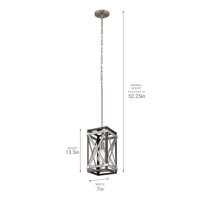 The modern farmhouse foyer pendant from the Stetton collection features a cross frame and mixed finishes in anvil iron and distressed antique Gray with brushed nickel accents. Its rectangular shape and mixed finishes make this mini pendant the perfect piece to create a welcoming setting.