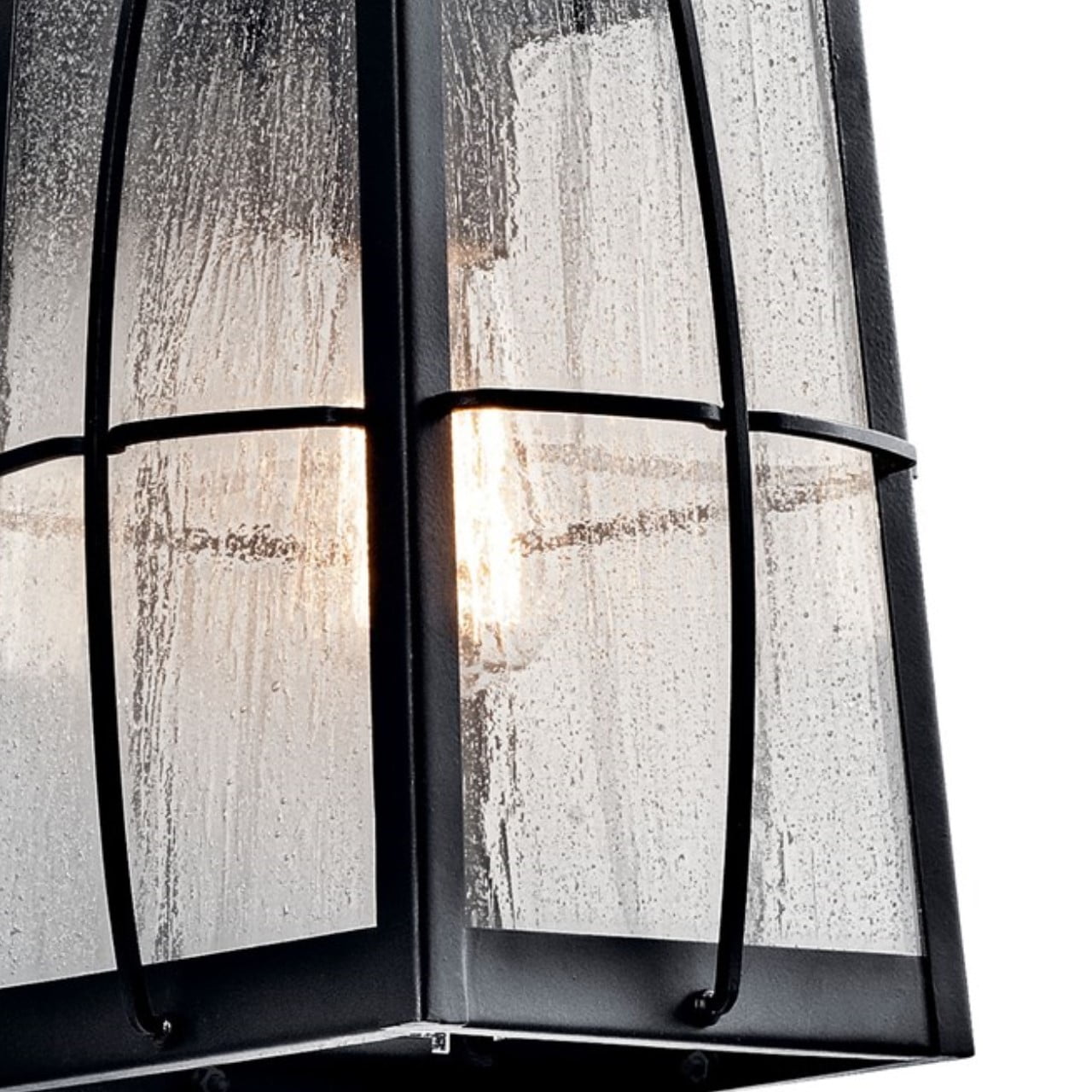 The Kichler Tolerand 17.75 in. 1-Light Textured Black Outdoor Wall Light features curved cage accents that enhance the visual appeal of any decor. Its clear seeded glass diffuser helps disperse light for optimum illumination. The durable aluminum construction of this wall light ensures-years of reliable use. It is an excellent lighting option to illuminate your entryway, garage door, patio, porch, and more.