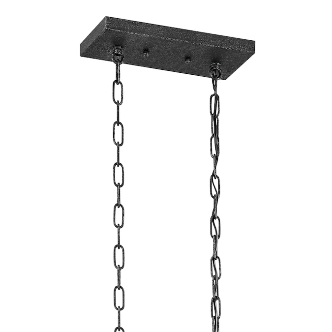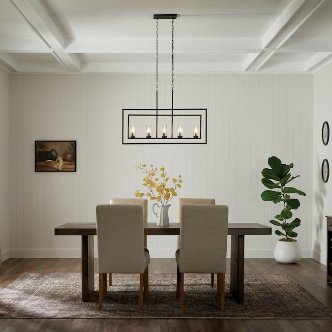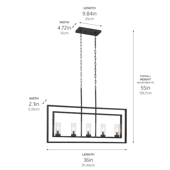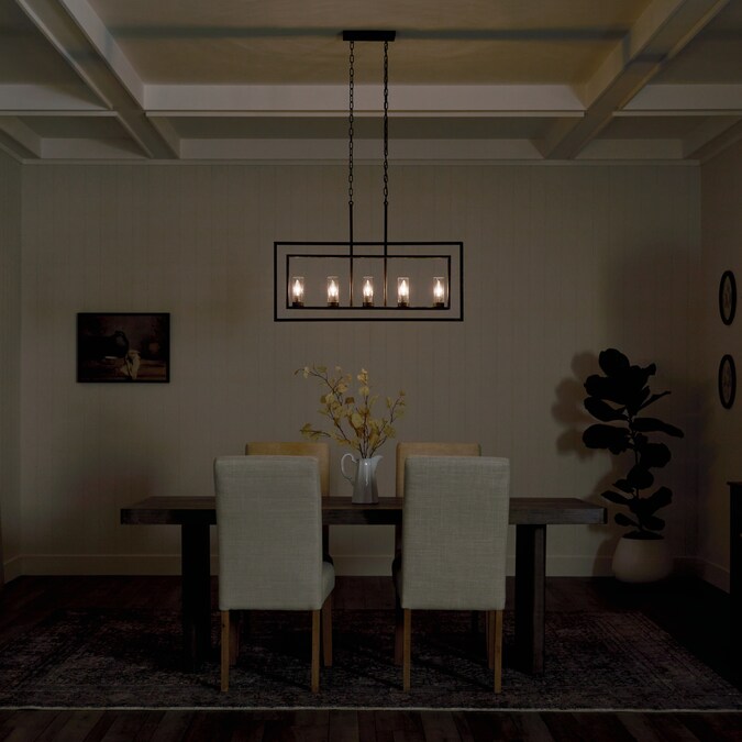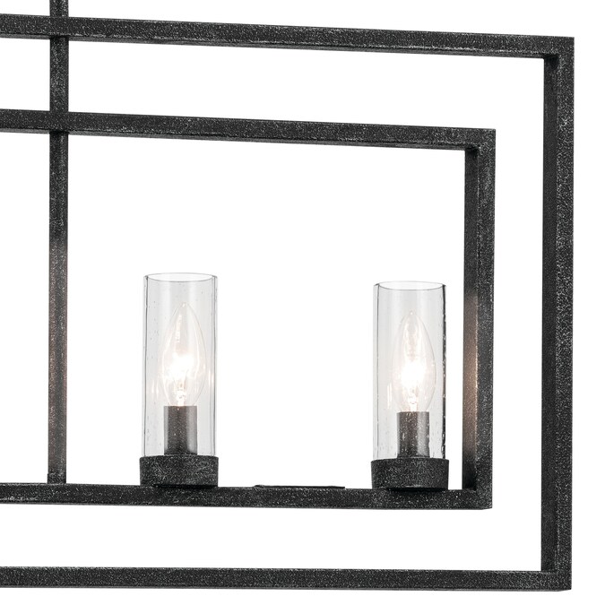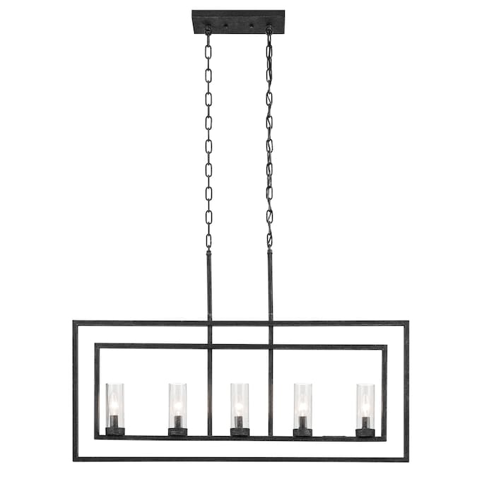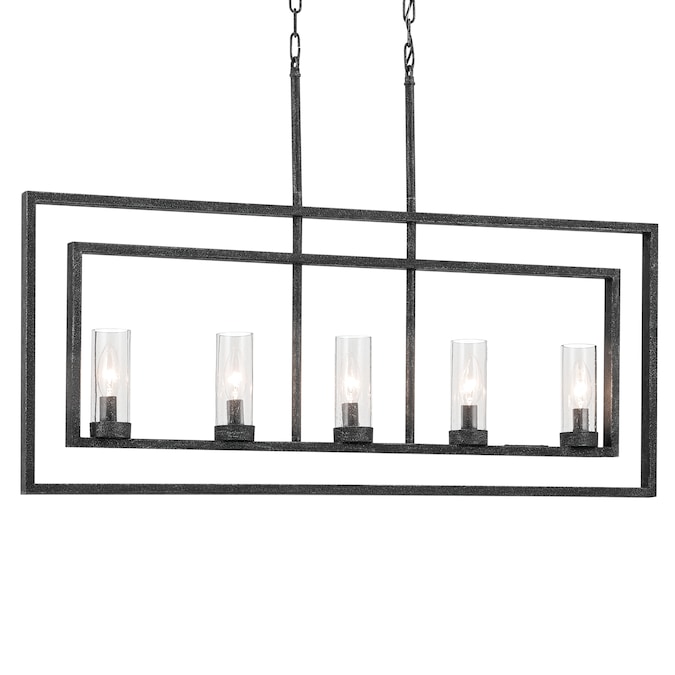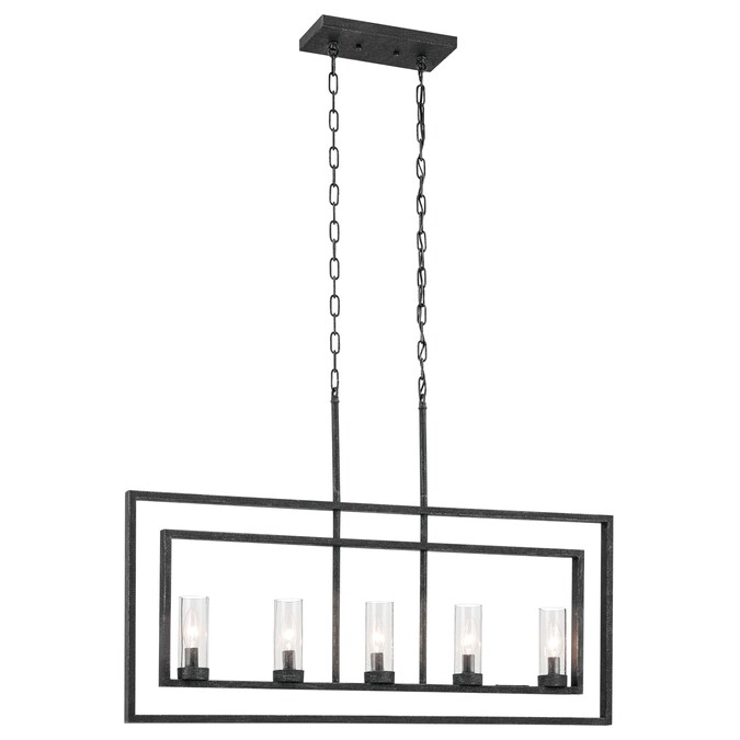 The Vervain 5 light linear chandelier offers a blend of clean lines and delicate details for a look that’s elegant and timeless. Narrow clear seeded glass shades combine with a structural double frame in a distressed black finish to bring a cozy yet refined ambiance to your home. The refined design of this farmhouse chandelier makes it an ideal option for a dining room or kitchen island.