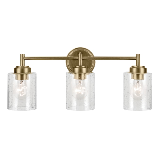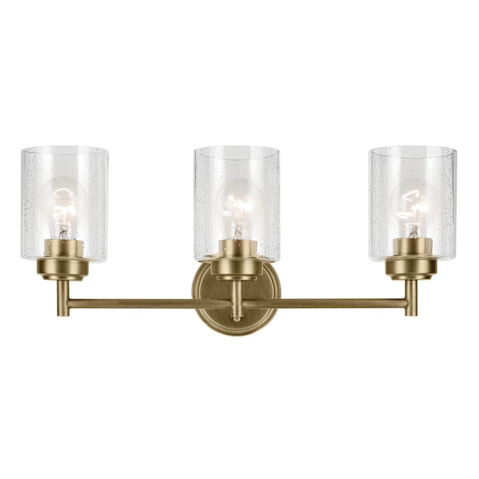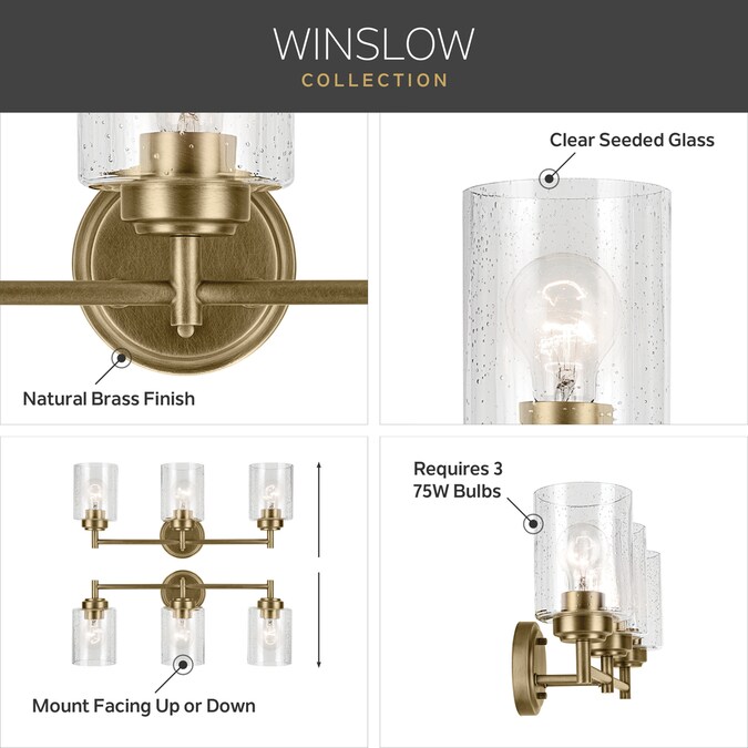 Update your space with the clean, classic, early-electric look of the Winslow 3-light vanity light. A focal piece that’s sure to be all the rage, this Winslow fixture easily jazzes up luxe industrial lifestyles. Winslow’s clear seeded glass filters light beautifully and is removeable for ease of cleaning or replacement. Plus, its on-trend natural brass finish offers an exciting contrast to light walls and is easy to coordinate with other lighting, hardware, and plumbing fixtures.