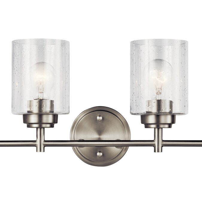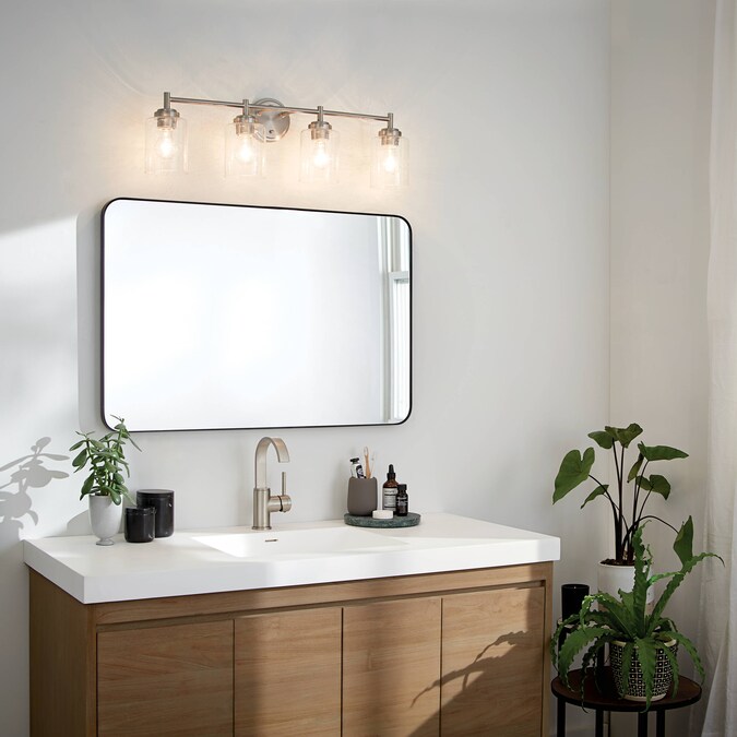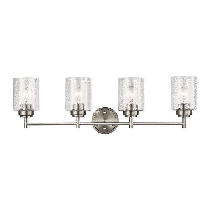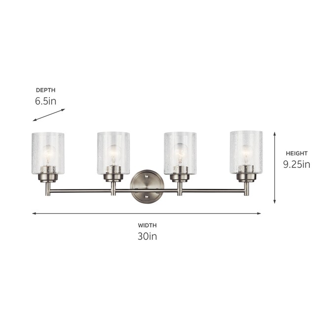 The Winslow 30-in 4 light vanity light features a classic look with its Brushed Nickel finish and clear seeded glass. Winslow vanity light is perfect in several aesthetic environments, including traditional and transitional. Warranty is one (1) year from the date of purchase. Cleaning instructions: Be certain the electric current is turned off before cleaning. Clean metal components with a soft cloth moistened with a mild liquid soap solution. Wipe clean and buff with a very soft dry cloth. Under no circumstances should any metal polish be used, as its abrasive nature could damage the protective finish placed on the metal parts. Never wash glass shades in an automatic dishwasher. Instead, line a sink with a towel and fill with warm water and mild liquid soap. Wash glass with a soft cloth, rinse, and wipe dry.