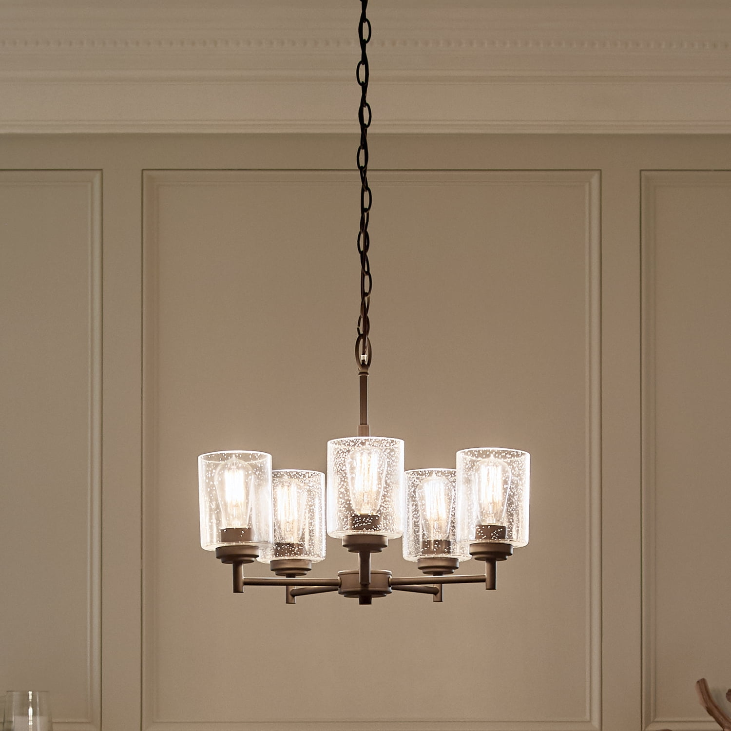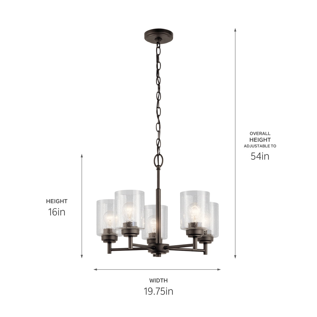 Steel construction ensures strength and durability Designed to be installed as an uplight or a downlight Uses five 75W incandescent medium-base A19 bulbs (not included) Can be used with 36 in. standard-gauge Olde Bronze chain model 2996OZ (sold separately) Olde Bronze finish accentuates your room decor ETL rated for safe use in dry locations Comes with a 36 in. L chain/stem that enables the chandelier to be hung from the ceiling Clear seeded glass diffusers offer bright, ambient lighting