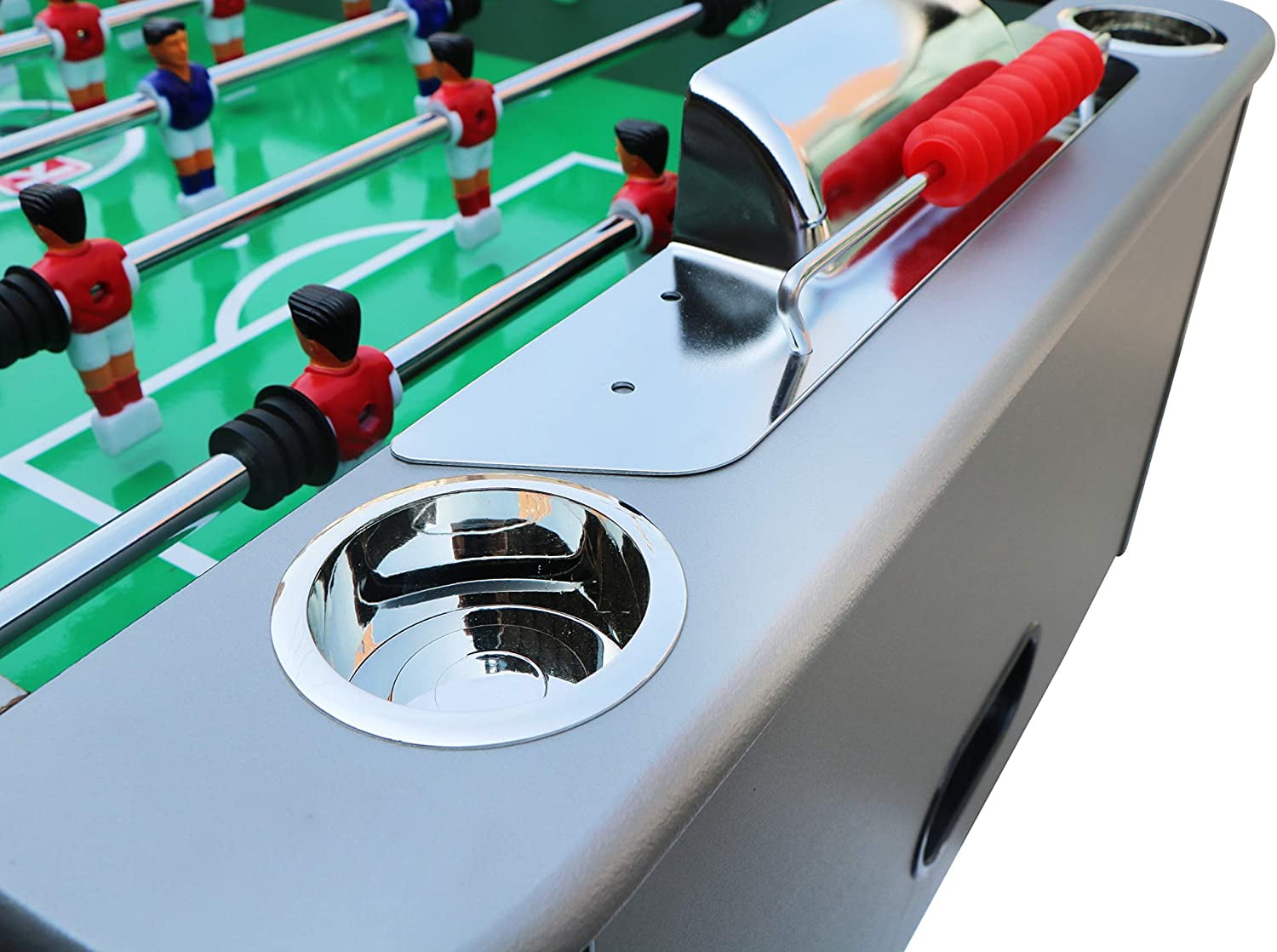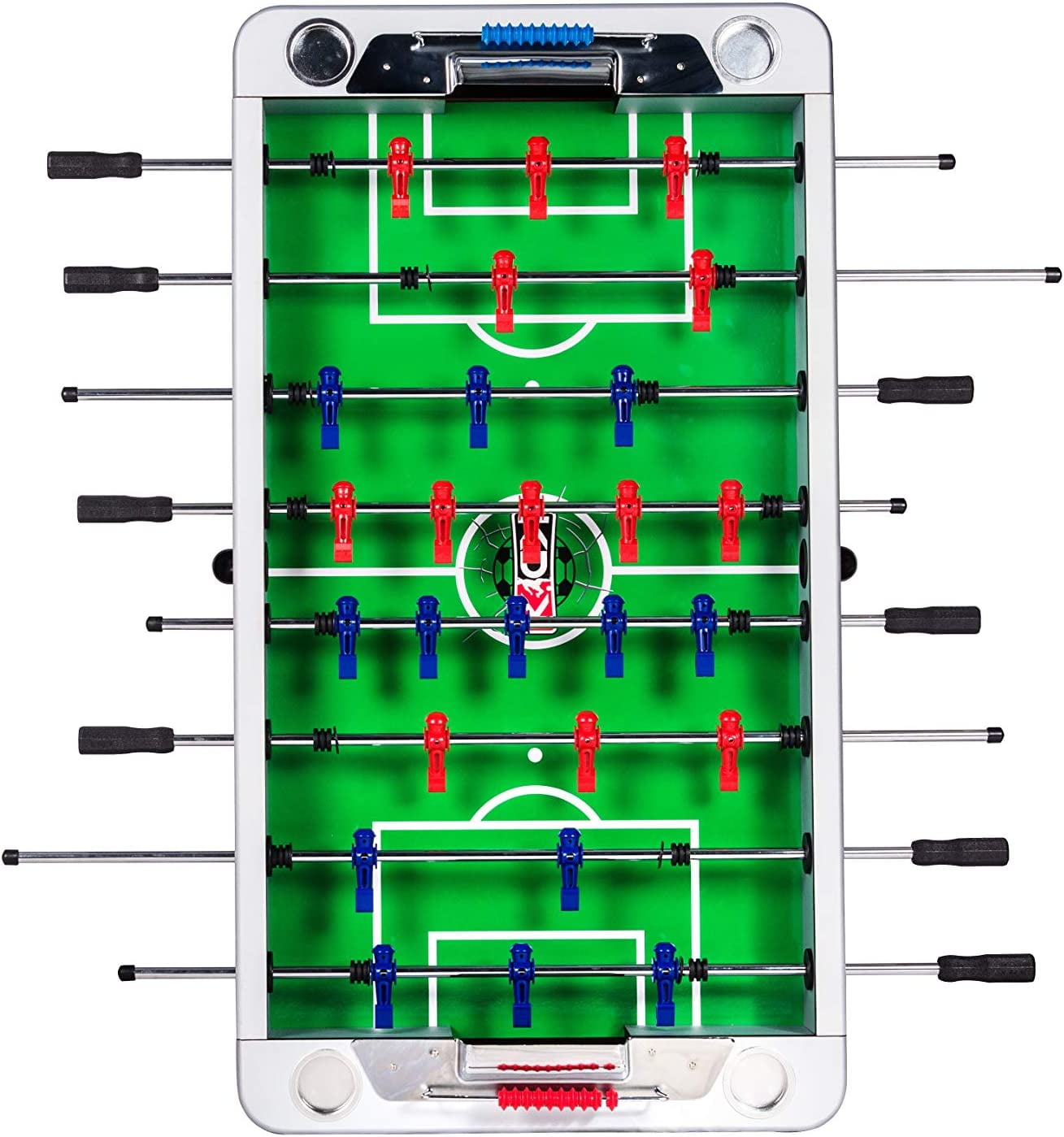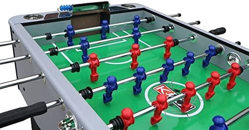 Dimensions: 55″ L X 30″ W X 36″ H Table Weight: 115 Lbs Premium Bearings Convenient Front Ball Return on Each Side of the Table 5″ Leg Levelers With Rubber Bottom 1/2″ Thick Playing Field Abacus-Style Scoring Mounted on Each End 1-Goalie Design or 3-Goalie Design (Player Preference) 8 Durable 5/8″ Semi-Solid Stainless Steel Chrome Plated Player Rods 5″ Leg Levelers with a Rubber Bottom to Ensure Flat Surface 13 Red & 13 Blue Counterbalanced Men AND 13 Red & 13 Blue Uniformed Men Extremely Durable and Elegant Manufacturer Warranty: Lifetime Warranty
