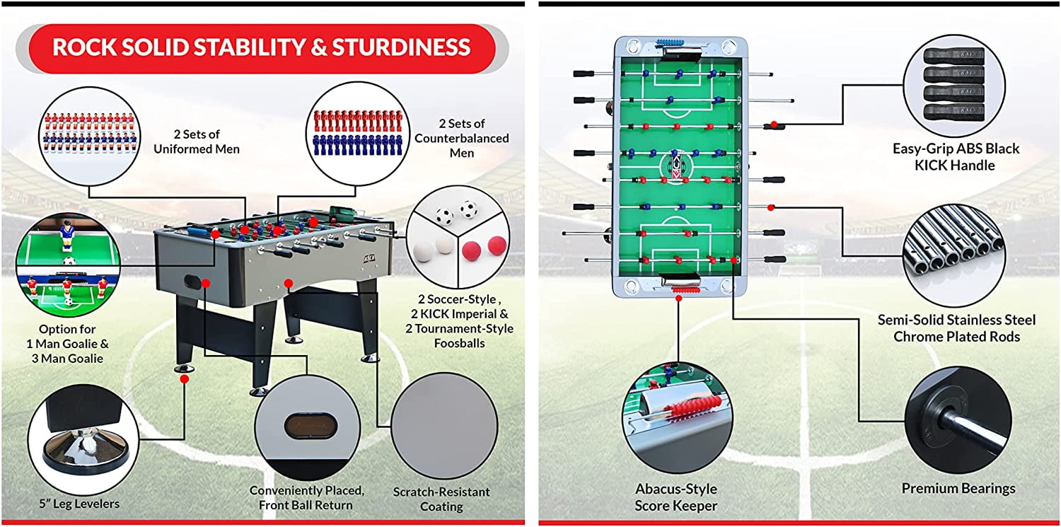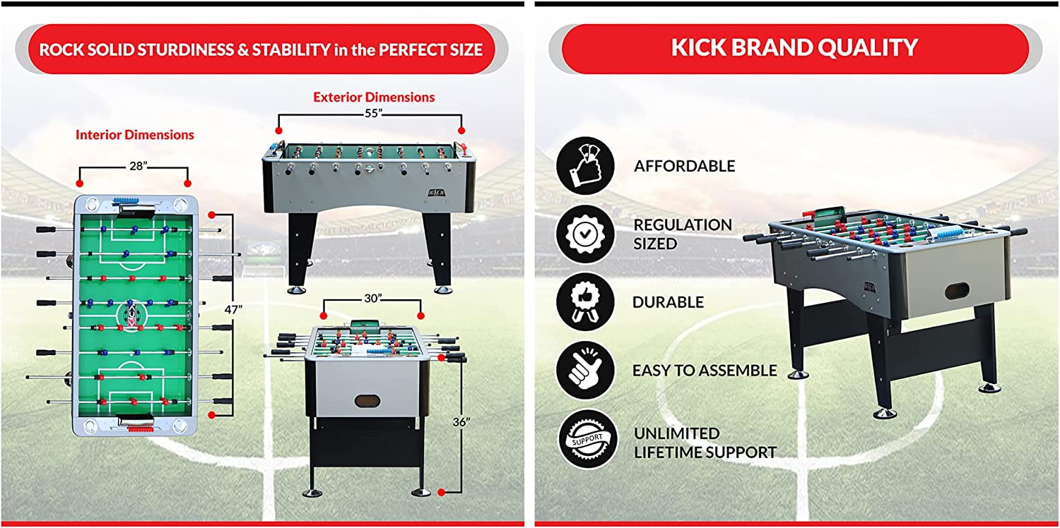 KICK Foosball Table Symphony, 55 in Product Details Shipping Weight: 105 pounds #31 in Foosball Tables Extremely Durable and Elegant Comes With Counter Balanced Men Set AND Uniformed Men Set KICK Brand Quality Unlimited Lifetime Warranty Dimensions: 55″ L X 30″ W X 36″ H About KICK Foosball Tables Foosball is back! Our founder, a 25-year veteran of the sport and a recognized Foosball enthusiast, dreamed of a high-quality gametable that other Foosball lovers could enjoy- without the high price. Afteryears of research, design and development, KICK was born, creating a new standard in Foosball tables. KICK it old-school style and get your very own KICK Foosball Table today! About The KICK Symphony Foosball Table The KICK Symphony, as the name implies, is a foosball table that is a symphony of style, durability, finesse, smooth passing and ball control unsurpassed in this category. The Symphony is composed of only the most premium materials and its sleek design in grey with black trim is an eye catcher in any setting. Technical Specifications: -Table Weight: 115 Lbs -Premium Bearings-5″ Leg Levelers With Rubber Bottom-1/2″ Thick Playing Field-Convenient Ball Return on Each End of Table-Slide Scoring Mounted On Each End of Table-1-Goalie or3-Goalie Design (Player Preference/Ramp Kit Included) -(8) 5/8″ Semi-Solid Stainless Steel Chrome-Plated Rods -2 KICK Premium and 2 Soccer Foosballs -13Red and 13 Blue Counter Balanced Men (Home & Away) & 26 Uniformed Men-8 No-Slip Black Handles with Screws-Lifetime Warranty-Free Shipping-Same DayShipping-Free Rod Lubricant (Upon Request and Shipped Separately, Contact KICK with your shipping address) Your 100% satisfaction is our 1 priority. If there is anything we can do to improve your experience or if you have any questions, concerns, or are not 100% satisfied please call KICK Foosball now we will do everything to make it right. Remember all KICK tables have a LIFETIME warranty on all parts, so rest assured you’re covered!