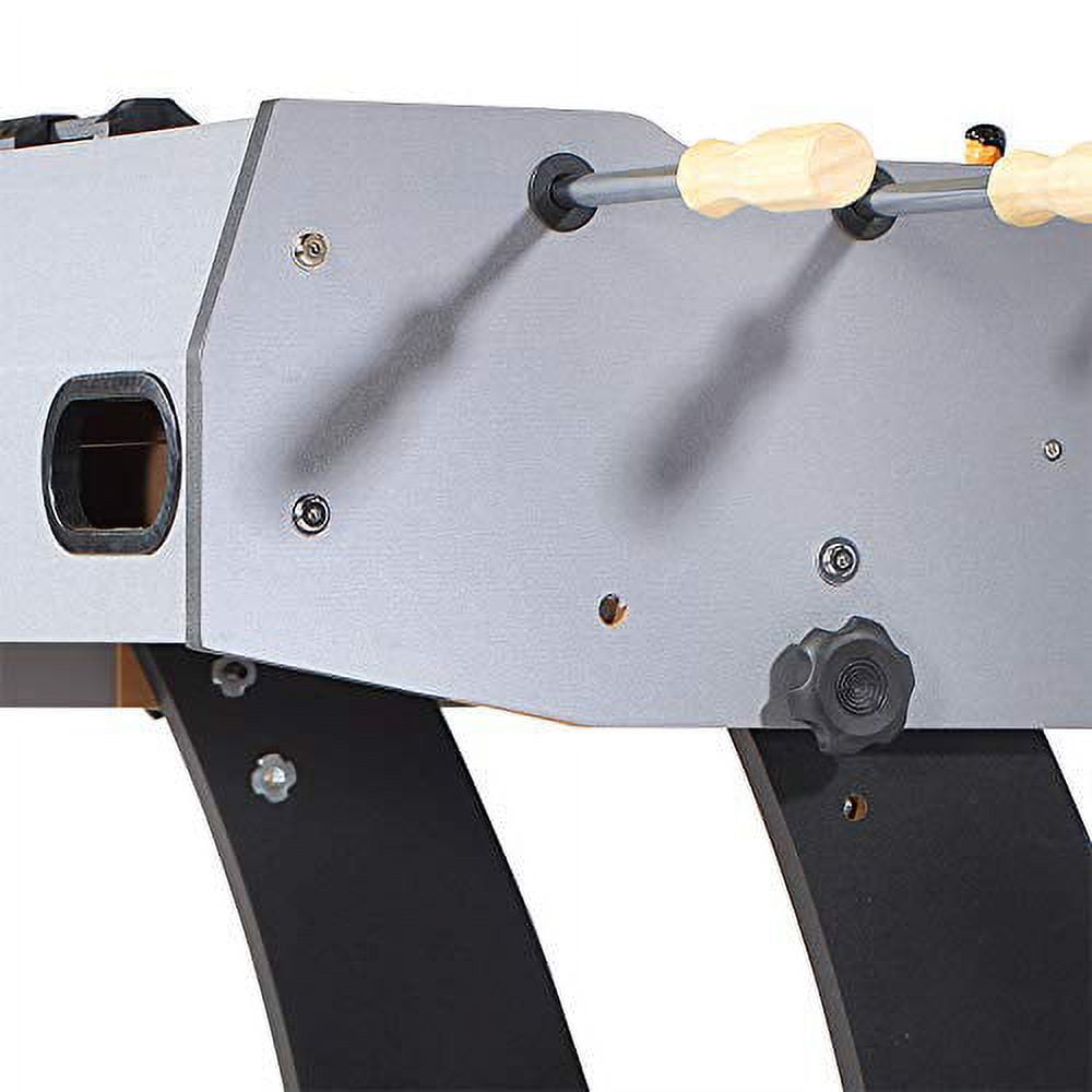 Table Dimension: 48″ L X 24″ W X 32″ H Table Weight: 60 Lbs 1/4″ Thick Playing Field Convenient Foosball Ball Return on Each End of the Table Slide Scoring Mounted on Each End 1-Goalie Design or 3-Goalie Design (Player Preference) 8 Durable 1/2″ Semi-Solid Stainless-Steel Chrome Plated Player Rods Sturdy 2″ Leg Levelers to Ensure a Flat Surface 13 Red and 13 Blue foosball Uniformed Men (Home & Away) 2 Soccer Style Foosballs 8 No-Slip Wooden Handles with Screws and 8 Rod Safety Caps