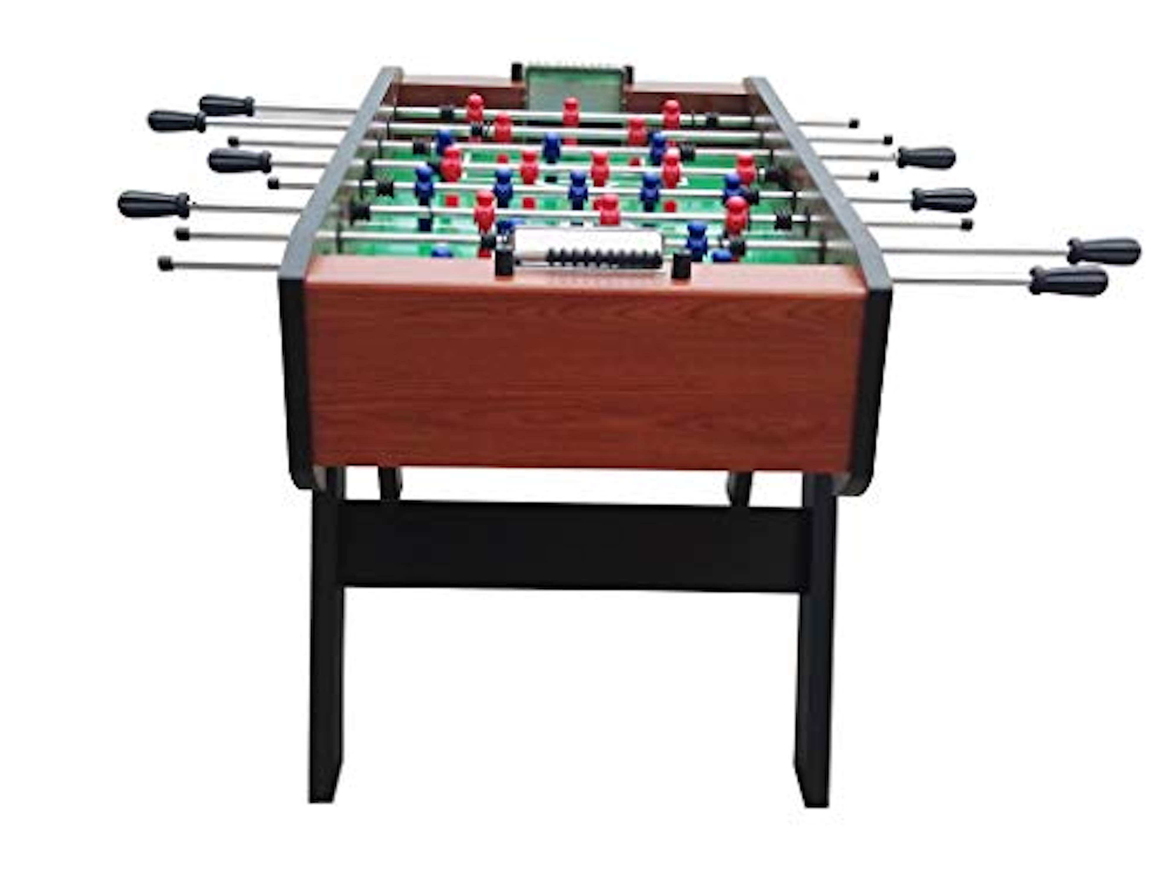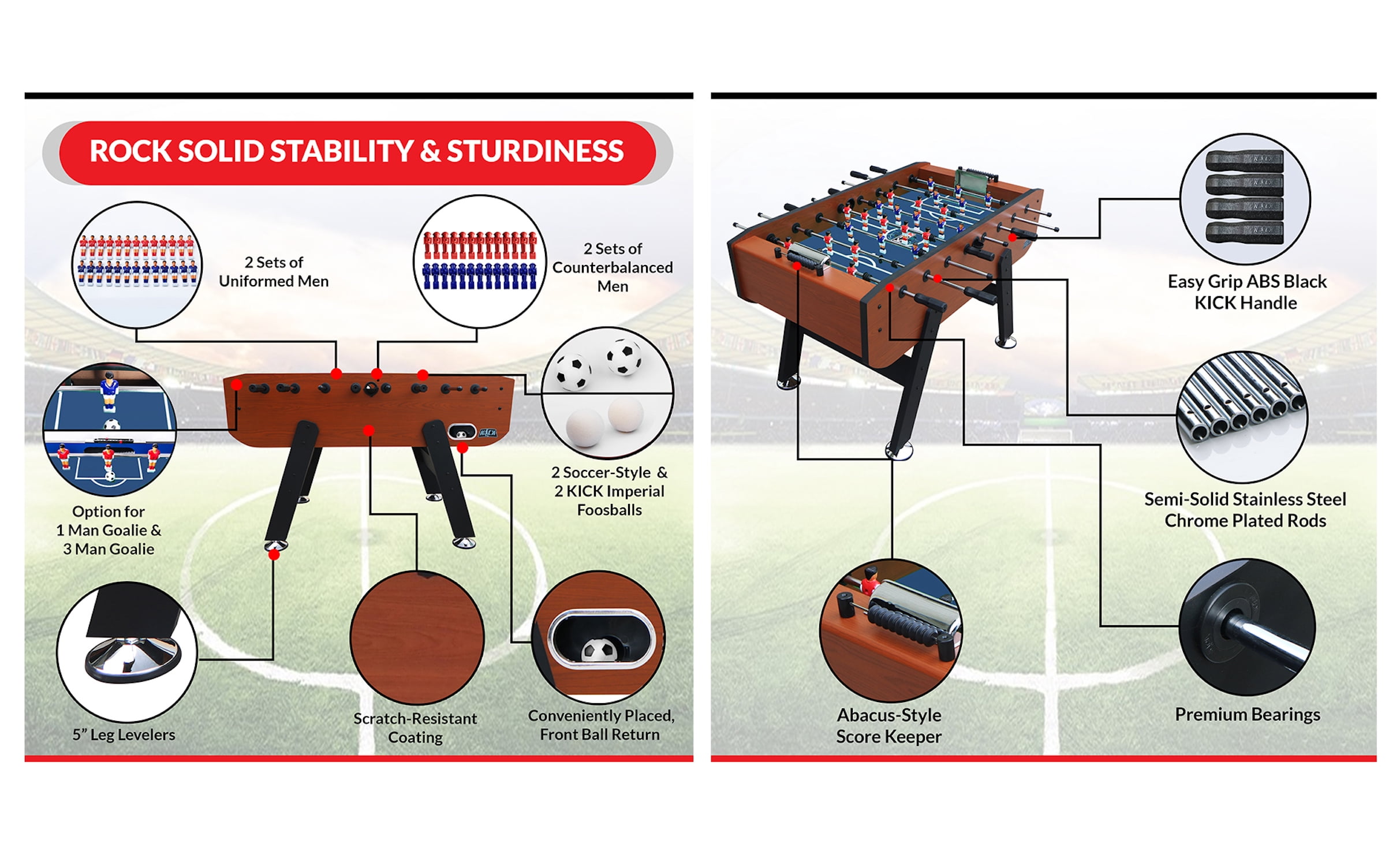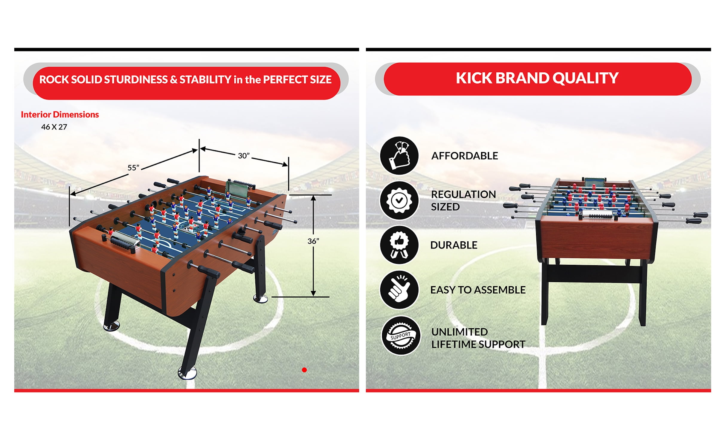 Table Dimension: 55″ L X 30″ W X 36″ H Table Weight: 126 Lbs 1/2″ Thick Playing Field Abacus-Style Scoring Mounted on Each End 1-Goalie Kit Including Corner Ramps and Rod Stoppers 8 Durable 5/8″ Semi-Solid Stainless Steel Chrome Plated Player Rods with 8 Easy-Grip Black ABS Handles with Screws and 8 Rod Safety Caps Sturdy 5″ Leg Levelers with a Rubber Bottom to Ensure Flat Surface 13 Red & 13 Blue Counterbalanced Men AND 13 Red & 13 Blue Uniformed Men 2 KICK Imperial Foosball, 2 Soccer-Style Foosball, 2 Tournament-Style Foosball Manufacturer Warranty: Lifetime Warranty