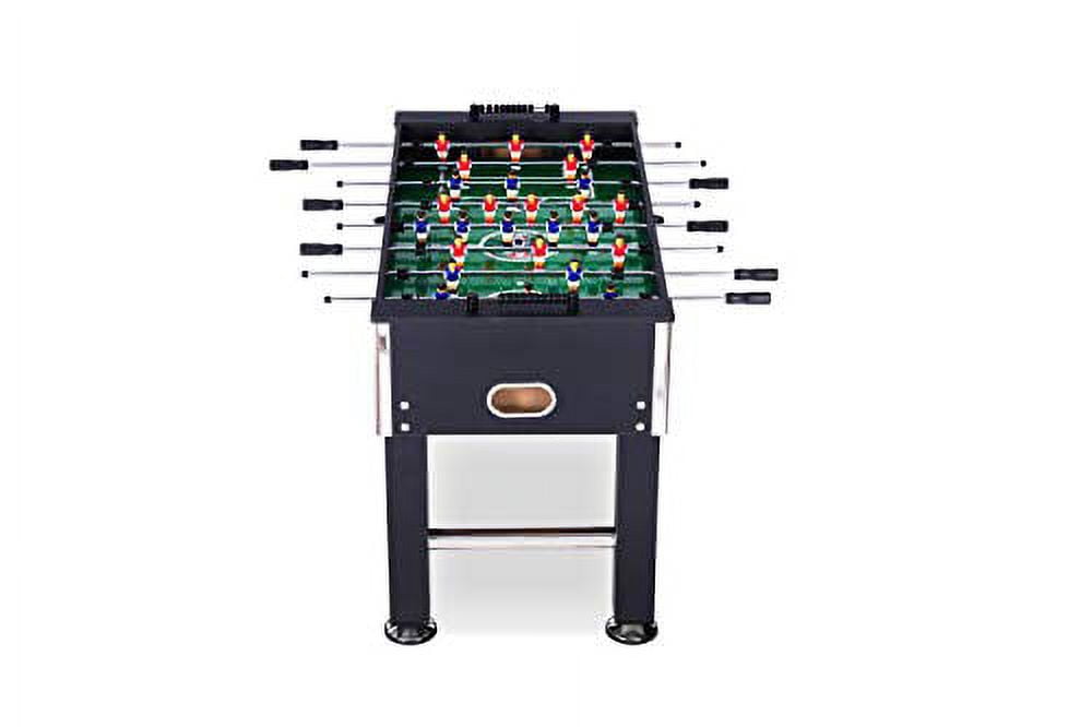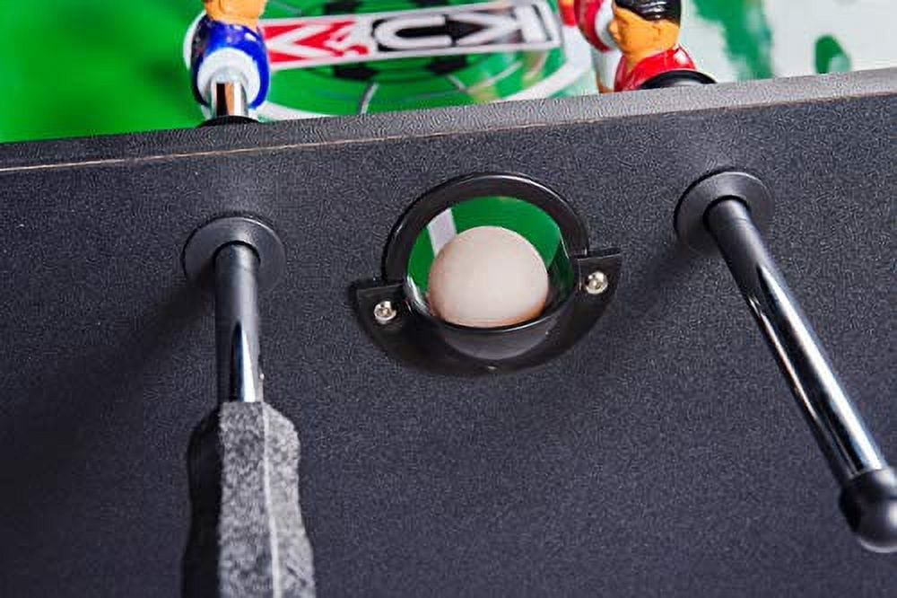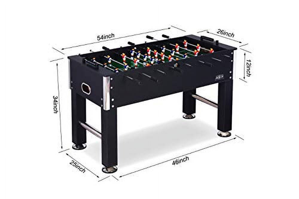 Measures 55″ L x 26″ W x 34″ H, with a table weight of 84 lbs for a sturdy and stable foosball experience. Features a 1/2″ thick playing field for an intense gaming experience, along with semi-solid stainless-steel chrome plated rods for precise ball control. Includes 8 durable 1/2″ semi-solid stainless-steel rods and 8 easy-grip black handles with screws for a secure and comfortable grip. Offers a 1-goalie or 3-goalie design, allowing players to customize their gameplay to their preference. Equipped with a 1-goalie kit that includes corner ramps and rod stoppers for added versatility. Features sturdy 5″ leg levelers with rubber bottoms to ensure a perfectly straight playing surface on any floor. Comes with 13 red and 13 blue uniformed players (home and away) for an authentic foosball experience. Includes 2 KICK Imperial Foosball and 2 soccer-style foosball balls for added gameplay options. Designed with a sleek black and silver color scheme, the KICK Voyager 55″ Foosball Table combines style and precision for an exceptional foosball experience.