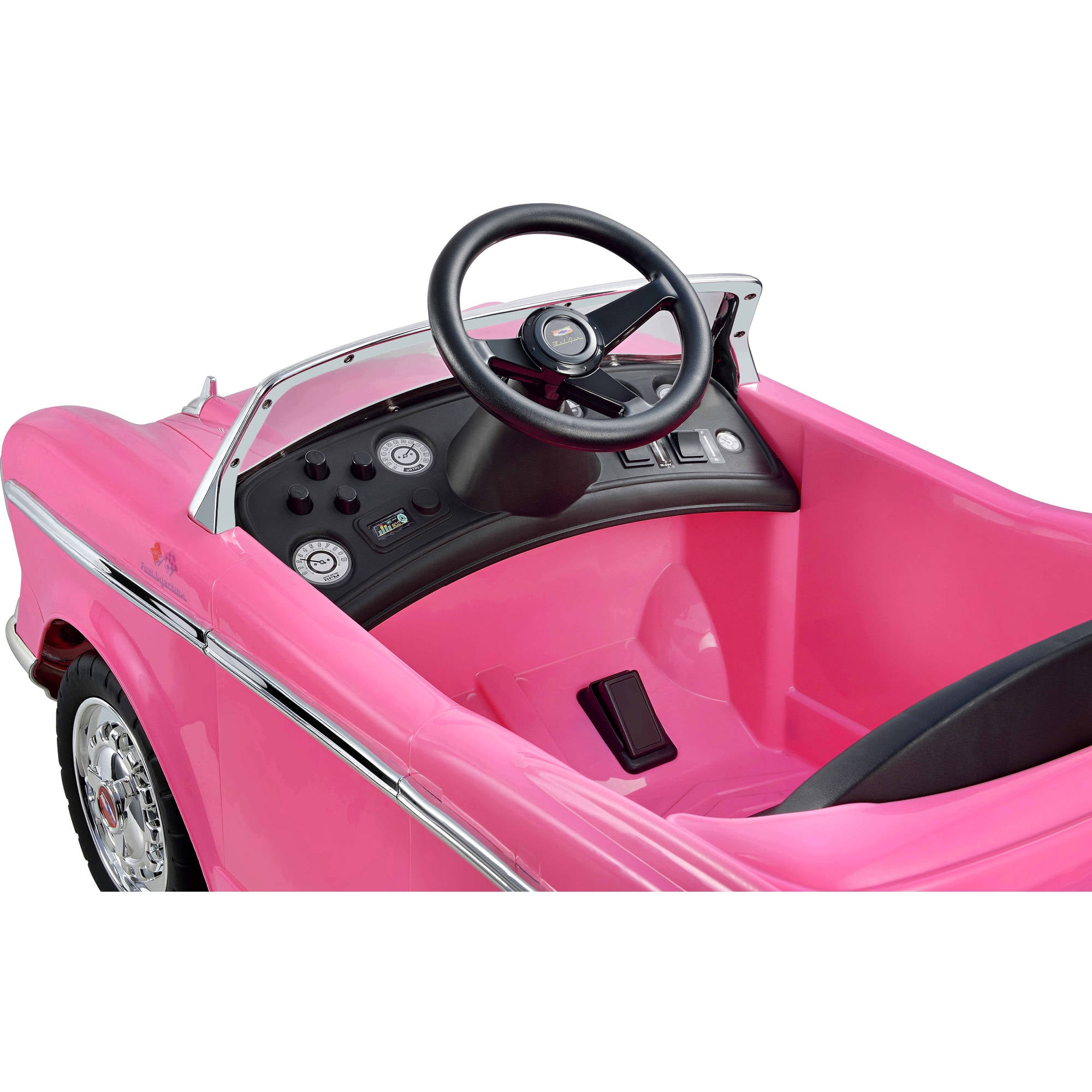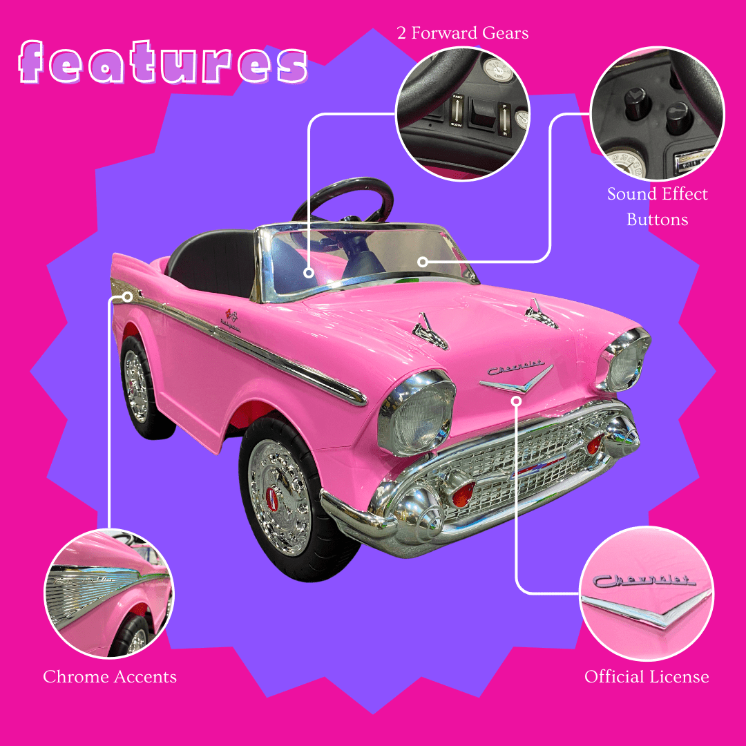 Officially Licensed Chevy Bel Air Ride On Two Forward (2.5 to 5 mph) and one reverse gears Chrome Rims and Front Grille Electronic Sound Effects