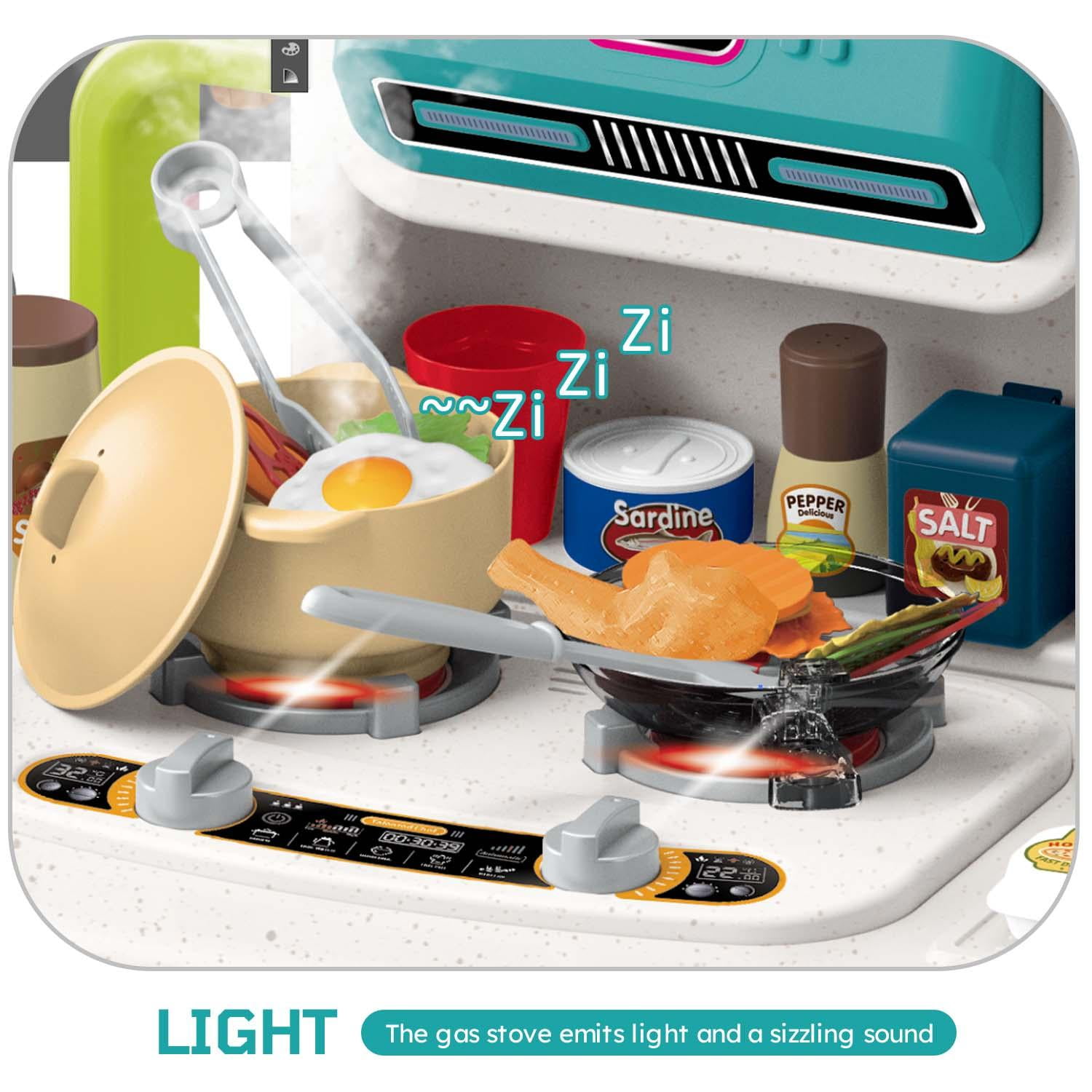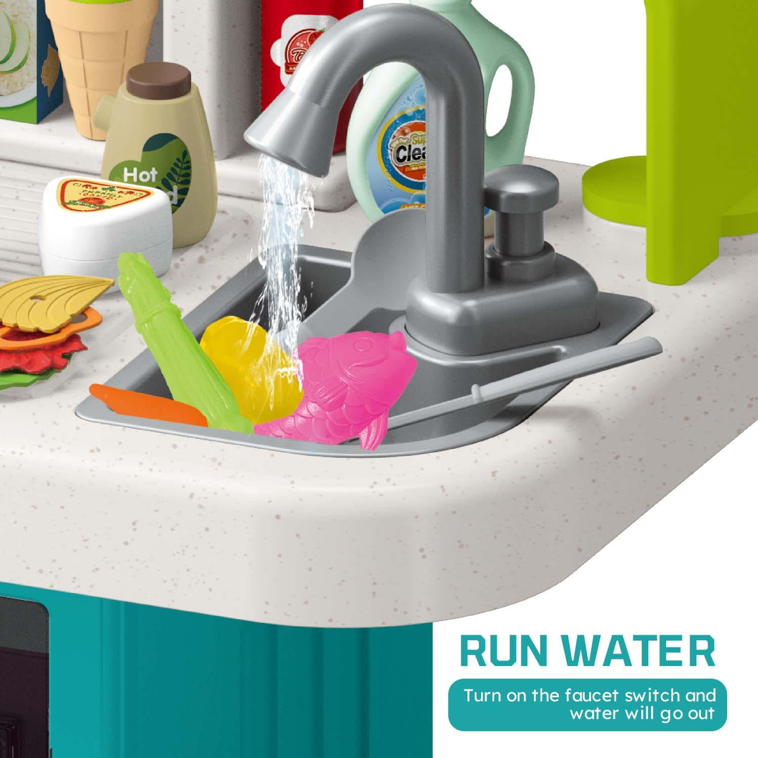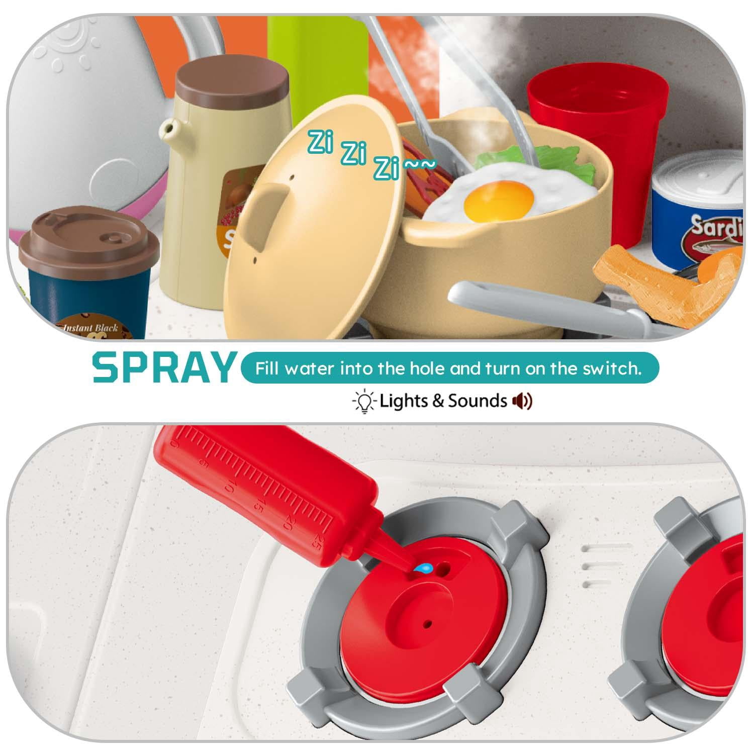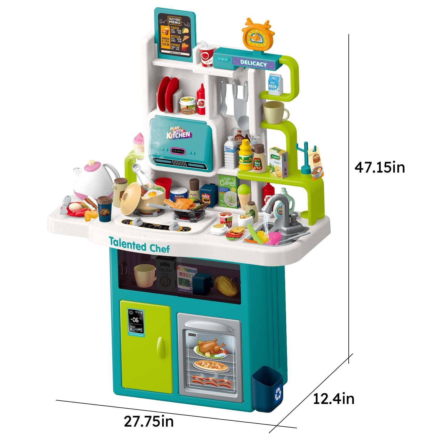 Specification: Product Dimensions(L*W*H): 27.9*12.6*40.5IN Weight:3.9lb Battery: Gas furnace need 3*1.5V AA battery;(NOT INCLUDED); Tip: This kitchen toy is relatively lightweight, we recommend playing against a wall. A Realistic Kitchen Set For Your Kids Simulation sink game Water can be drawn through the tap, water circulatory system. Children can wash vegetables, fruits, cookware, dishes in the sink. Help children develop good habits of sorting and saving water from childhood. Realistic design Children can experience the joy of cooking with fun lights, music and spray. Build skills and learn with this fun and educational electronic kitchen toy. Child-friendly ABS material Made of child-friendly, safe ABS material, the corners are smooth, burr-free, odor-free, and durable. It’s a great play kitchen set for toddler boys and girls. Lights Music and Sound After placing the pot or pan on the stove, when the button is turned on, the burner will light up and produce a realistic cooking sound.Realistic working light and sound effect add to the real feeling of role-playing. Various Storage Space Kids play kitchen set with a lot of storage space, such as realistic refrigerator, oven, shelf can be used to placed fork and spoon, dish and othe accessories. It can let your child develop the good habit of organizing.