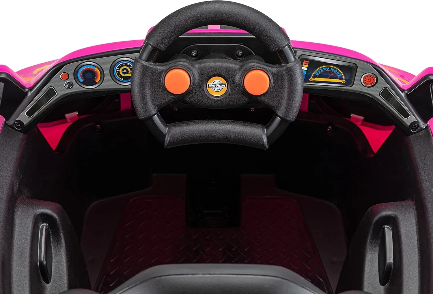 Go for a spin with the Dizzy Racers ride-on toy by Kid Trax! This unique race-car style toy is perfect for indoor or outdoor rides. By using the dual push-button drive system, your child can drive, turn, or enjoy the fantastic fun of 360° spins! The top speed of 2.5 MPH provides the perfect blend of fun and safety, while Power Trax rubber traction strip tires keep the ride smooth and steady. And don’t forget, the Dizzy Racers come with a rechargeable battery and charger with Direct Connect Charging System so the fun never has to stop for long. It’s giggles on the go with the Dizzy Racers by Kid Trax