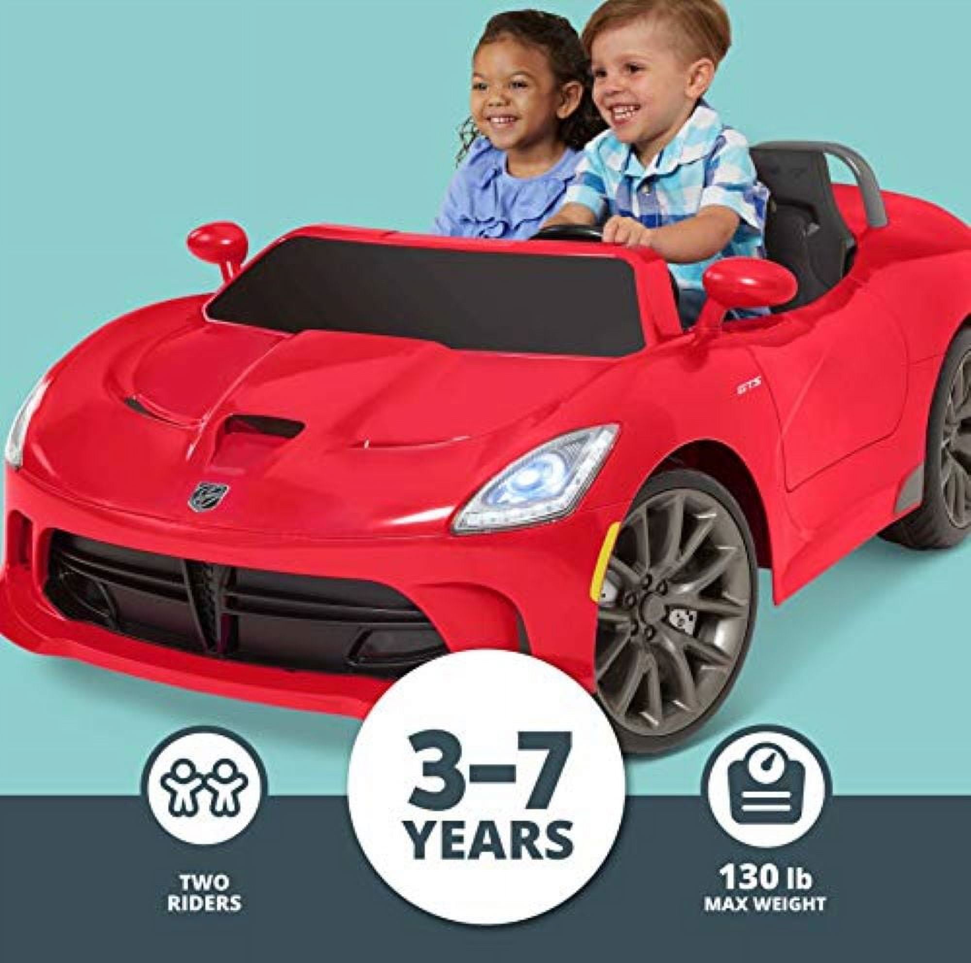 Kid Trax Dodge Viper SRT Convertible Toddler Ride On Toy, Ages 3-7 Years Old, 12 Volt Battery, Max Weight of 130 lbs, Two Seater, Working Lights, Red Dodge Viper ride-on toy delivers hours of driveway and sidewalk fun. Sits 2 riders ages 3 – 7, with a total maximum weight limit of 130 lbs. This ride-on has tons of features just like the real SRT Viper, including realistic engine sounds. FM radio, MP3 player input, and working LED lights add to the fun. Goes forward at speeds of 2.5 and 5 MPH; reverse 2.5 MPH. Comes with a 12-volt rechargeable battery and wall charger so the fun never has to stop! Unisex: For both boys and girls