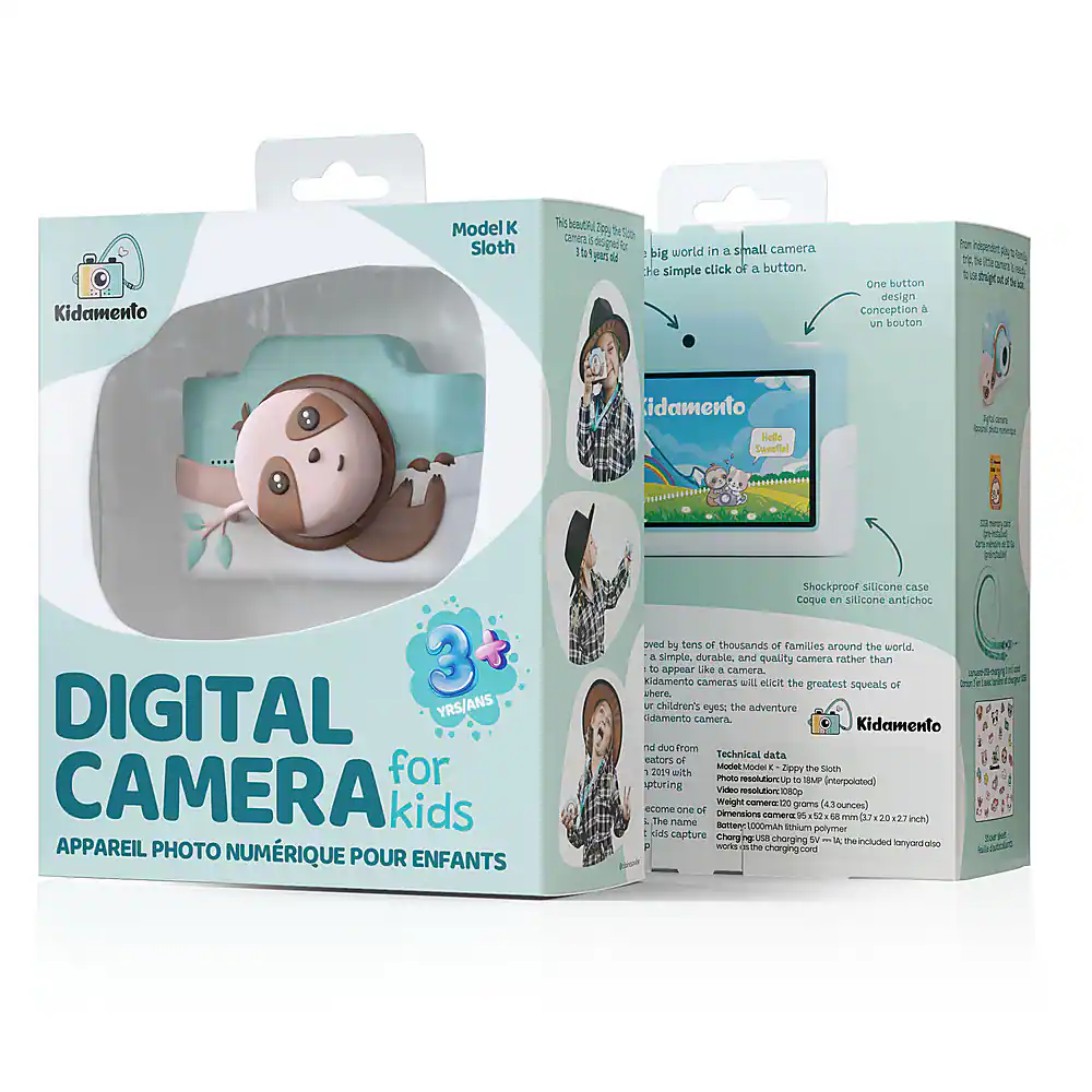 The Kidamento Model K is the perfect camera for kids aged 3 to 9. This innovative children’s digital camera is the ultimate gear for little budding photographers. Zippy the Sloth, featuring a brightly coloured sloth animal design, brings joy and excitement to every photo adventure and will be sure to add that extra element of fun.