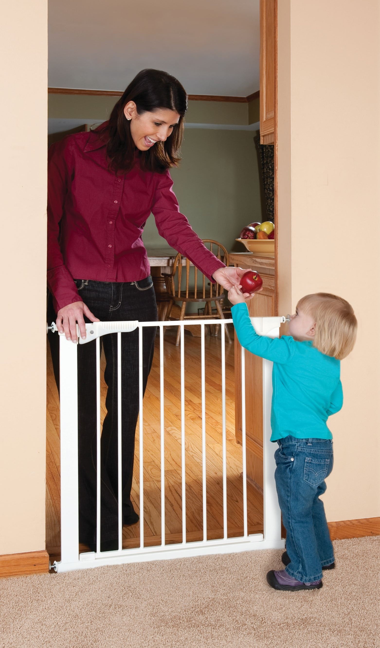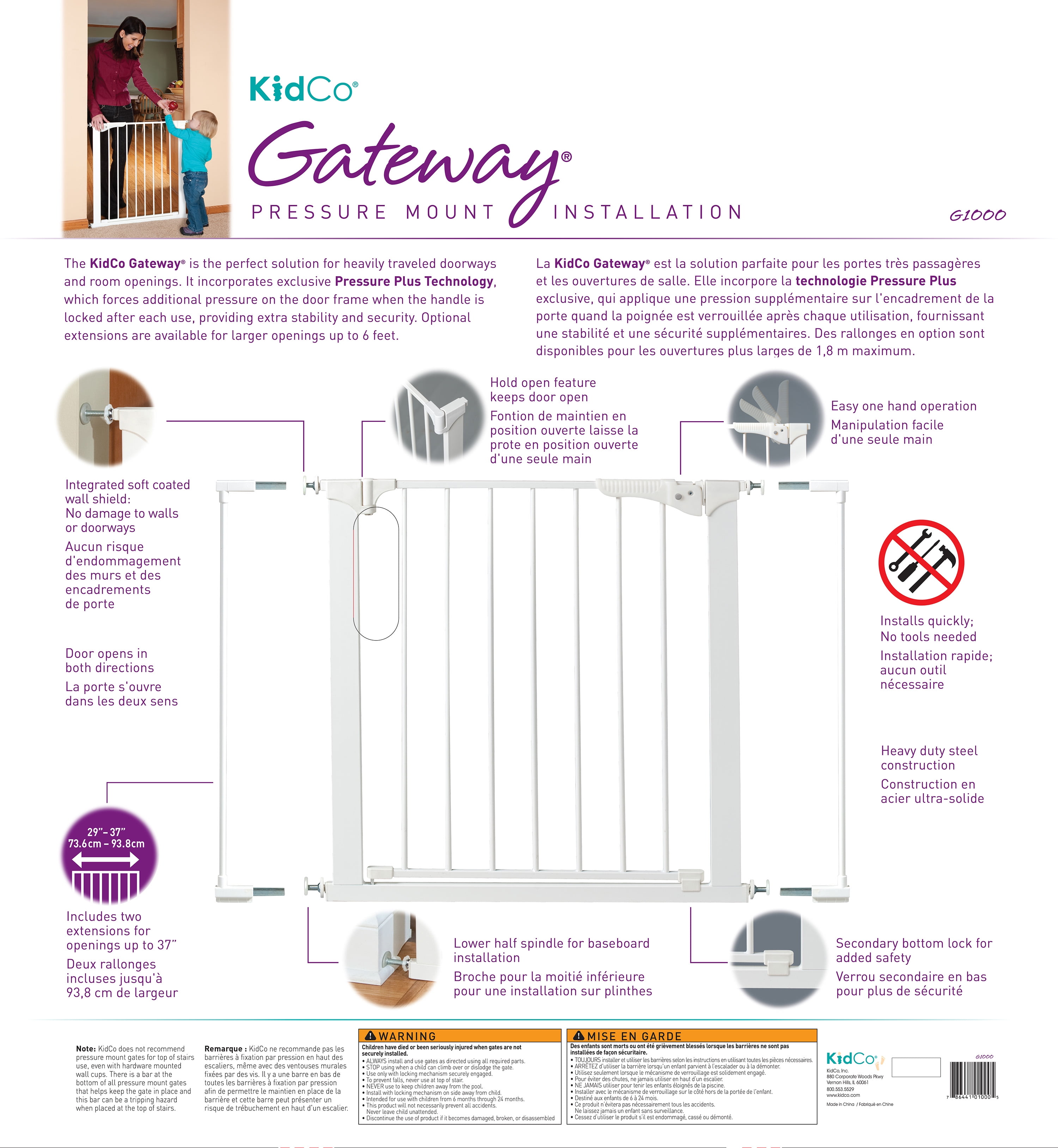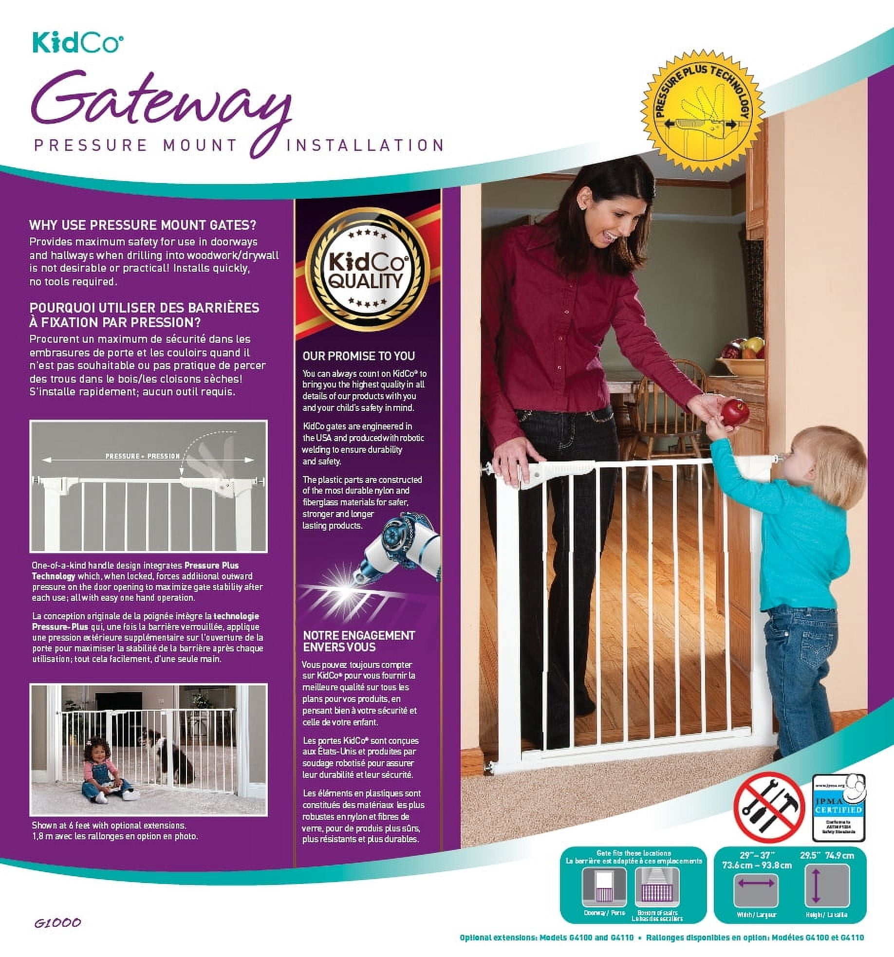 The KidCo Child Safety Gate is perfect for heavily traveled doorways and room openings One of a kind handle design integrates pressure-Plus technology forces additional outward pressure on door opening Includes two extensions, gate width: 29” – 37”, gate height: 29. 5” Optional extensions (Models G4100 5. 5″ and G4110 12. 5″ ) are available for openings up to 6′ Color: White