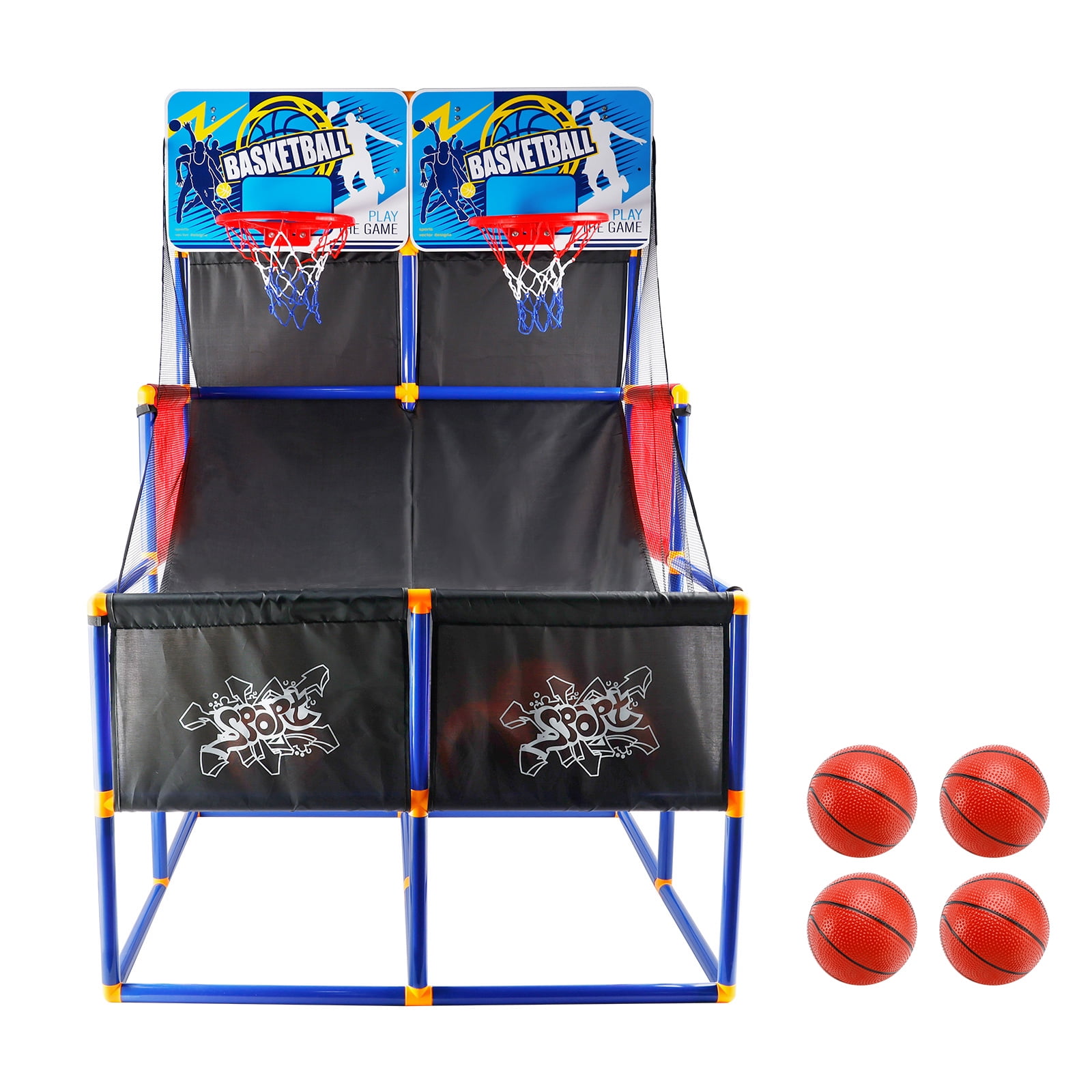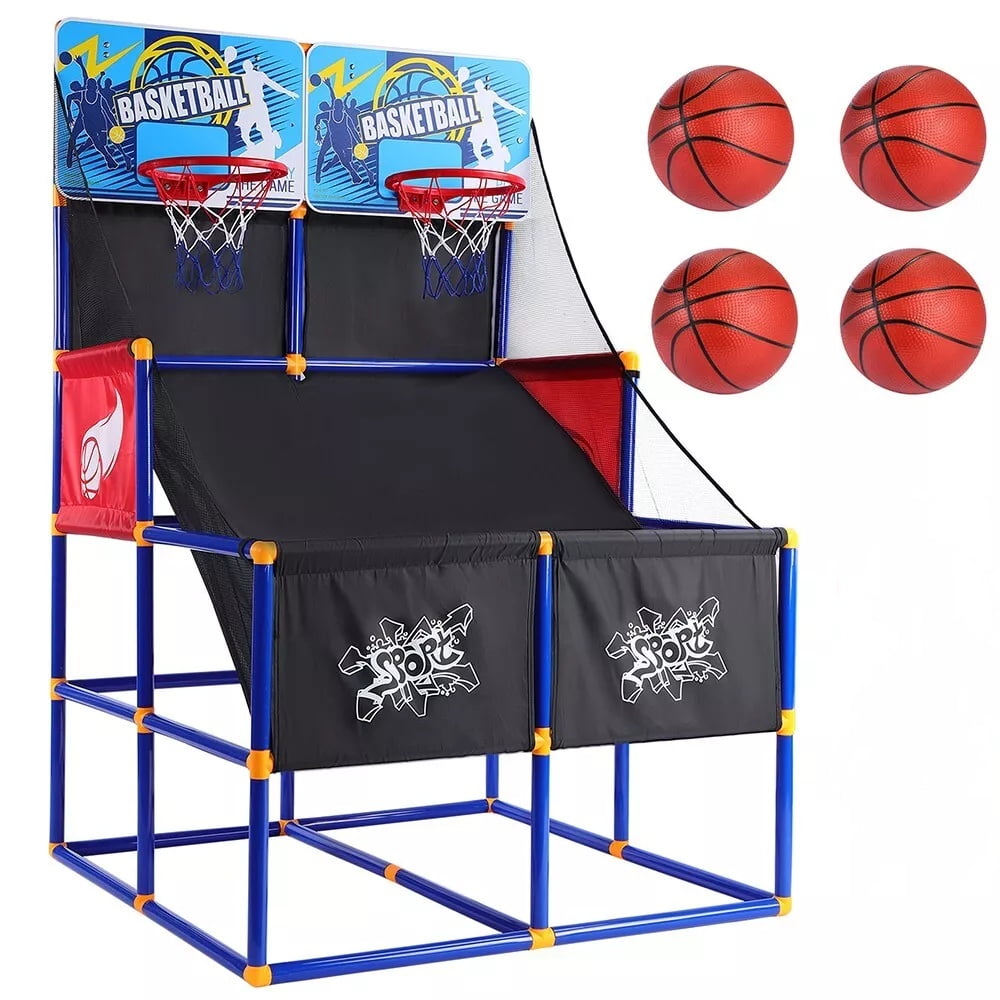 Sturdy and Safe Design: The arcade game is built with thickened PVC tubes and features rounded corners, enhancing both stability and safety for children. Durable Play Components: Equipped with impact-resistant backboards, solid basket rims, and durable nets designed to withstand thousands of shots, ensuring long-lasting fun and playability. Convenient Storage and Setup: Includes a storage compartment beneath the unit to help keep play areas neat and tidy, coupled with a tear-resistant ball return ramp. The design allows for quick and easy assembly. Comprehensive Set: Comes with two basketball hoops, two basketballs, and an inflation pump, allowing multiple players to engage in games simultaneously, which is great for developing competitive and cooperative play skills. Indoor and Outdoor Play: Perfectly suitable for both indoor and outdoor use (weather permitting), providing flexible play options for various environments.