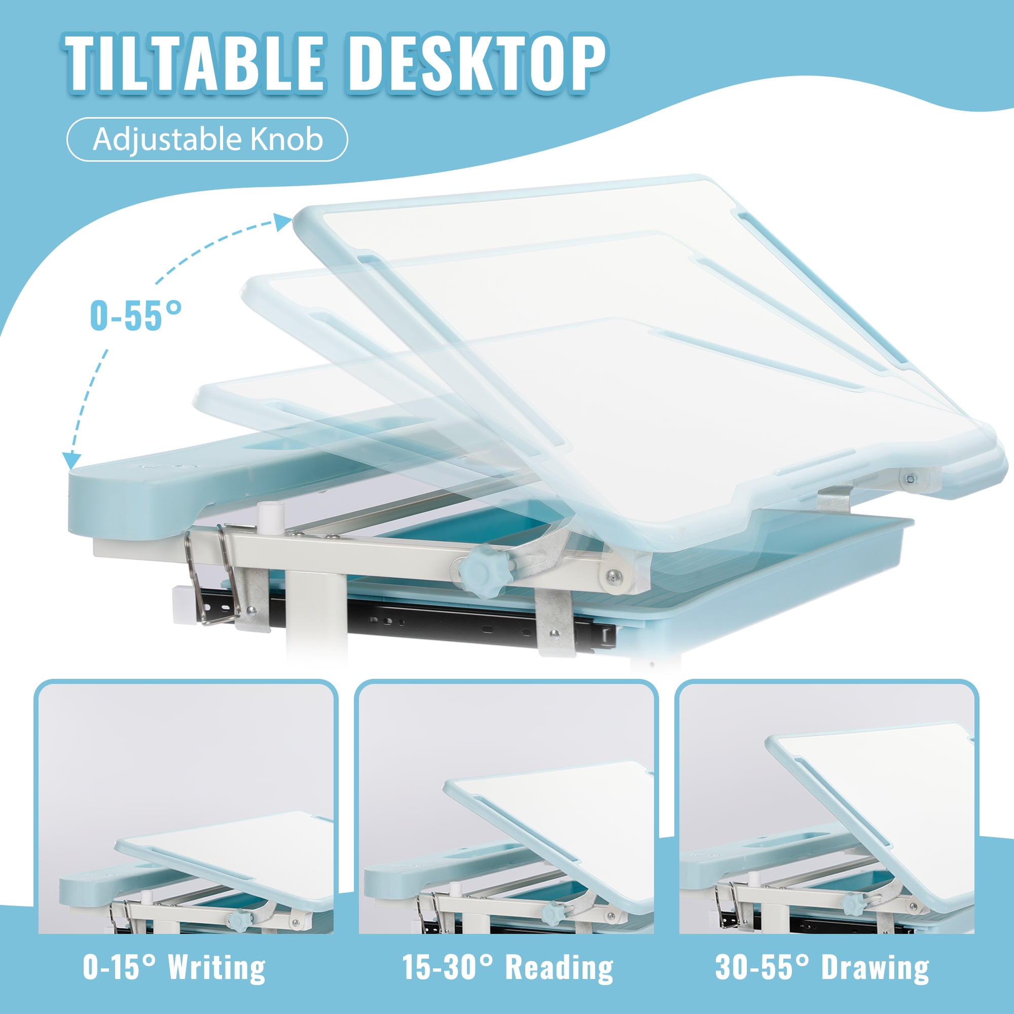 Kids Desk and Chair Set Height Adjustable School Study Desk and Chair with 55° Tiltable Desktop, 3 Modes&3 Brightness LED Lamps, Storage Drawer and Metal Hook for Boys Girls,Blue