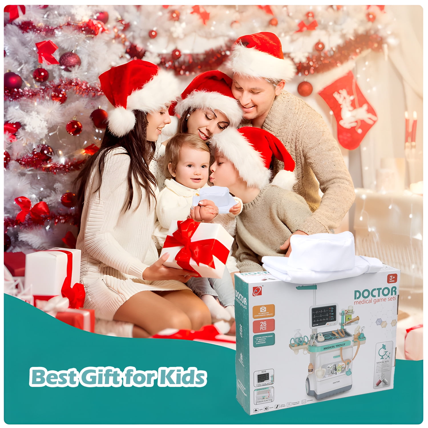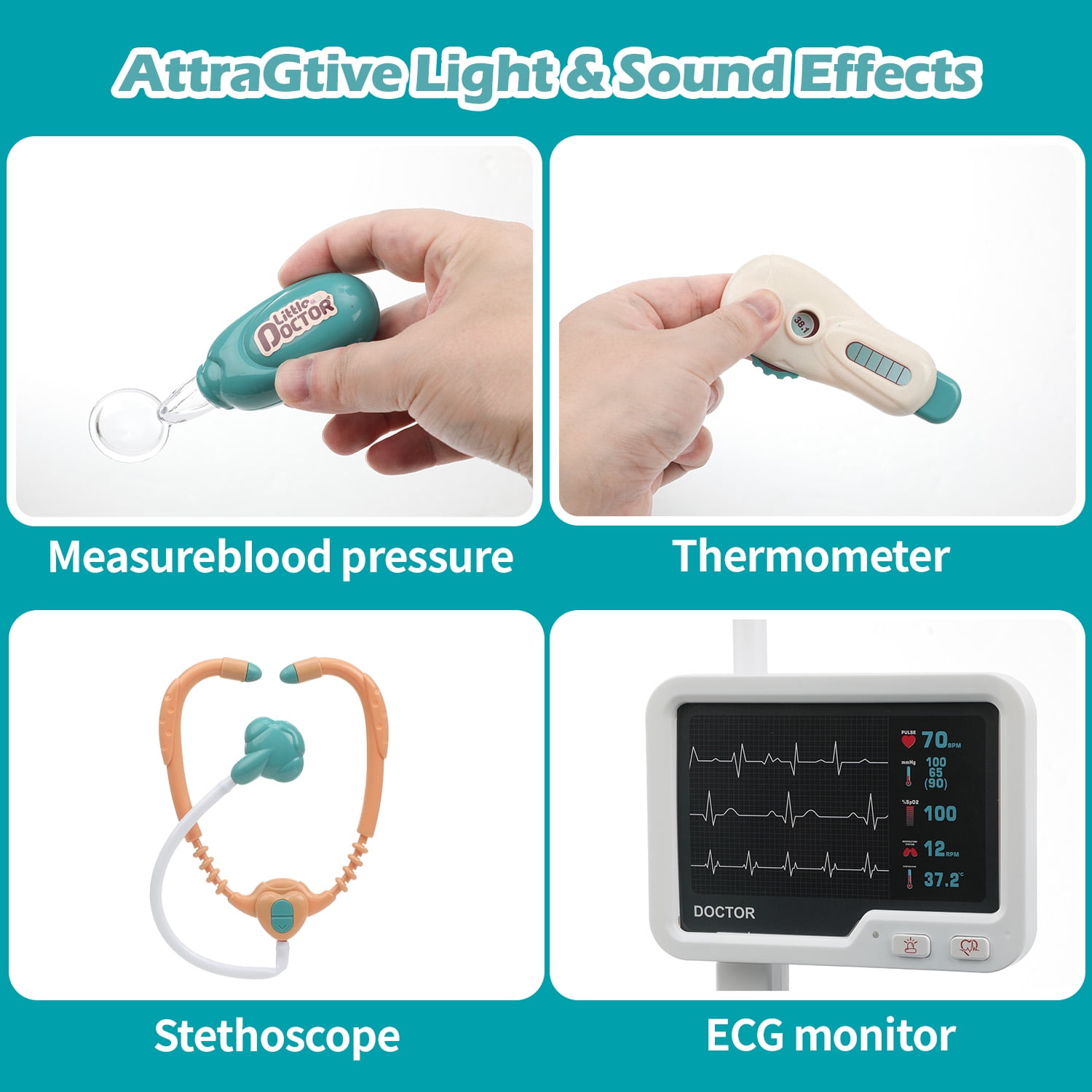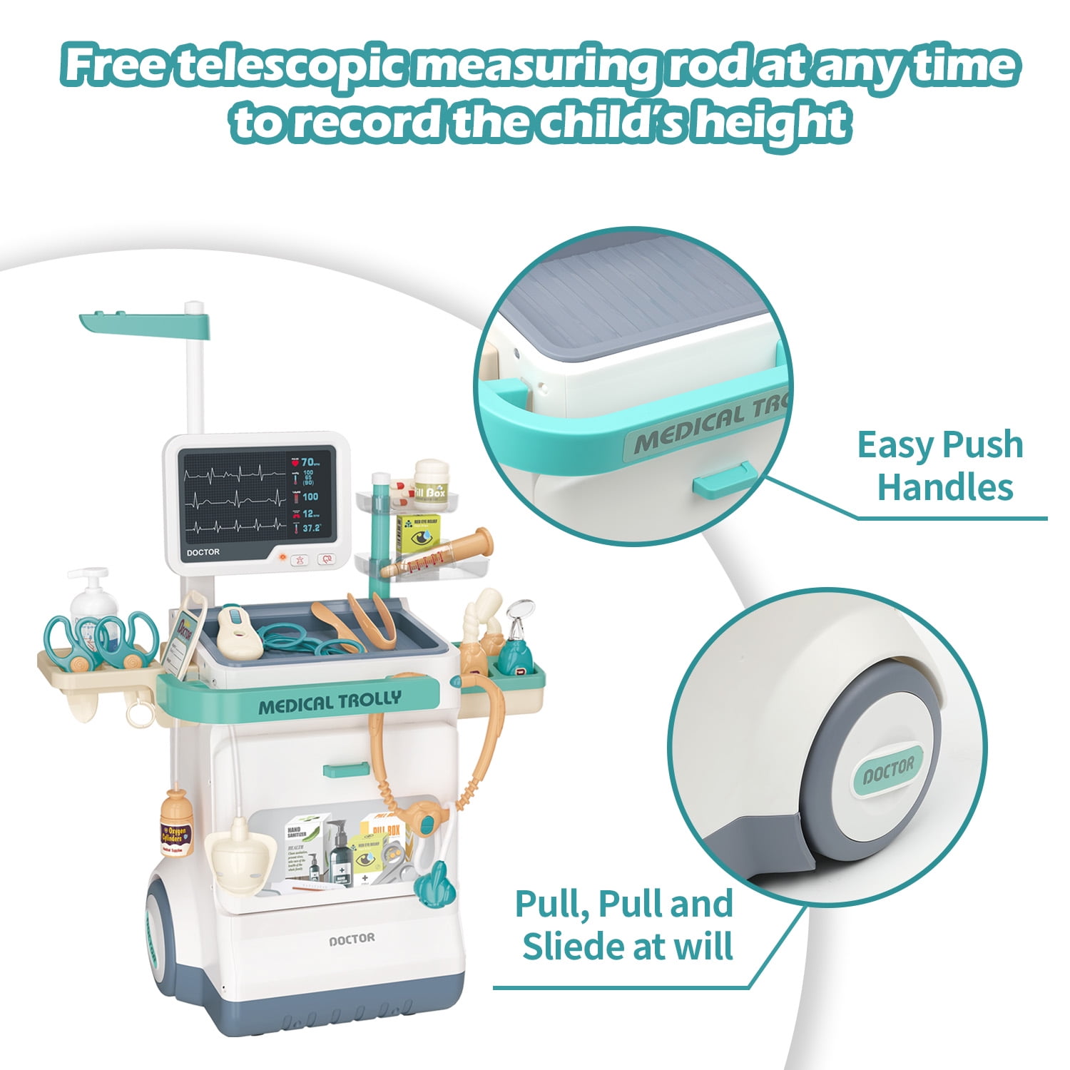 [28 pcs Doctor Play Set for Kids]: The pretend medical station set includes a stethoscope toy, oral mirror, thermometer, X-ray film, tweezers, scissors, syringe, eyeglasses, and more. And the doctor coat & hat offer children a realistic experience. [Multi-Purpose Doctor Cart]: Children can perform “medical check-ups” on family members or friends using the wheeled medical cart. It features a storage counter and an oversized locker for all accessories, helping kids develop good storage habits while learning about medical and health knowledge. [Fun and Educational]: This doctor kit can help reduce children’s fear of visiting the doctor or dentist by familiarizing them with medical tools. It stimulates creativity and imagination and enhances hand-eye coordination. [Safe and High Quality]: Made of high-quality, non-toxic ABS material, this doctor role play toys is BPA-free with smooth, round edges. The upgraded anti-slip wheels provide stability for kids to push around safely. [Perfect Gift for Kids]: Recommended for children ages 3-8, this doctor station set allows kids to imitate doctors and treat patients. It’s perfect for parties, pretend play, role play, school classrooms, and as a holiday or birthday gift.