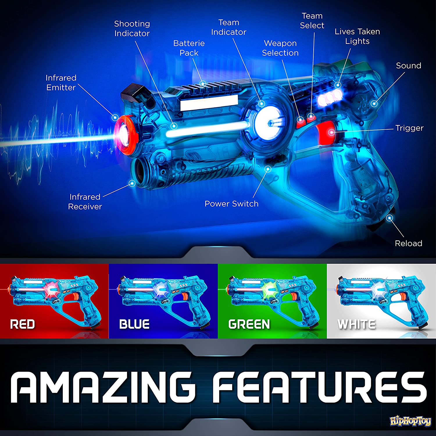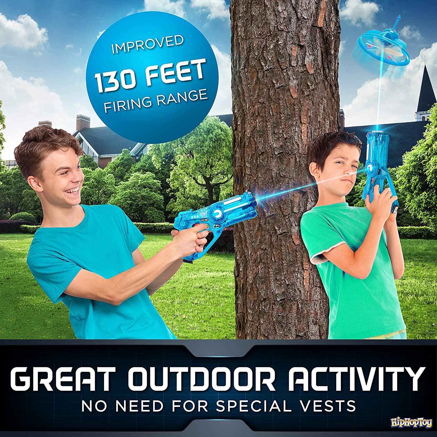 You may usually be hearing words like Handsup! or Fire in the hole! , chased each other around the house and yard for hours tagging each other. It is very likely that they are playing a real shooting gun game. However, there is a chance for kids to have the tag game experience in real life, They will have a laser battle with laser tag gun games! With a range of up to 130ft, you can play indoors and outdoors! When playing laser gun set with friends or family in the backyard, running through the house. It’s easy to figure out how to use it. Things like team selection on vest and gun, shooting sound selections, optional led light for night play, and reloading action. You can play with friends who are younger or older for hours of fun! Also, pull you quickly love to get down in the tag game with your kids. There are four team colors: blue, red, white, and green. You can play as individual players or set the laser guns up to be teams. There are also four bullet types: pistol (on hit), shotgun (two hits), machine gun (two hits) or rocket launcher (3 hits). The laser tag with the vest light up and vibrate and make a noise. It will have so much fun taking laser tag set to the big playground and running around shooting each other. These laser tag sets with guns are certified safe for boys. Children’s safety is our first priority, we adopt less than 1mW (0.9mW) infrared signal. It does not emit actual laser beams. The Later tag gun set is a physical sports activity, but it does not use physical projectiles and is thus painless. Parents do not need to worry about kids getting hurt in laser games.