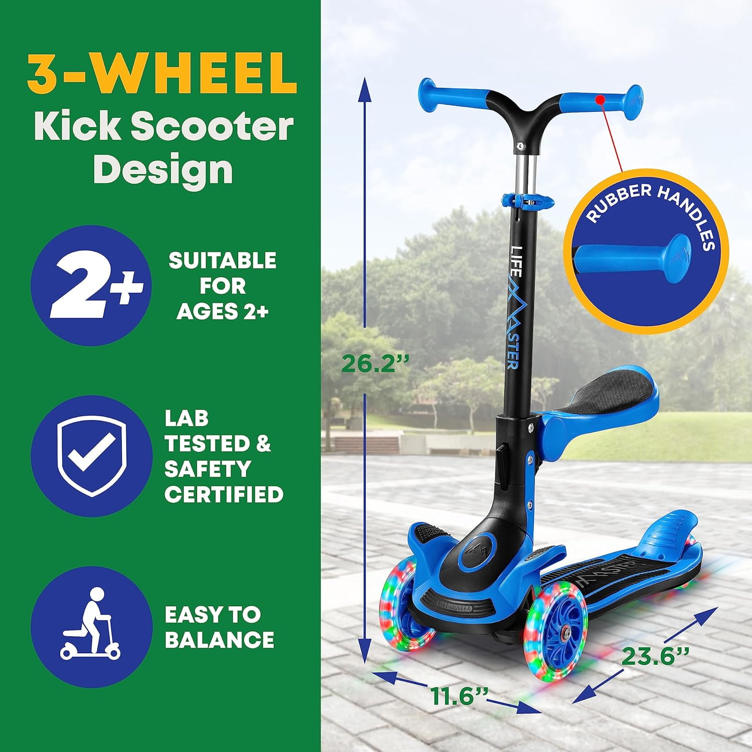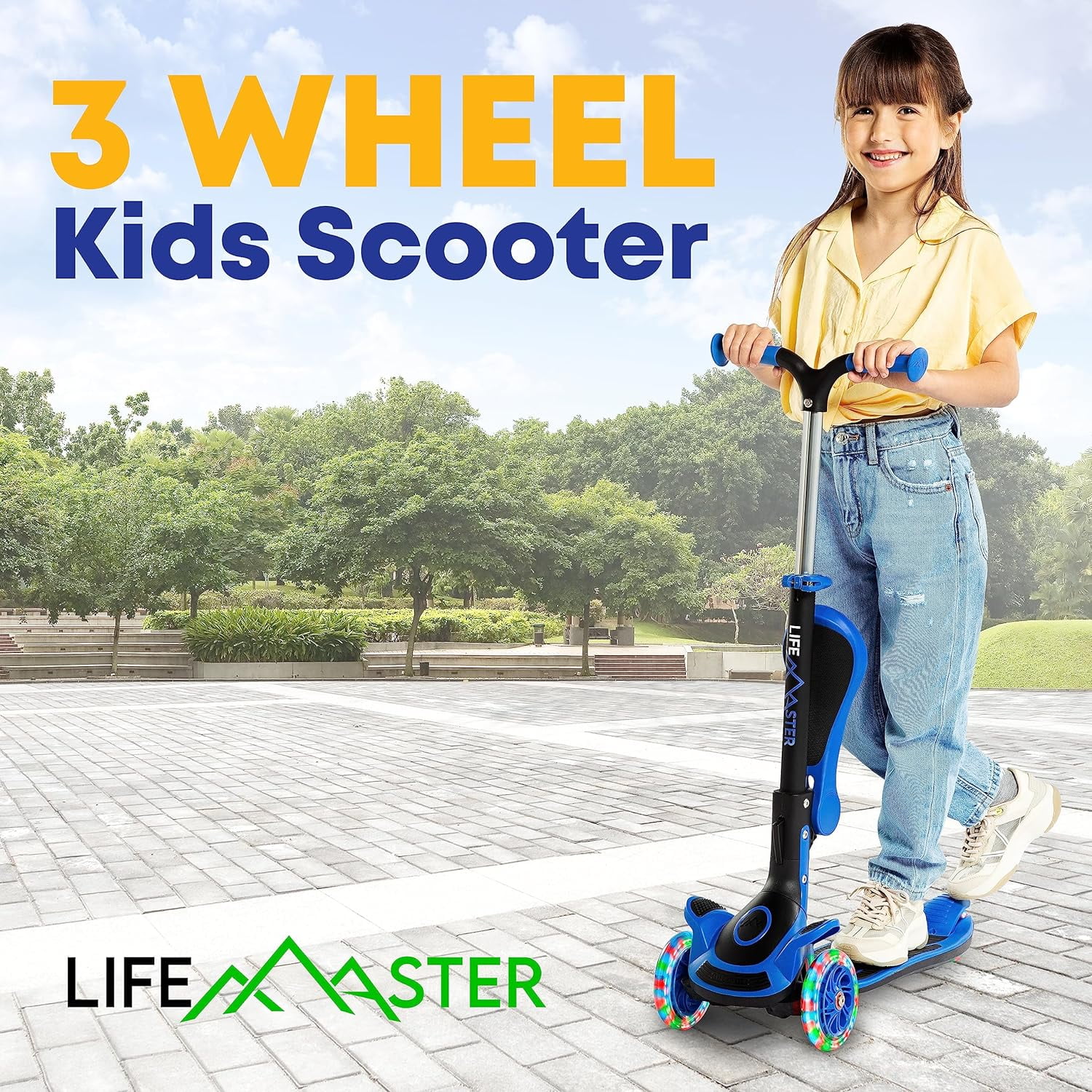 Kids Scooter – Foldable Seat – LED Wheel Lights Illuminate When Rolling – Children and Toddler 3 Wheel Kick Scooter – Adjustable Handlebar – Indoor and Outdoor- Blue – by Lifemaster