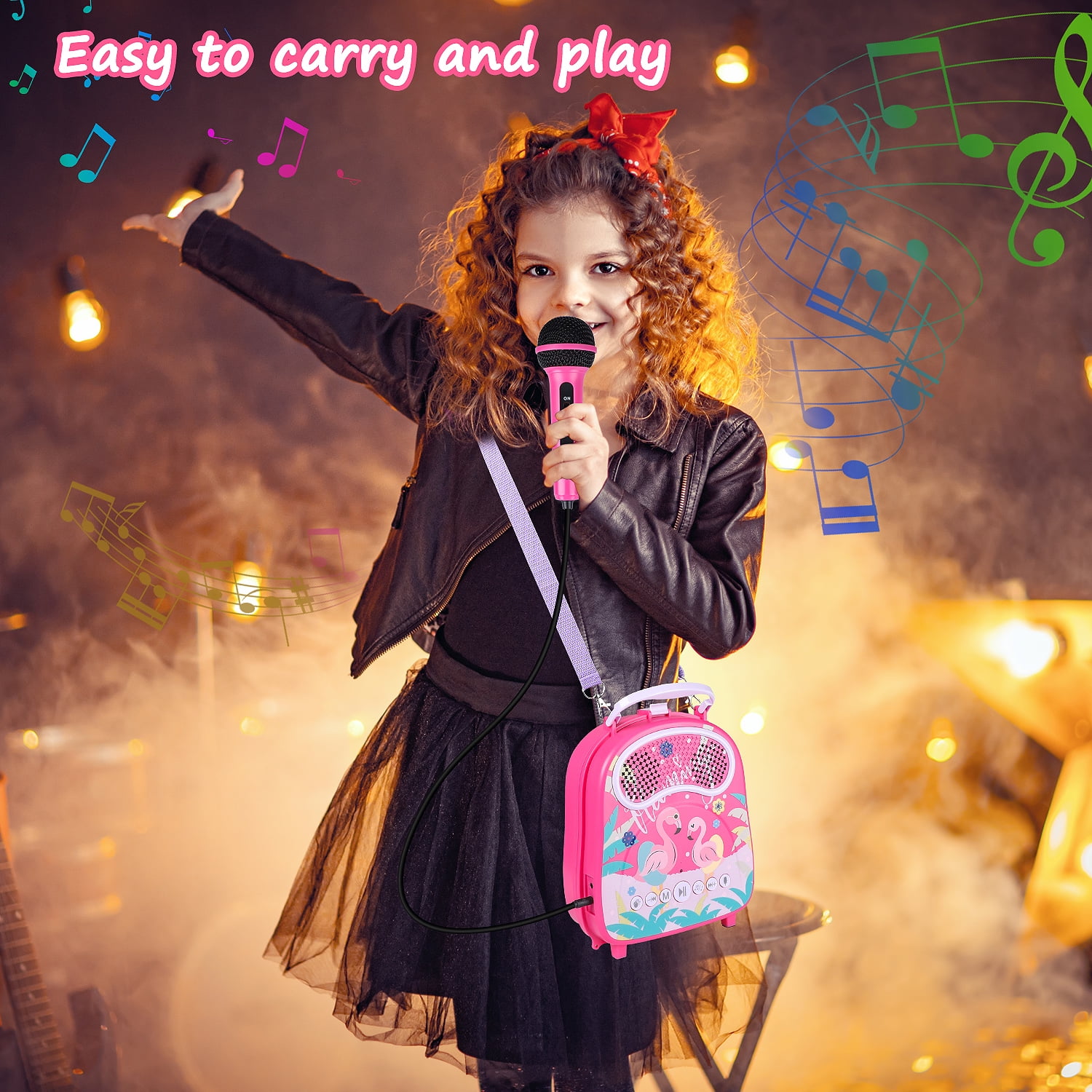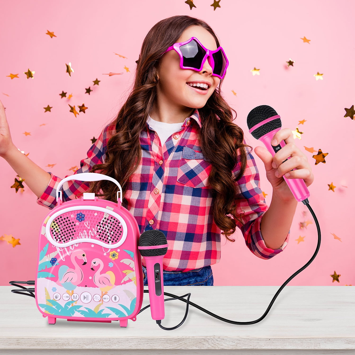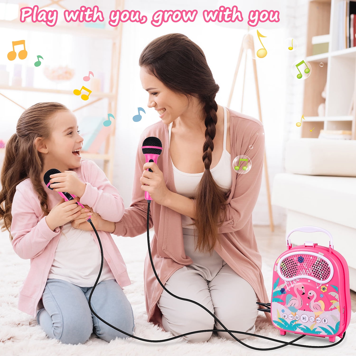 KIHOOBANG 3-12 Years Toy Musical Instruments Kids karaoke machine designed for children aged 3 to 12 years, featuring two microphones and multiple connection modes for easy music playback and singing Smooth design without edges or corners; all parts have passed strict quality tests and received 100% safety certification, ensuring safe play for children Includes features like voice changer, applause, accompaniment, and acoustic singers, making children’s gatherings more entertaining with easy-to-use button functions Equipped with rechargeable batteries that last over 3 hours when fully charged; however, it’s recommended that children take breaks during playtime Connect the karaoke machine via the aux jack, Bluetooth, or through MP3 mode, USB drive, or micro SD card for versatile music options