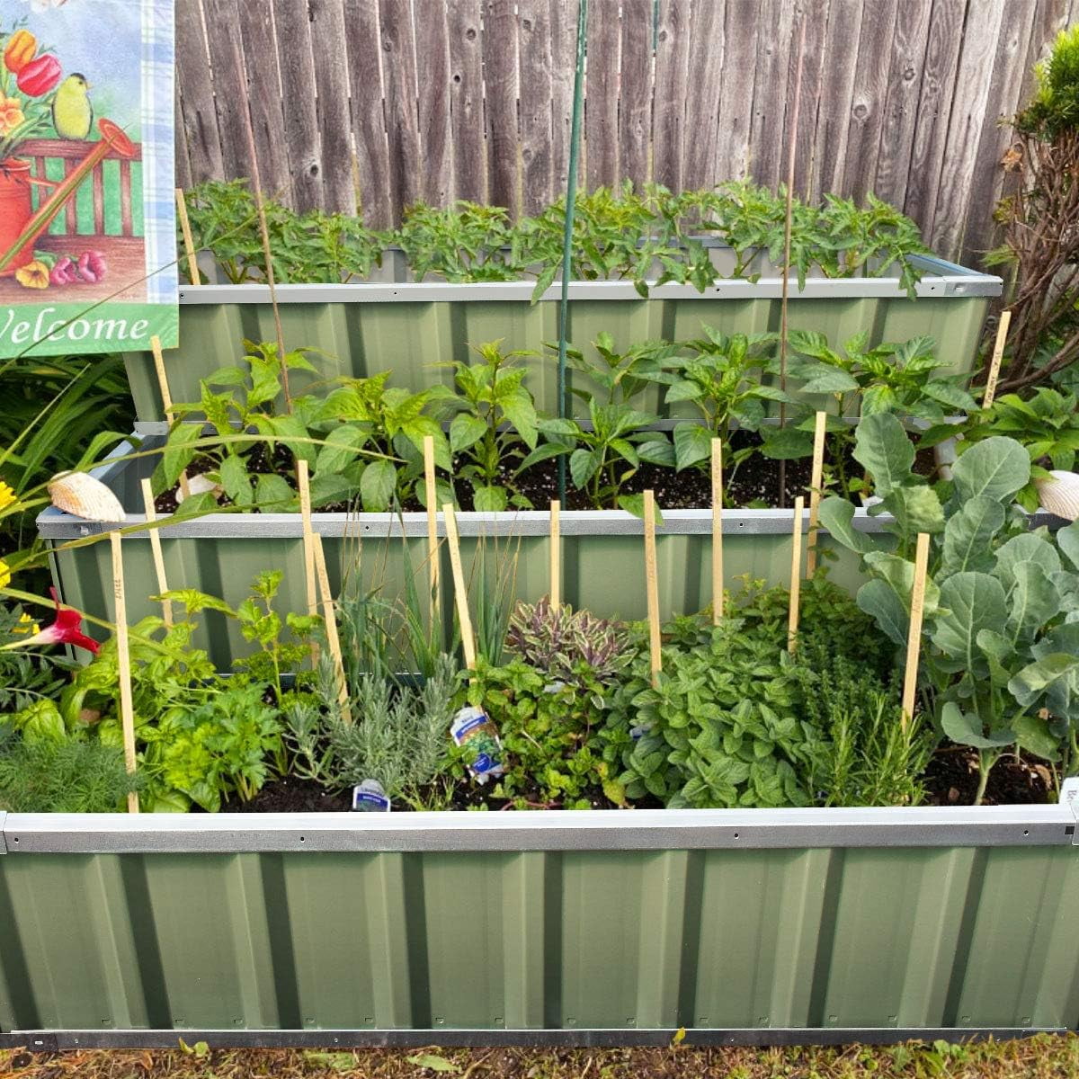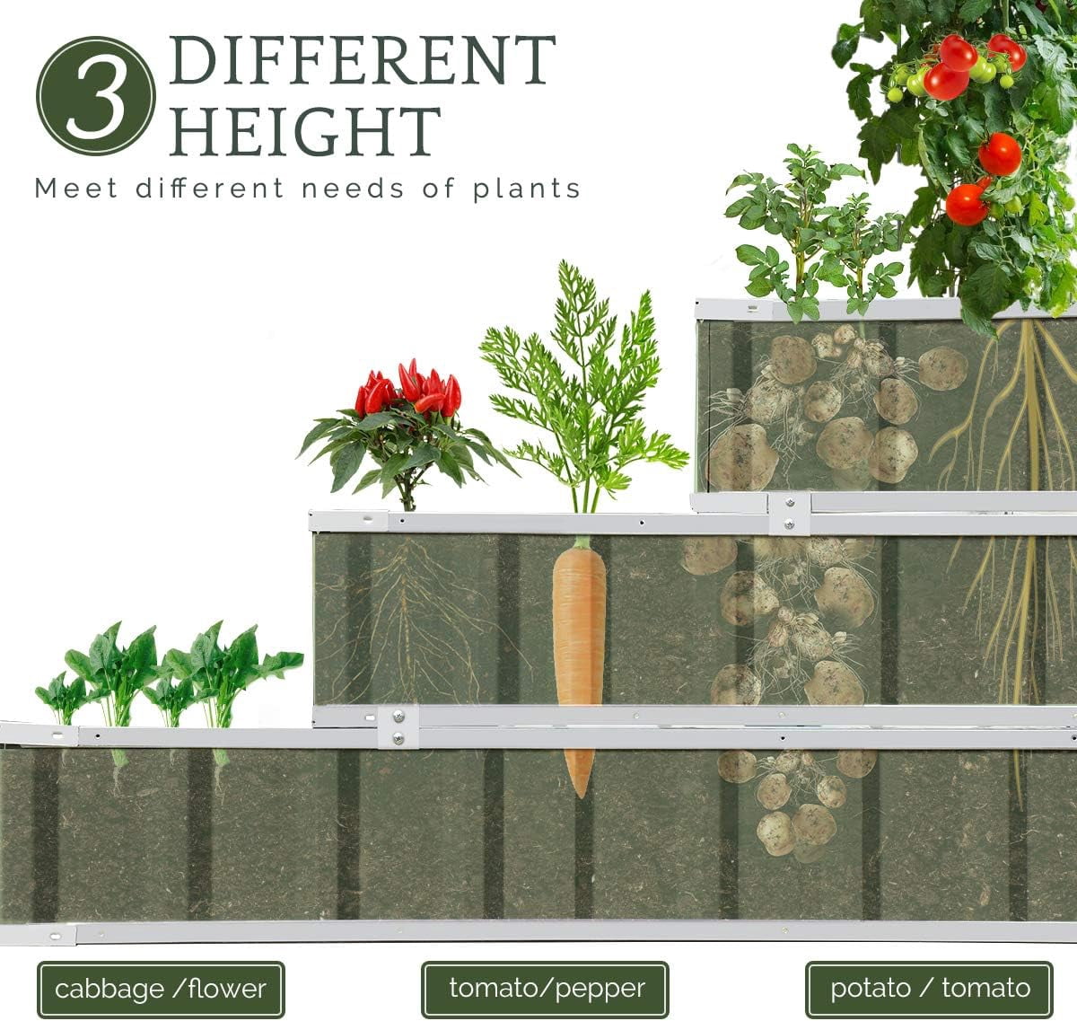 Use it as 3 Individual Raised Bed: Each tier is connected by the fastener connectors, and you can take the connectors down to make the whole raised garden bed into 3 individual garden beds and get more cultivated area. Or used as 3 tiers raised bed to plant 3 different plants. Capacity: 21 Cu Ft. Dimension: 46″ x 46″ x 23.6″. THREE YEARS WARRANTY: The most wonderful design of our KING BIRD planter box outdoor is not only about the convenient and fast installation without tools but also for its smart design to increase the loading ability and capacity vastly. THREE YEARS WARRANTY for the whole raised bed. Multilayer Galvanized Paint: Upgraded multilayer galvanized paint efficiently prevents rust and continues to be beautiful; also never worry about rain damage to the wood garden box; galvanized steel garden bed provides a lasting use and no discoloration. No painting inside, and no worries about the damage to plants. Vertical Stripe Updated Design: We combine the vertical stripe and the cardholder design to improve the raised garden planter’s ability to bear the soil and make the raised bed more textured and beautiful. This can prolong the service time of the raised bed. 16pcs T-type Tags & 2 Gloves as Gift: 2 pairs of gloves provided to give you more convenience in installing garden boxes and comfort when working in the garden. 16pcs T-type Tags to help you record the growth process of flowers and vegetables.