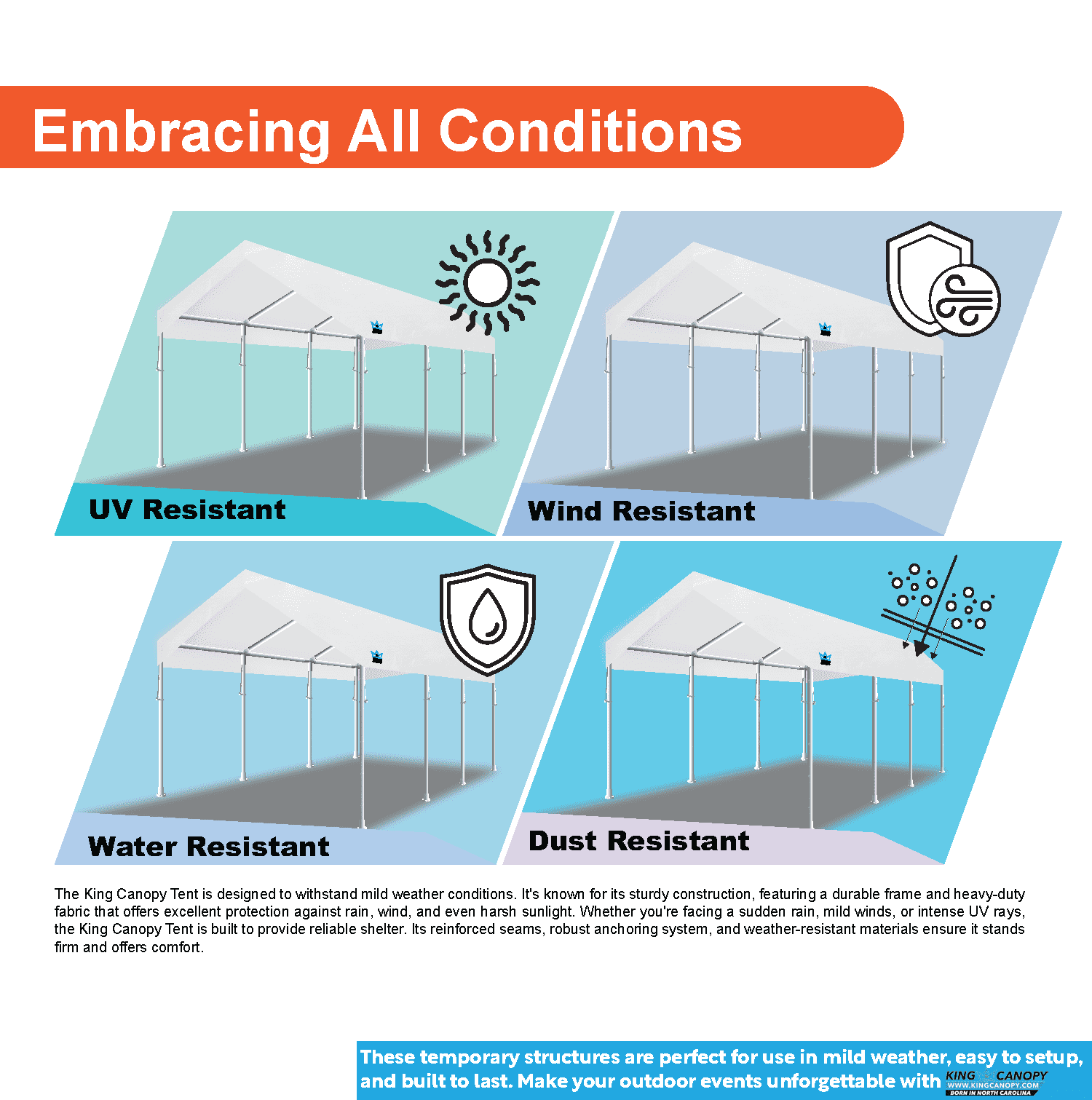 Dimensions: 10ft wide x 20ft long x 6ft 8in side height x 9ft 5in center peak height. Frame and Cover : Frame is made of 2” diameter powder-coated steel, 8-legs, 180G PE cover. This can help protect your vehicle from some outdoor conditions such as sun, rain, and wind. Multi Purpose: It can be used for any purpose you want. Ideal uses are portable carport, boat shelter, storage shelter, party tent, ETC. Set Up: The tool free frame makes its set-up super quick and easy. Easy to follow, step-by-step instructions are included. Warranty: All of our canopy components feature a 1-year limited warranty and are warranted to be free from defects in material and workmanship during this time frame.