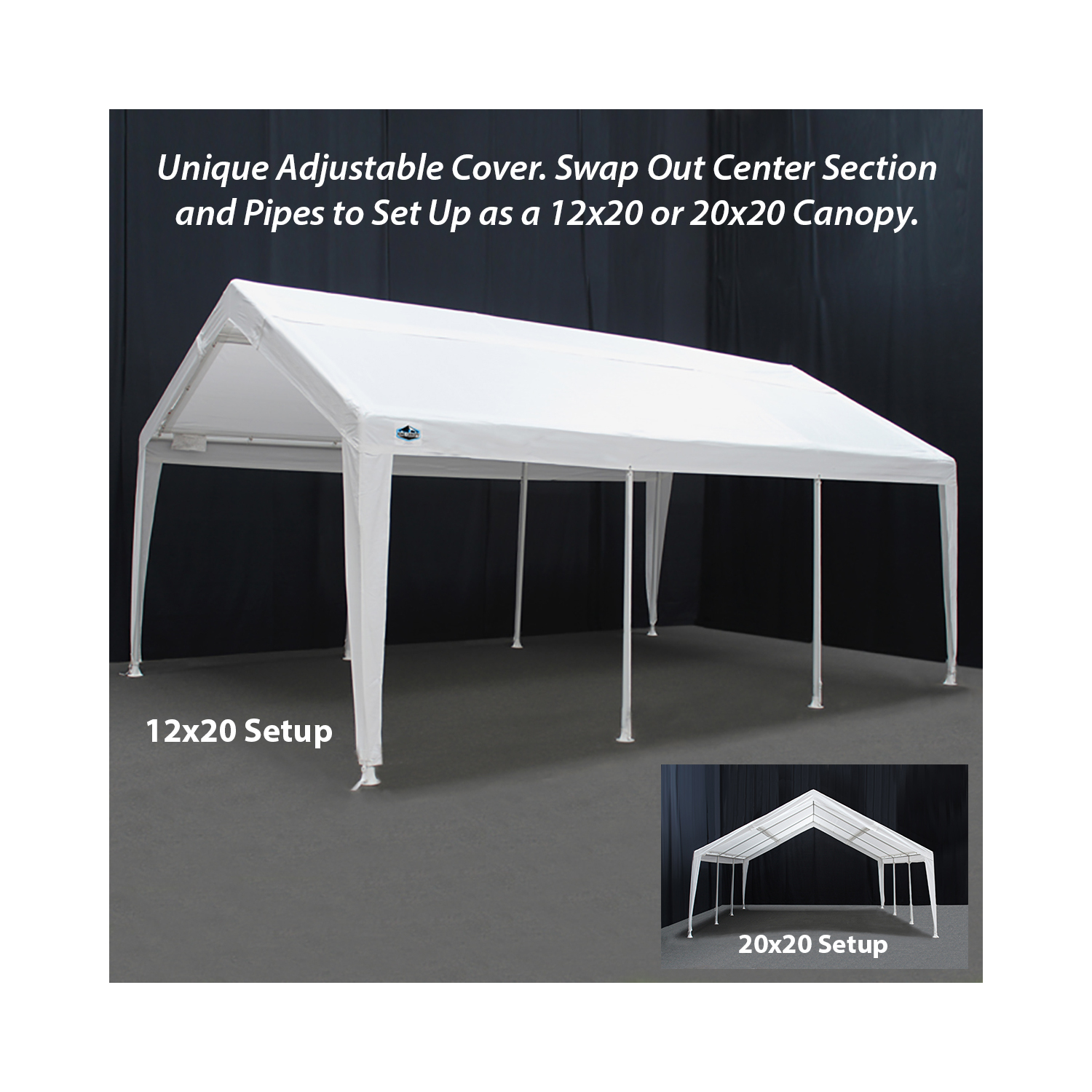 The cover is the perfect accessory for the EX1220 King Canopy. This cover is for the expandable unit and fits the 12 ft. x 20 ft. and the 20 ft. x 20 ft. The piece to expand to the 20 ft. x 20 ft. is included and zippers in to the sides. This has white leg covers to make your canopy fancy. Great for replacing old and worn covers. Frame and walls not included.