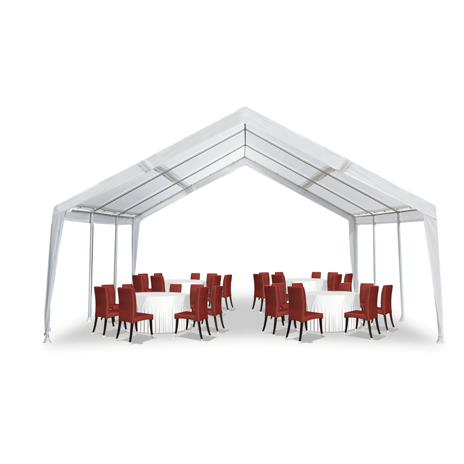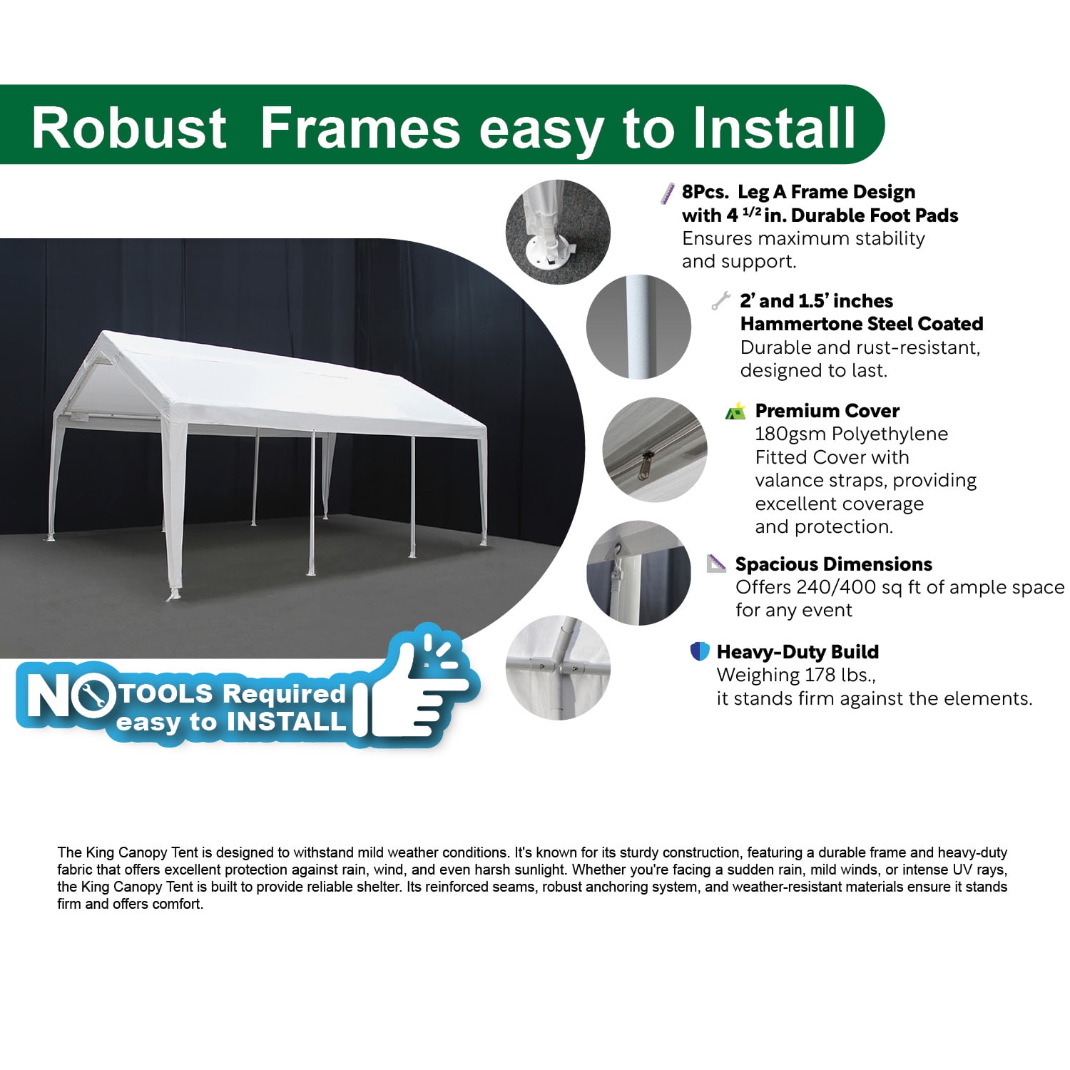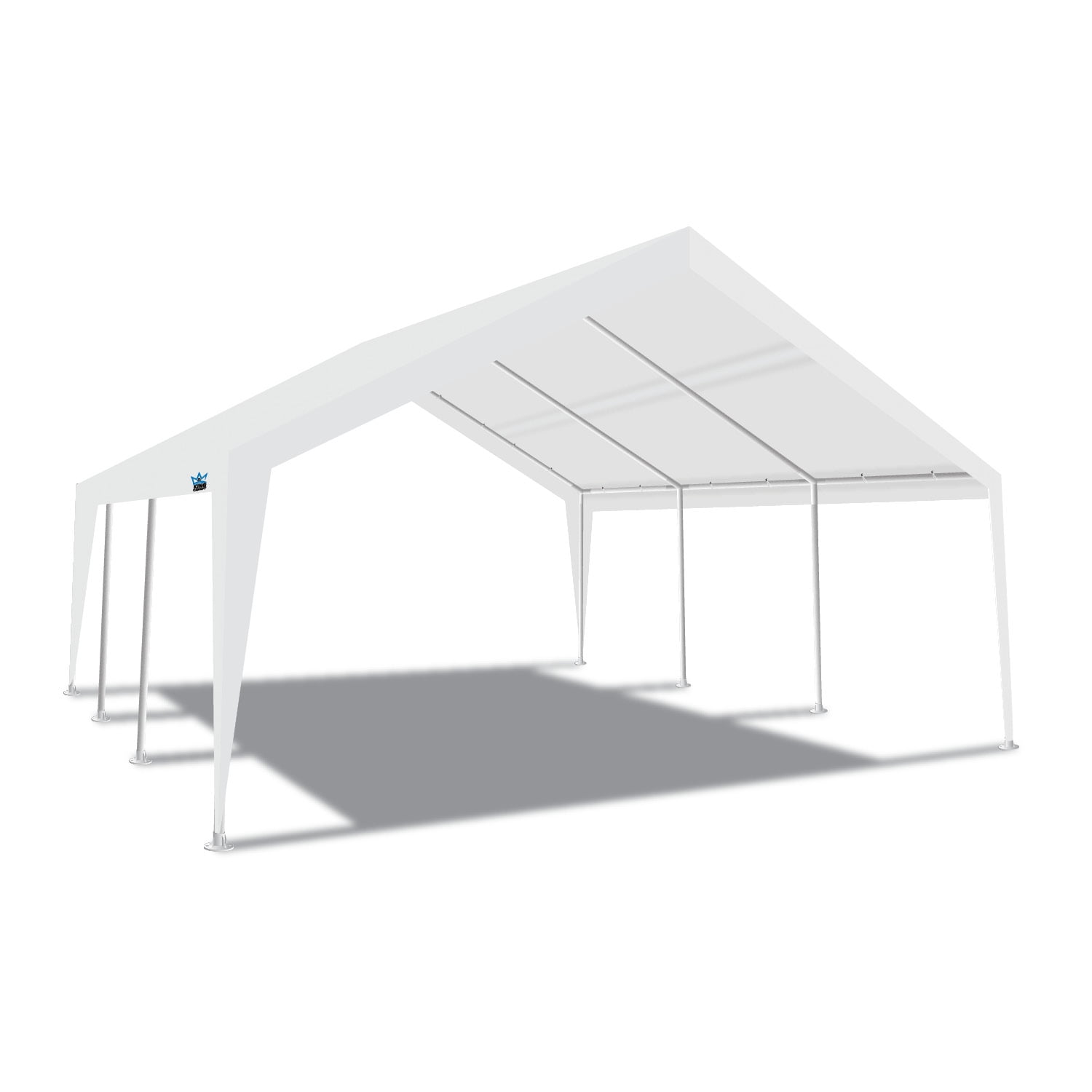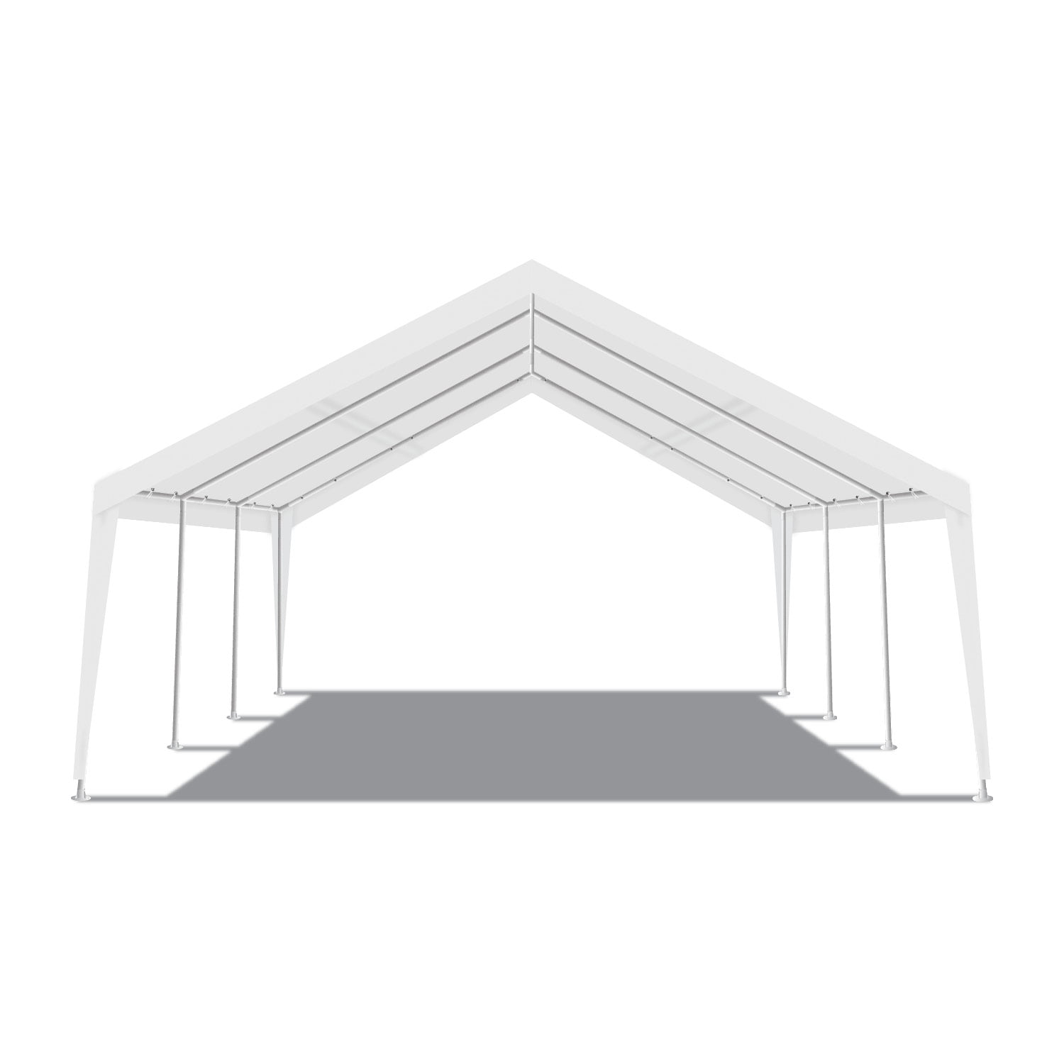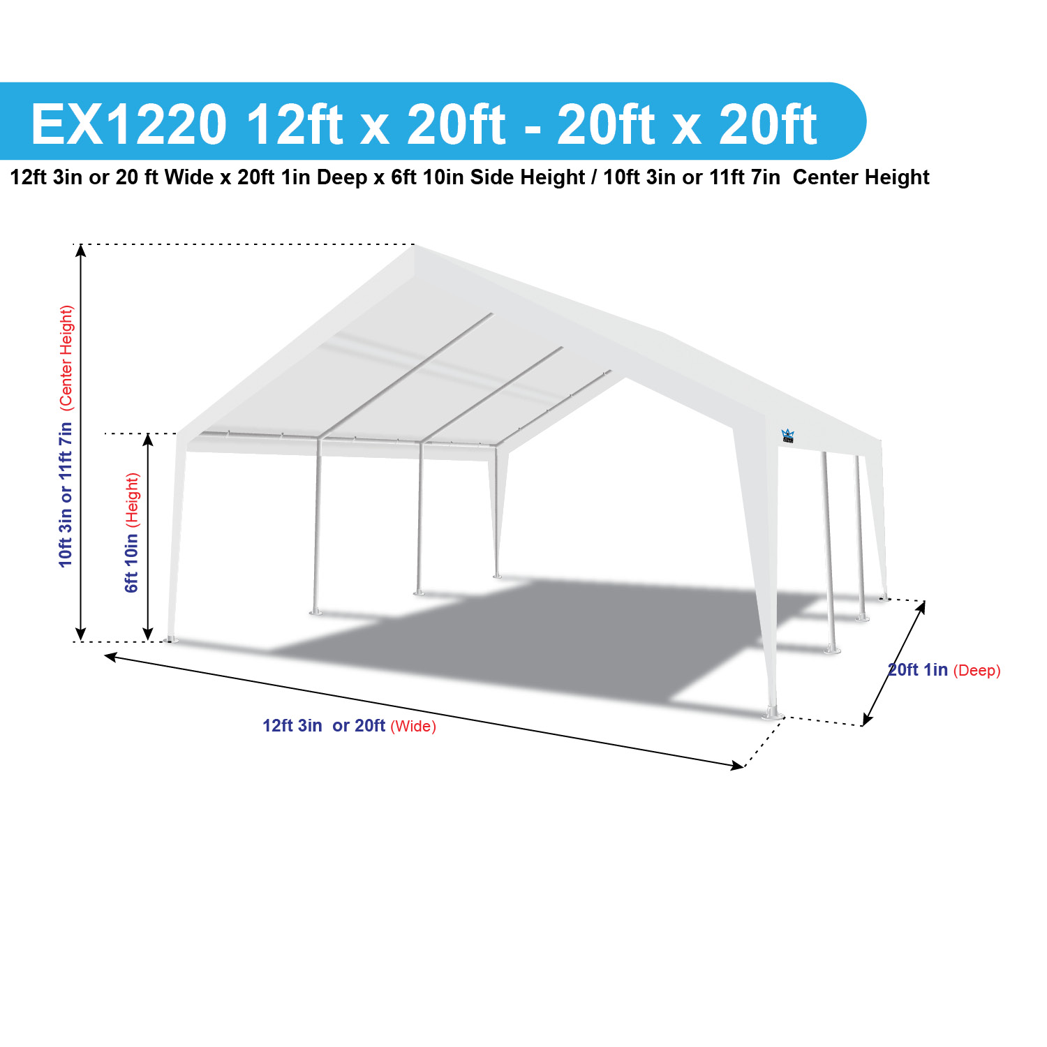 Dimensions: 12ft wide or 20ft wide x 20ft 1in long with a side height of 6ft 8in and a center peak height of 11ft 7in. Frame, Cover: Frame is made of 2in and 1.5in diameter powder-coated steel, 8-legs, 180G PE cover This can help protect your vehicle from some outdoor conditions such as sun, rain, and wind. Multi-Purpose: It can be used for any purpose you want. Ideal uses are portable carport, boat shelter, storage shelter, party tent, ETC. Set Up: The tool free frame makes its set-up super quick and easy. Easy to follow, step-by-step instructions are included. Warranty: All our canopy components feature a 1-year limited warranty and are warranted to be free from defects in material and workmanship during this time frame. Damages from improper anchoring, strong winds, snow, ice, or rain are not considered defects. Nor does it apply to damage directly related to abuse or neglect whether accidental or deliberate.